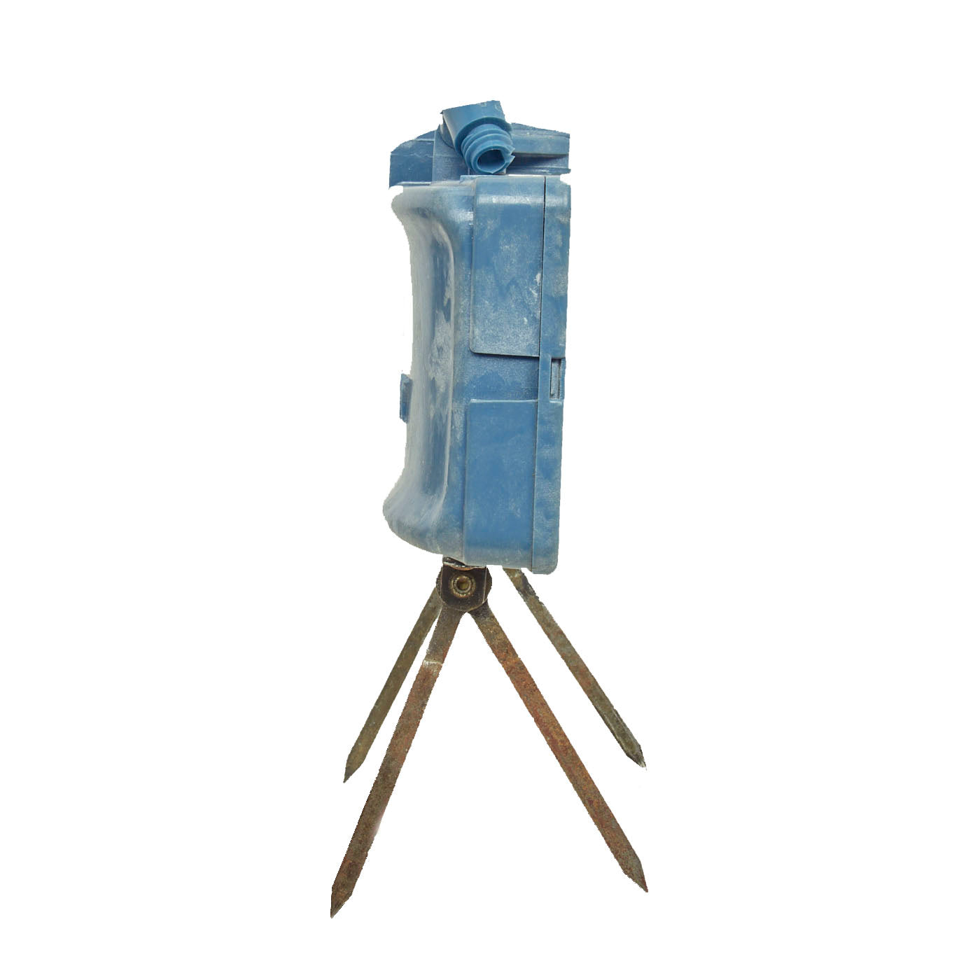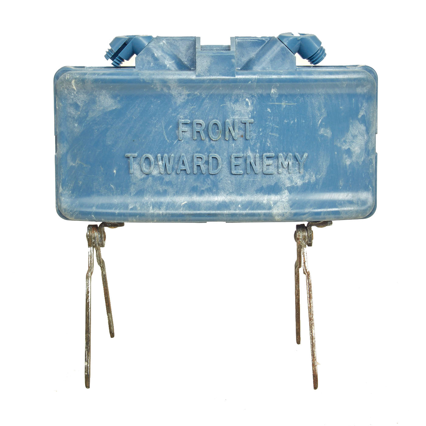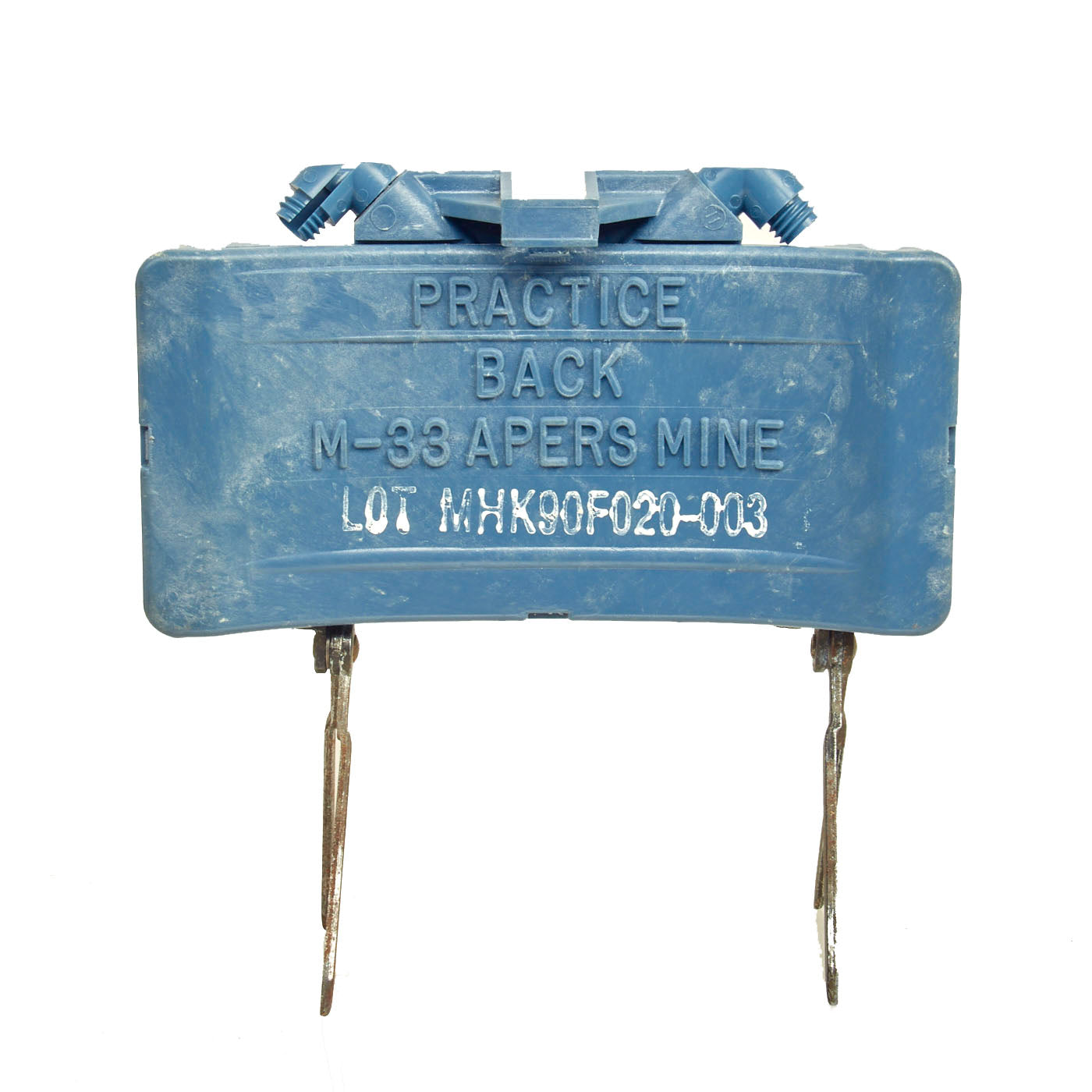 This example is very nice, and has the look of a well-used piece of equipment. The mine itself is cast in blue plastic. It still retains the original fold out support legs as well as the wire connectors. There are some cracks and chipping on the body of the inert mine most likely from being dropped.