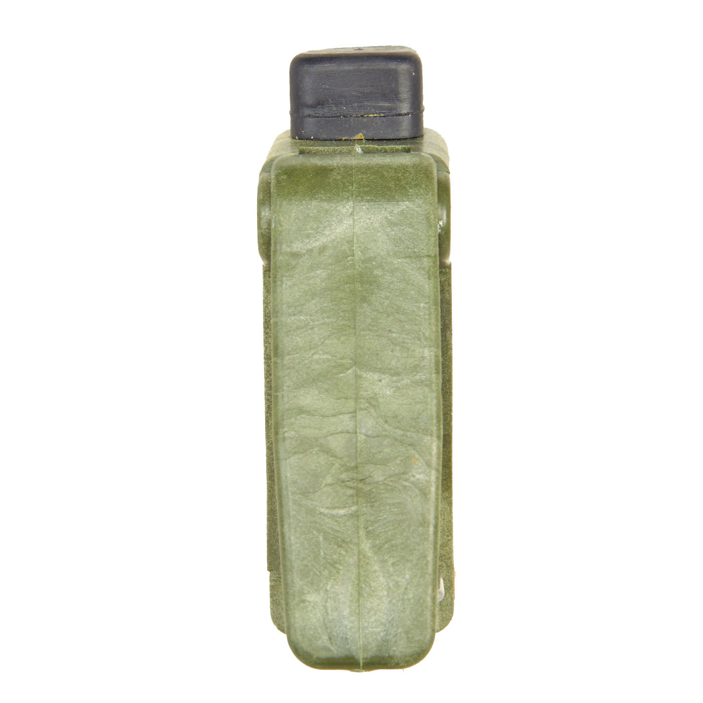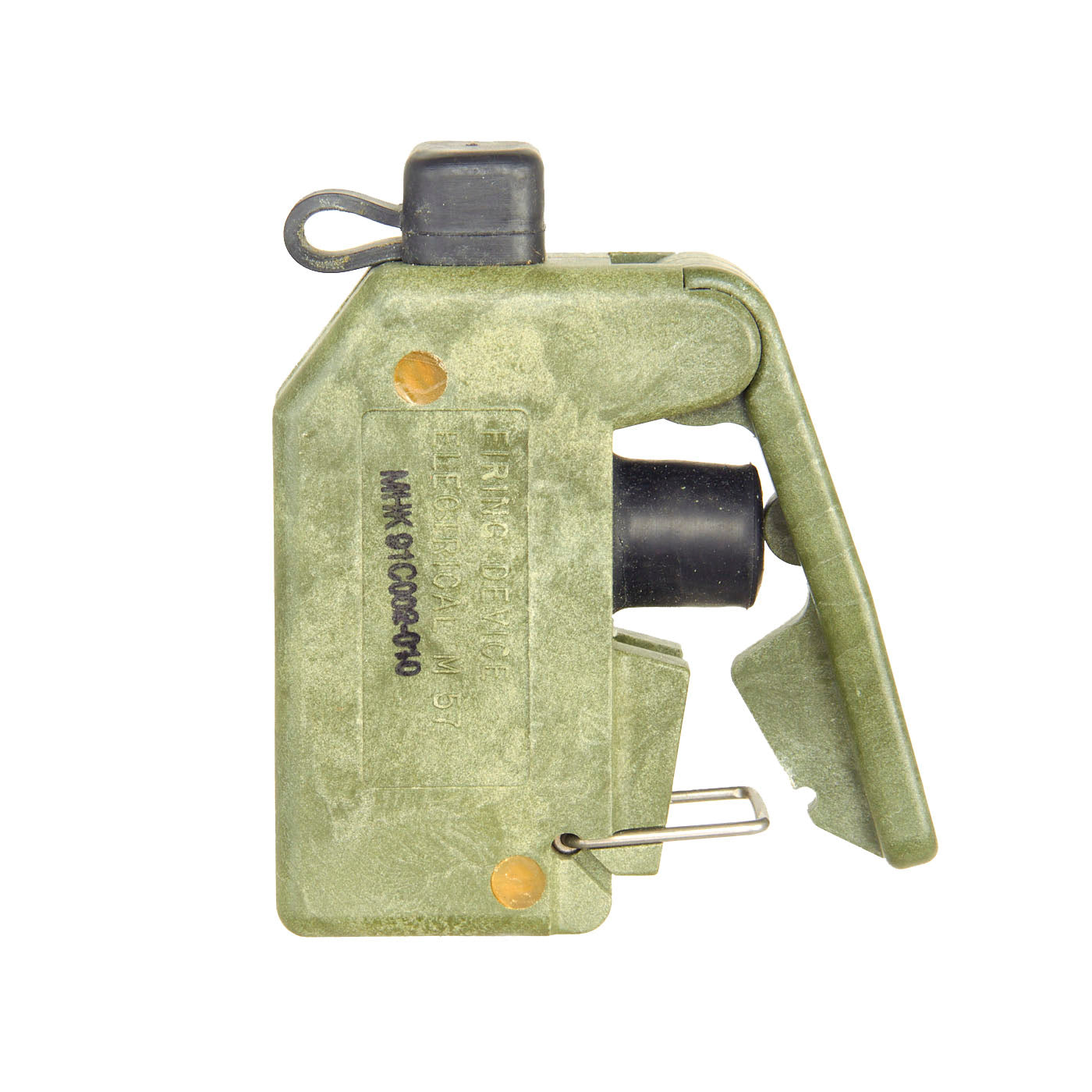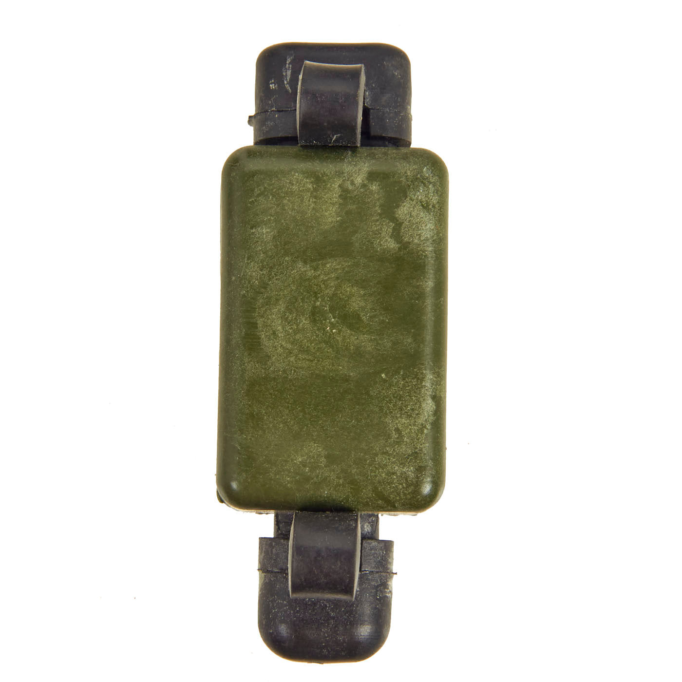 This example is very nice, and has the look of a well-used piece of equipment. The mine itself is cast in blue plastic. It still retains the original fold out support legs as well as the wire connectors. There are some cracks and chipping on the body of the inert mine most likely from being dropped.