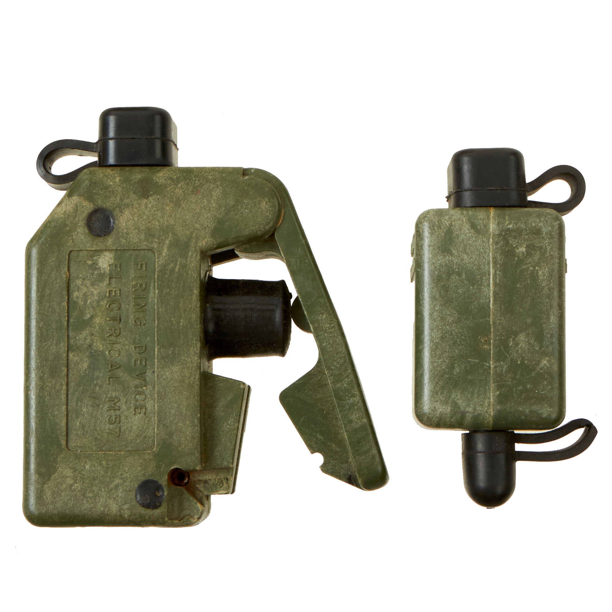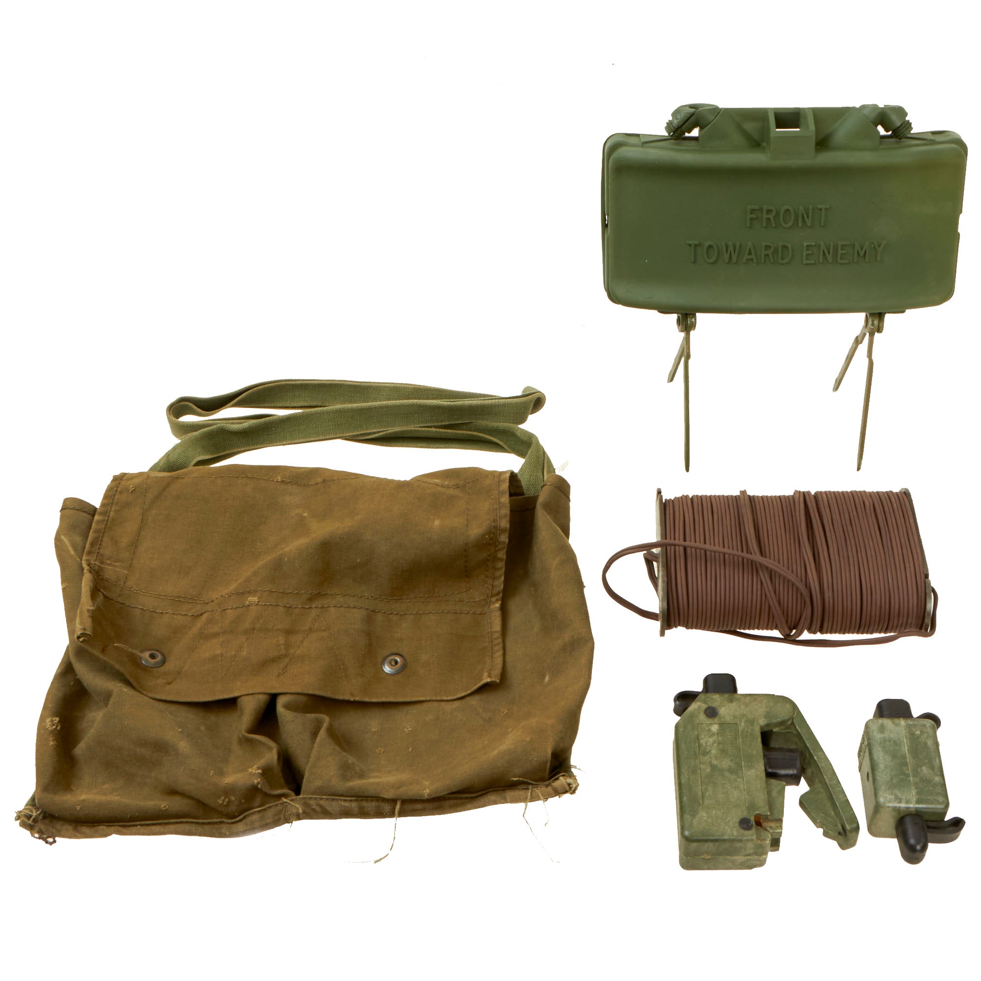 Original Items: One Set Only. The M68 kit was designed to familiarize personnel with the placement and arming of a real M18 Claymore directional mine. It comes with all the components of a real Claymore kit packed in an M7 bandoleer. The plastic M33 Inert AP Mine is the inert training and practice version of the M18 Claymore. Some inert mines were green with a light blue band, while others were completely blue. It does not contain an explosive or pyrotechnic filler of any kind. It is packed in a Claymore bag with inert M10 simulated detonator cap wire with connectors, a FIRING DEVICE ELECTRICAL M57 "clacker" firing control, and a TEST SET ELECTRICAL M40 circuit testing kit.