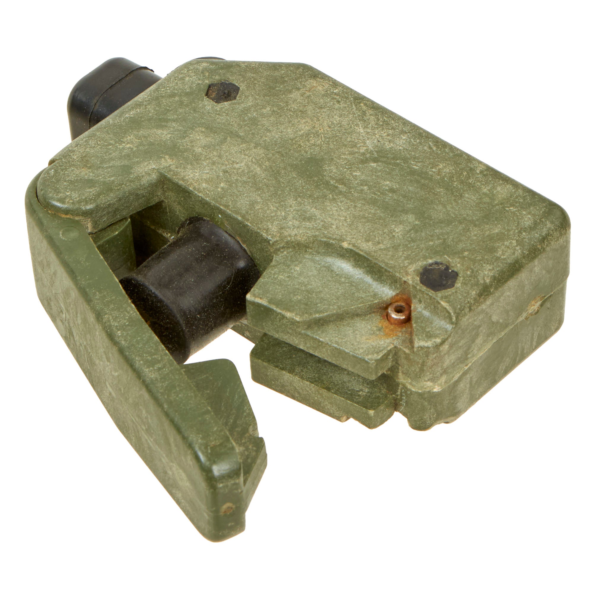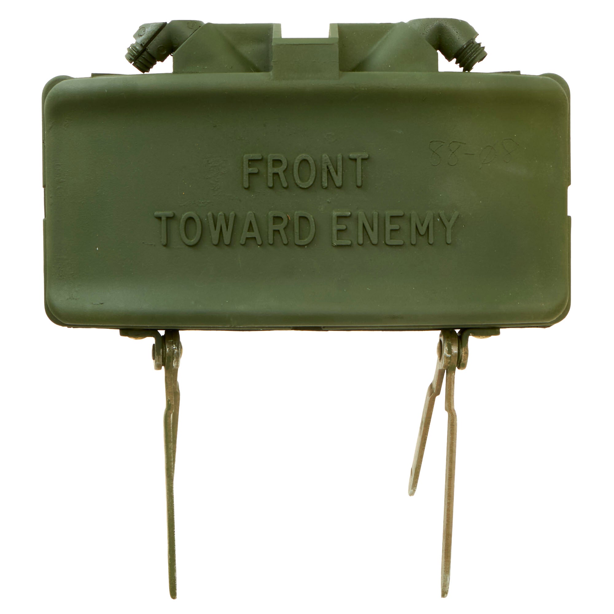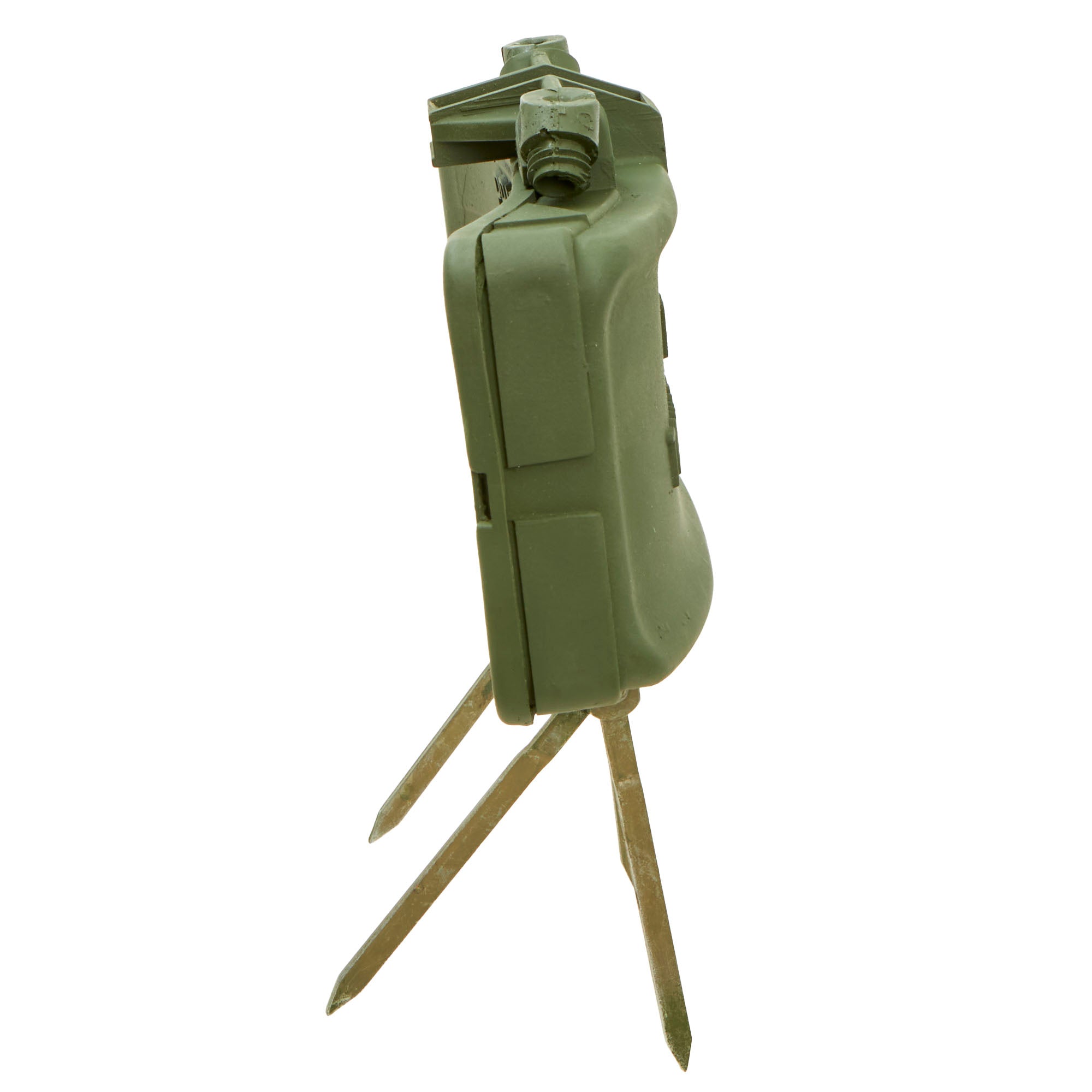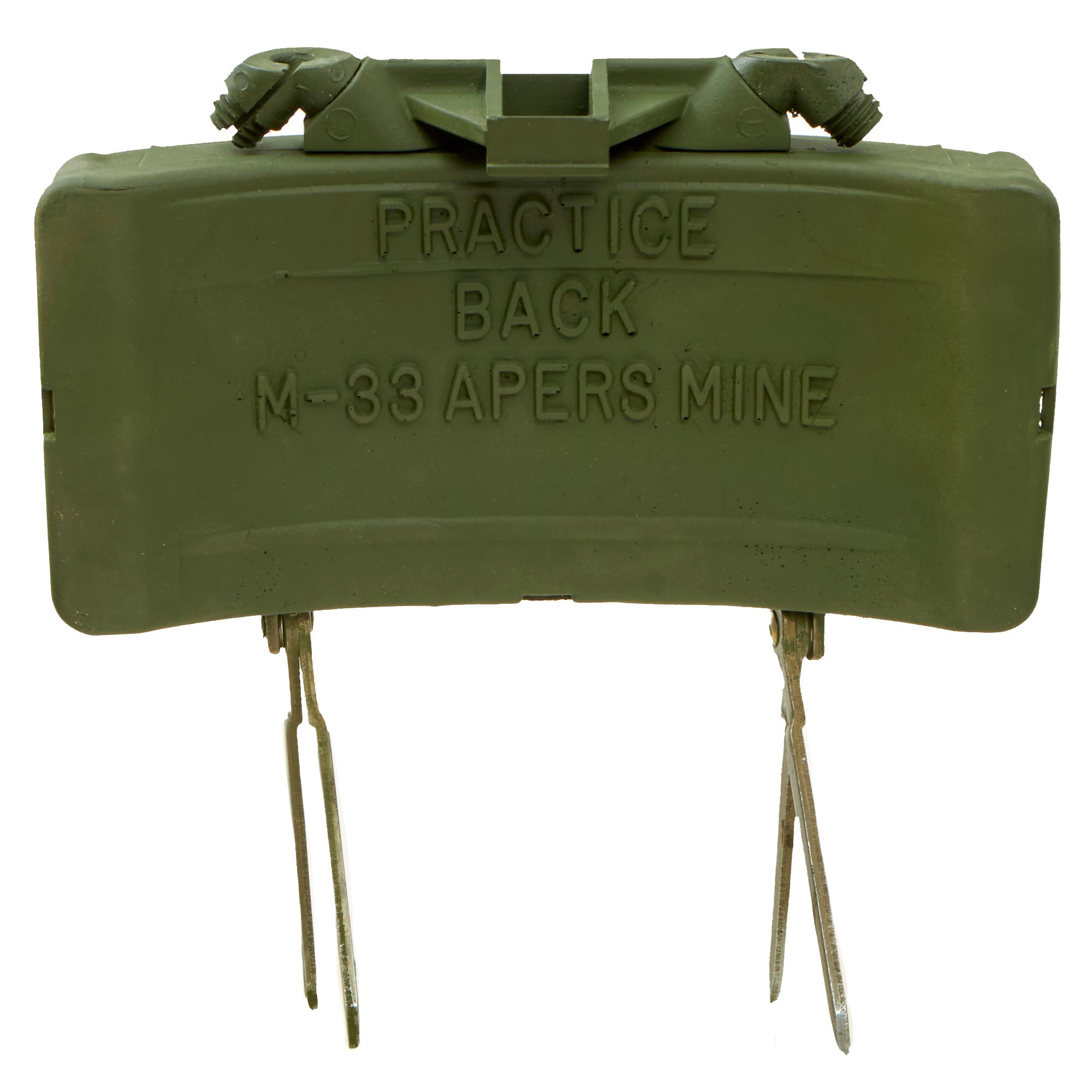 This example is very nice, and has the look of a well-used piece of equipment. The mine itself is cast in blue plastic, complete with internal shrapnel, some of which has broken loose. It was later repainted OD Green for display, but it is definitely marked PRACTICE / BACK / M-33 APERS MINE on the back. It still retains the original fold out support legs as well as the wire connectors. There are some cracks and chipping on the body of the inert mine most likely from being dropped.