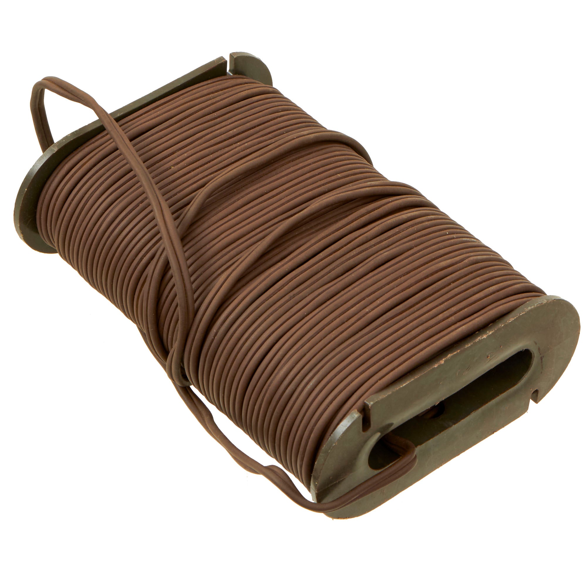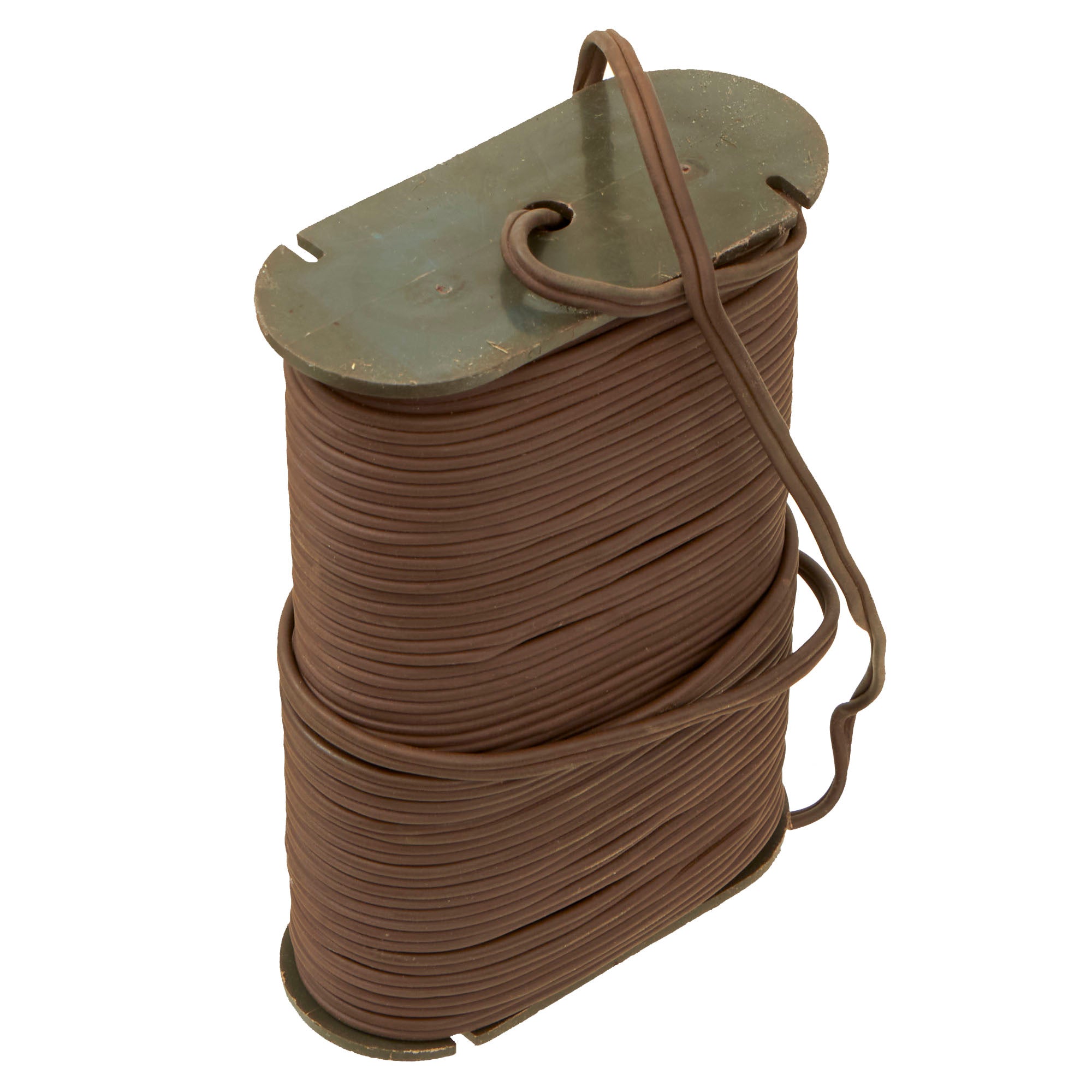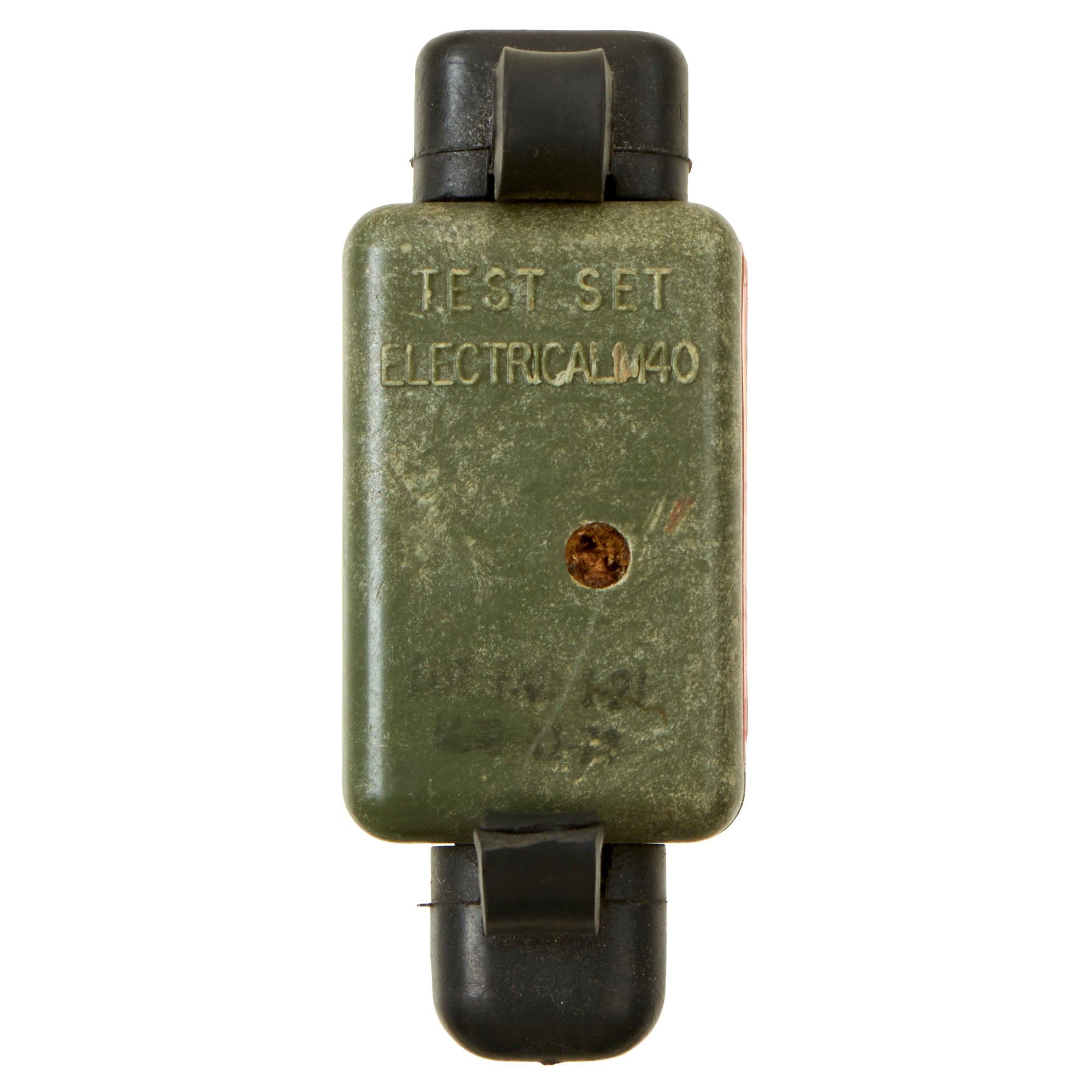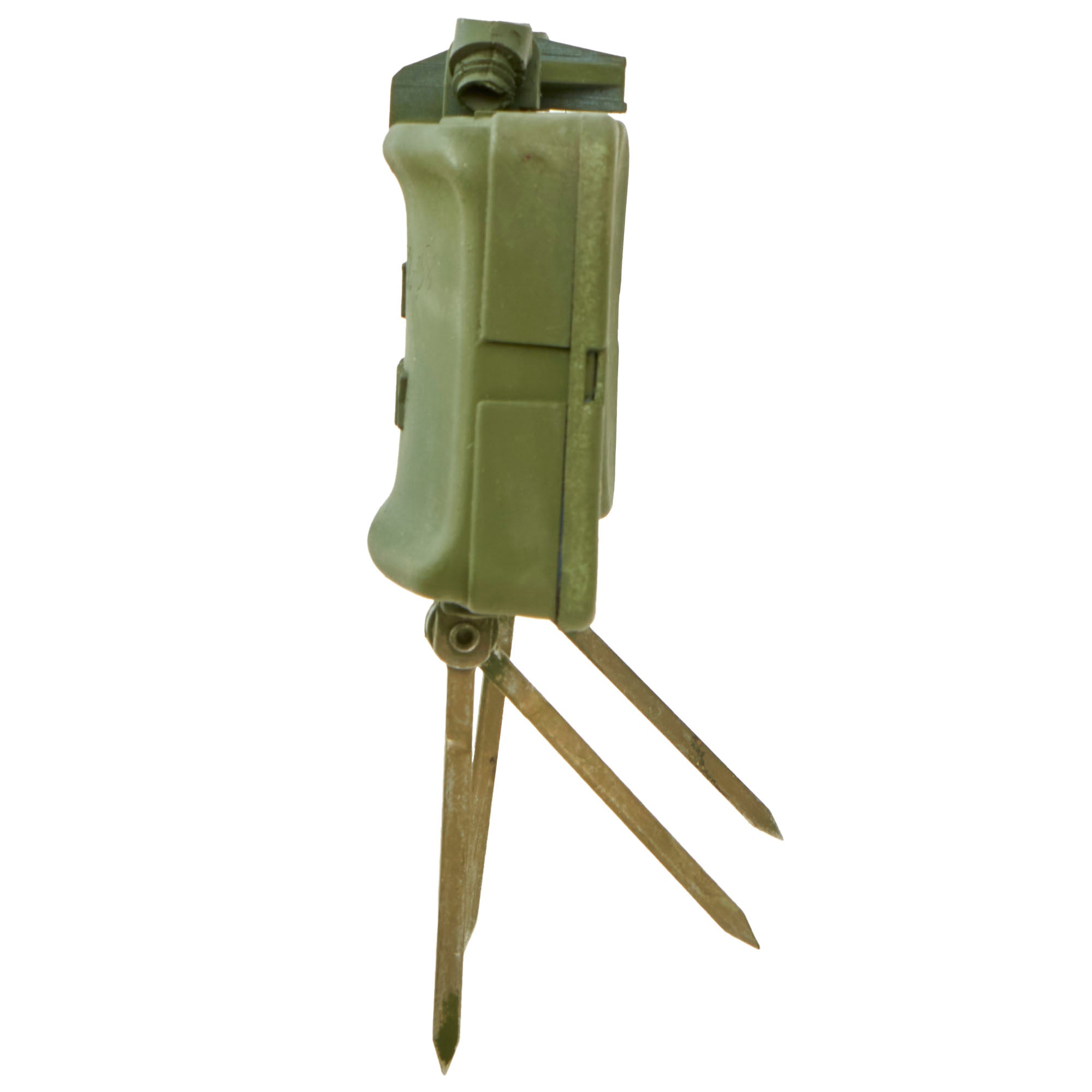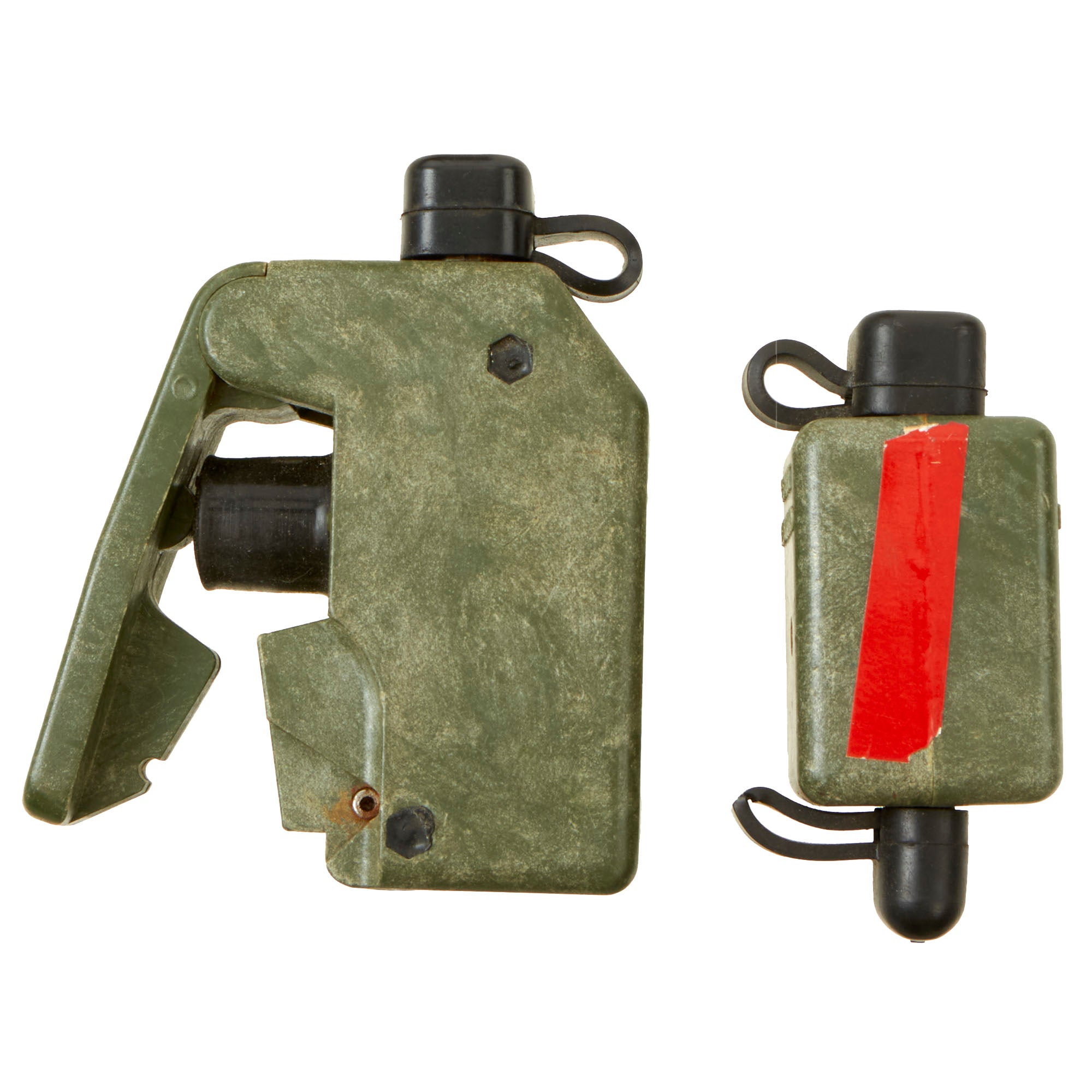 This example is very nice, and has the look of a well-used piece of equipment. The mine itself is cast in blue plastic, complete with internal shrapnel, some of which has broken loose. It was later repainted OD Green for display, but it is definitely marked PRACTICE / BACK / M-33 APERS MINE on the back. It still retains the original fold out support legs as well as the wire connectors. There are some cracks and chipping on the body of the inert mine most likely from being dropped.