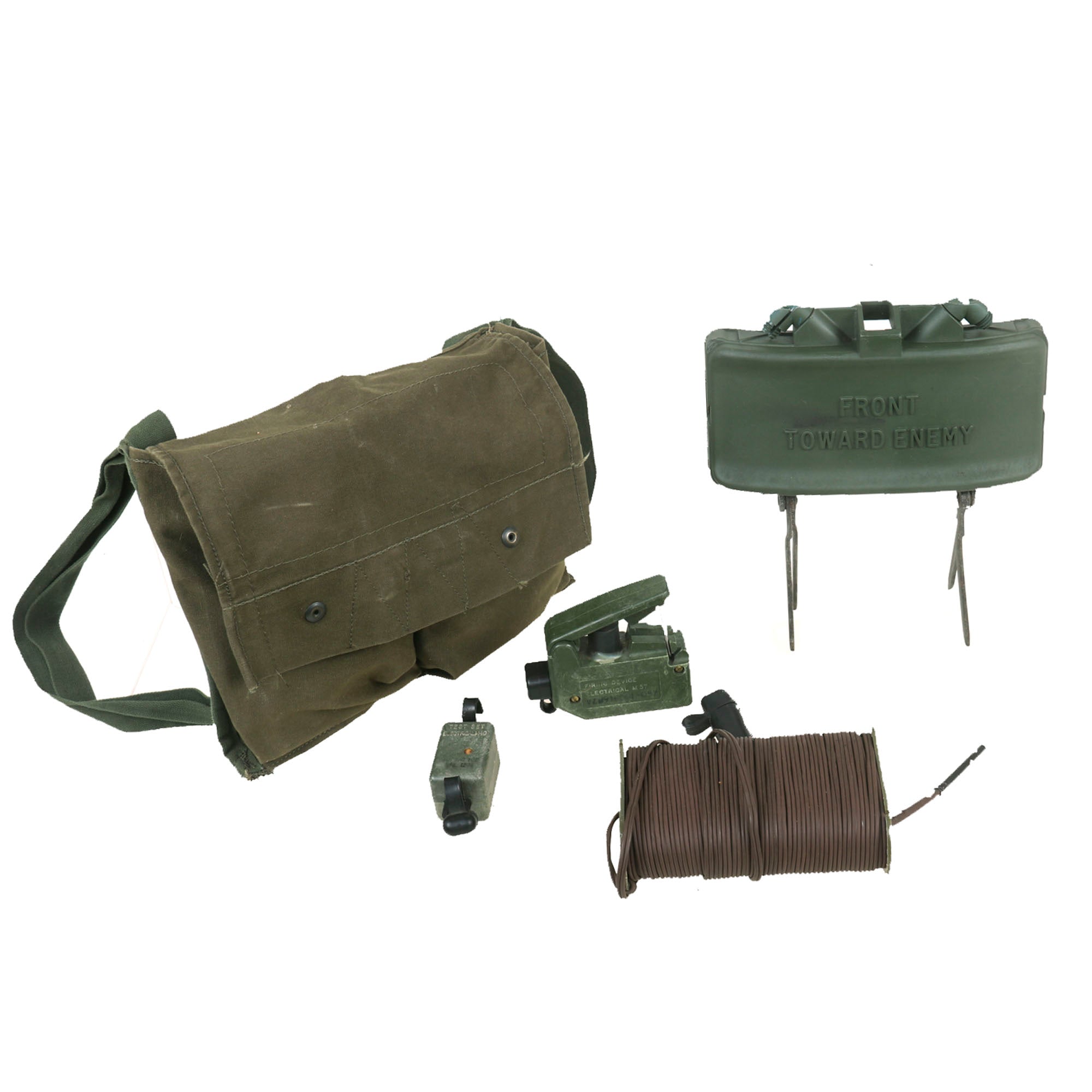 Original Items: One Set Only. The M68 kit was designed to familiarize personnel with the placement and arming of a real M18 Claymore directional mine. It comes with all the components of a real Claymore kit packed in an M7 bandoleer. The plastic M33 Inert AP Mine is the inert training and practice version of the M18 Claymore. Some inert mines were green with a light blue band, while others were completely blue. It does not contain an explosive or pyrotechnic filler of any kind. It is packed in a Claymore bag with inert M10 simulated detonator cap wire with connectors, a FIRING DEVICE ELECTRICAL M57 "clacker" firing control, and a TEST SET ELECTRICAL M40 circuit testing kit.