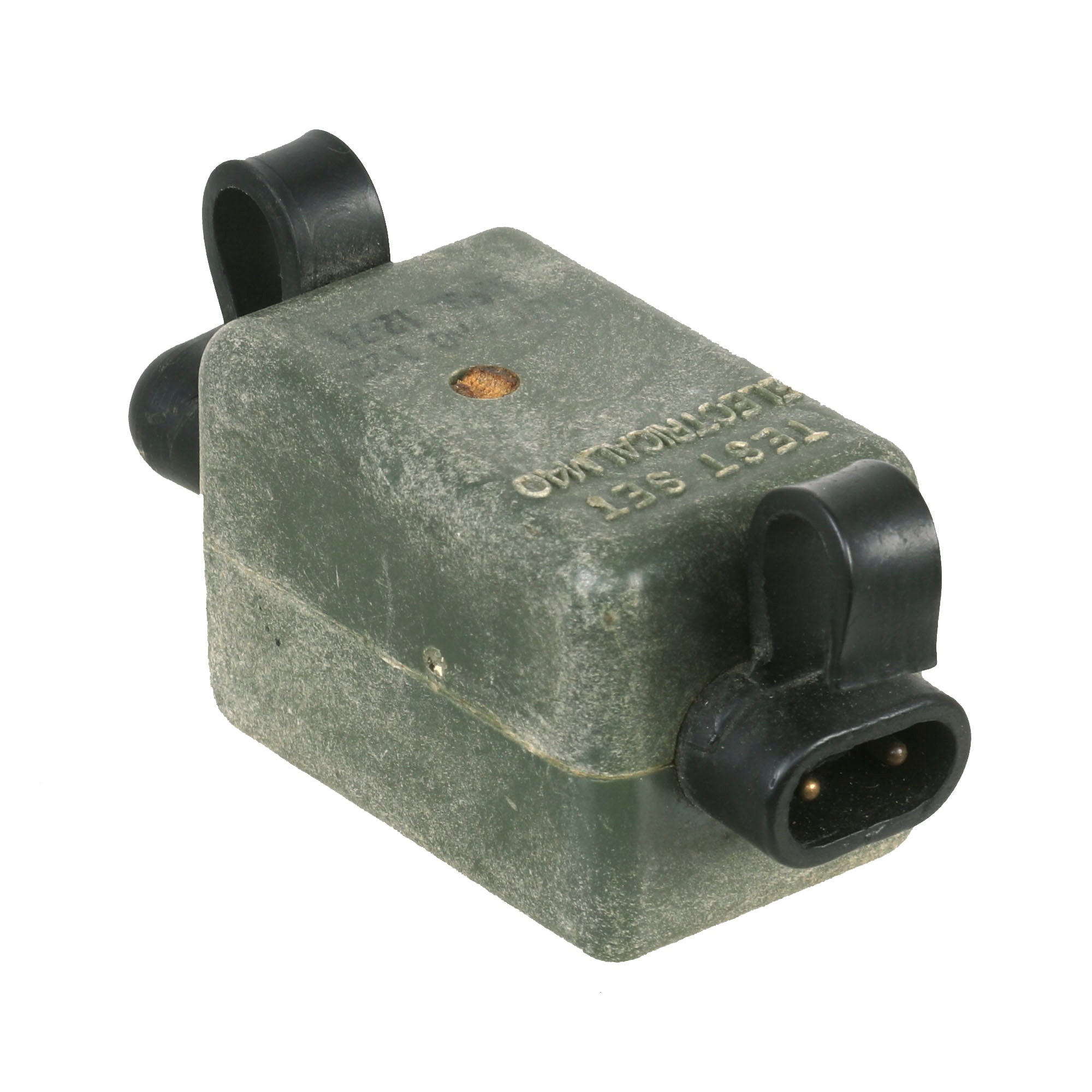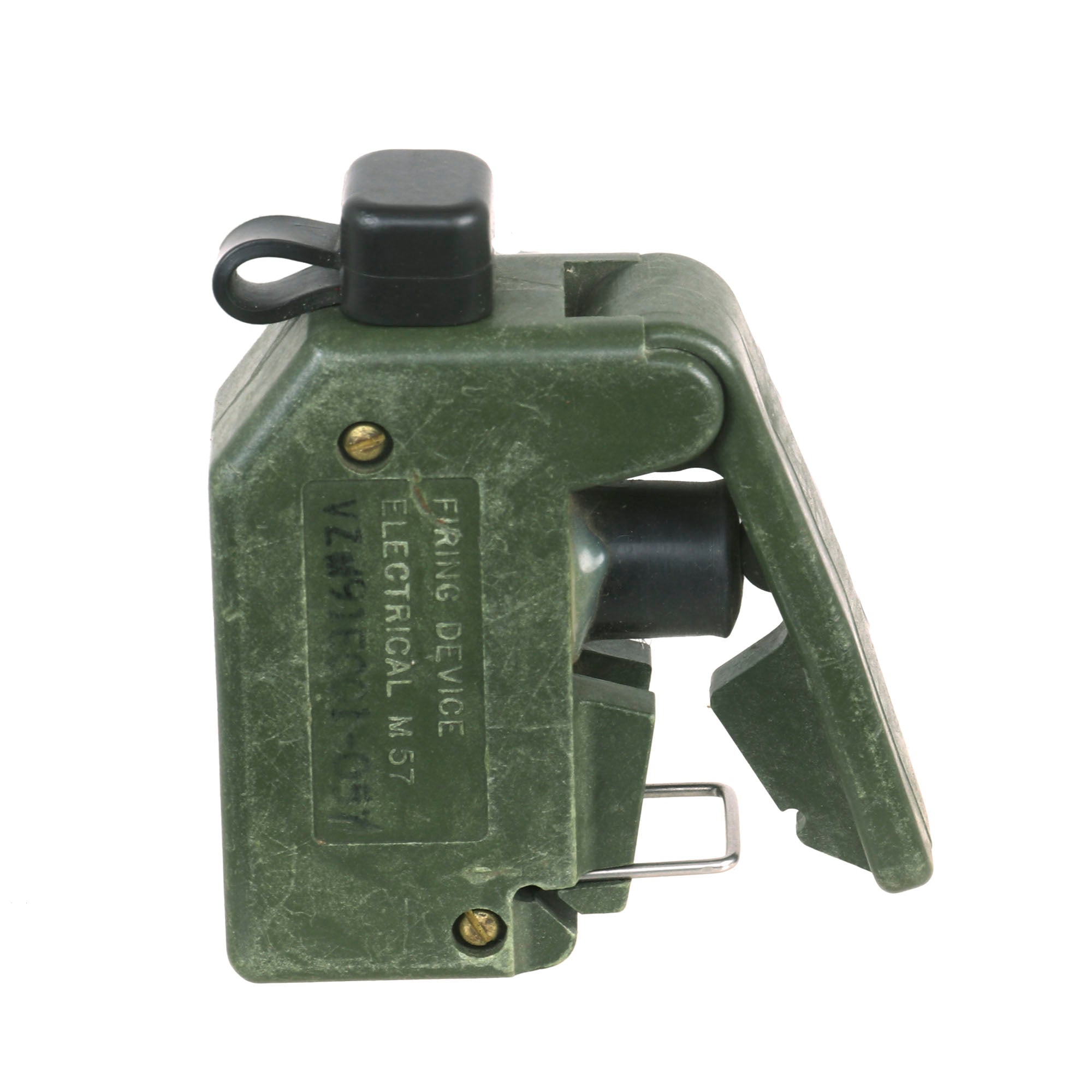 This example is very nice, and has the look of a well-used piece of equipment. The mine itself is cast in blue plastic, complete with internal shrapnel, some of which has broken loose. It was later repainted OD Green for display, but it is definitely marked PRACTICE / BACK / M-33 APERS MINE on the back. It still retains the original fold out support legs as well as the wire connectors. The legs are somewhat oxidized.
