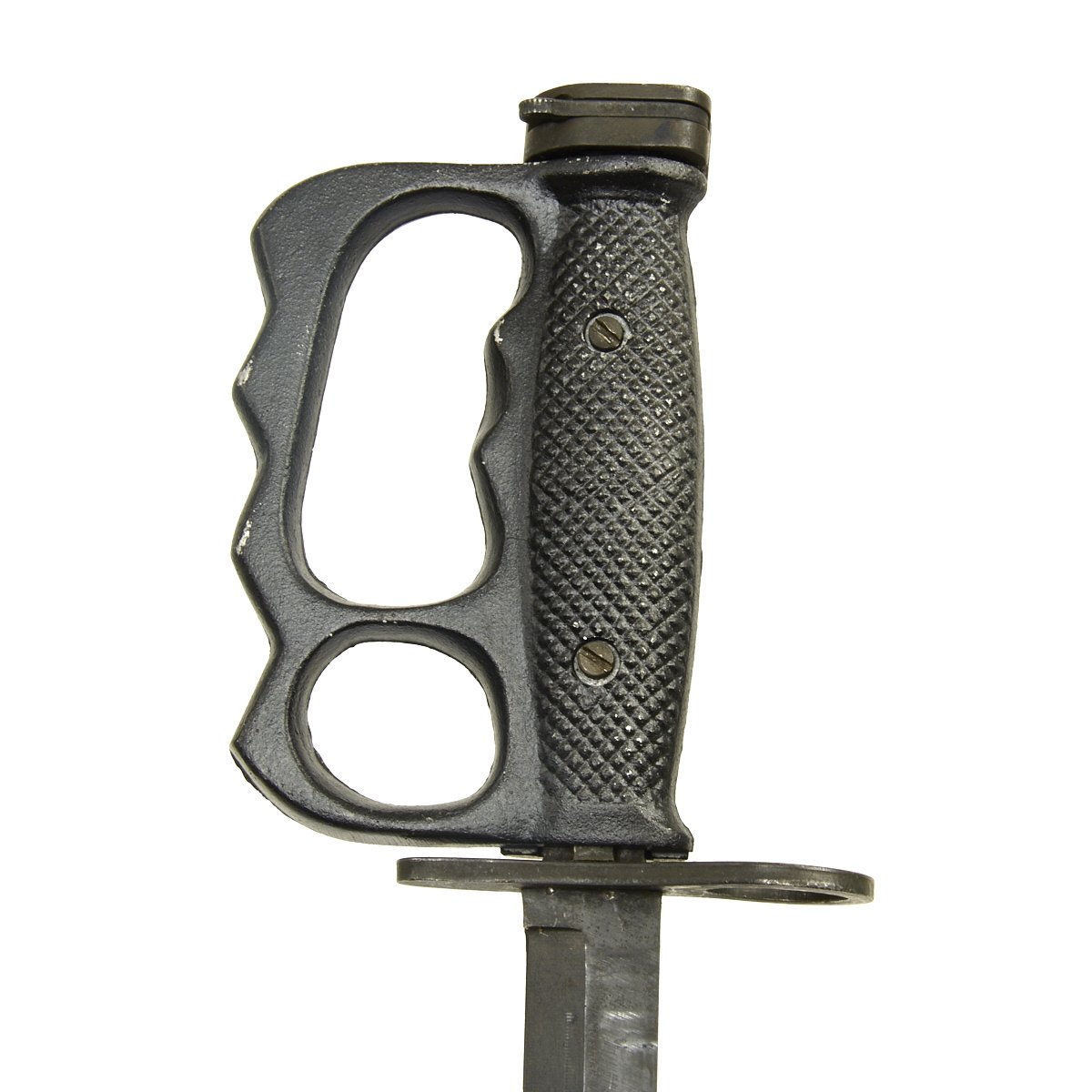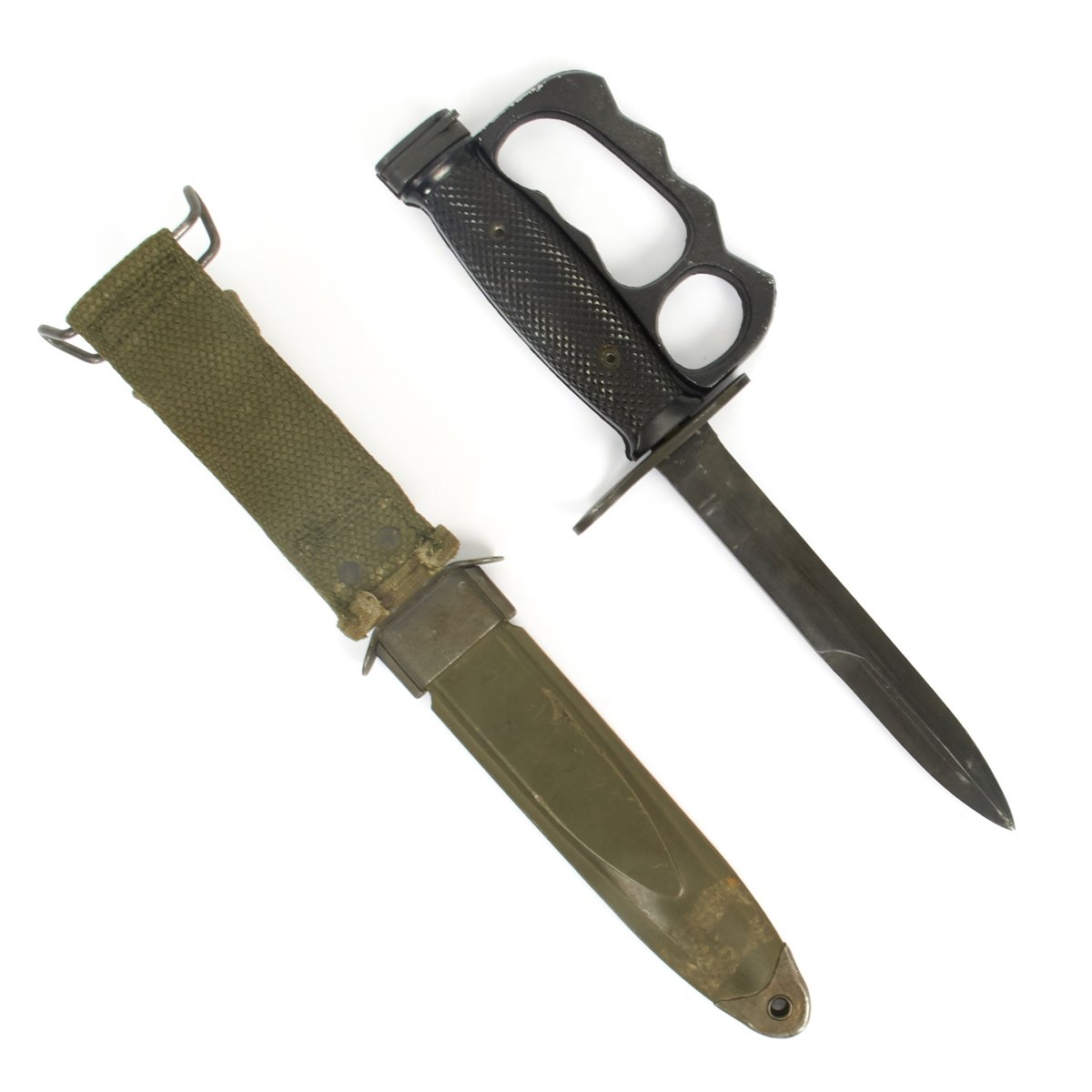 Original Item: Only One Available. This experimental bayonet fighting knife began life an M7 bayonet for use with a the U.S. M16 rifle. However, a one-piece cast aluminum grip panel with integrated knuckle duster guard was added in theater to create a dual purpose bayonet and close combat handheld weapon. This were very popular among USGIs in Vietnam but only very few were ever issued.