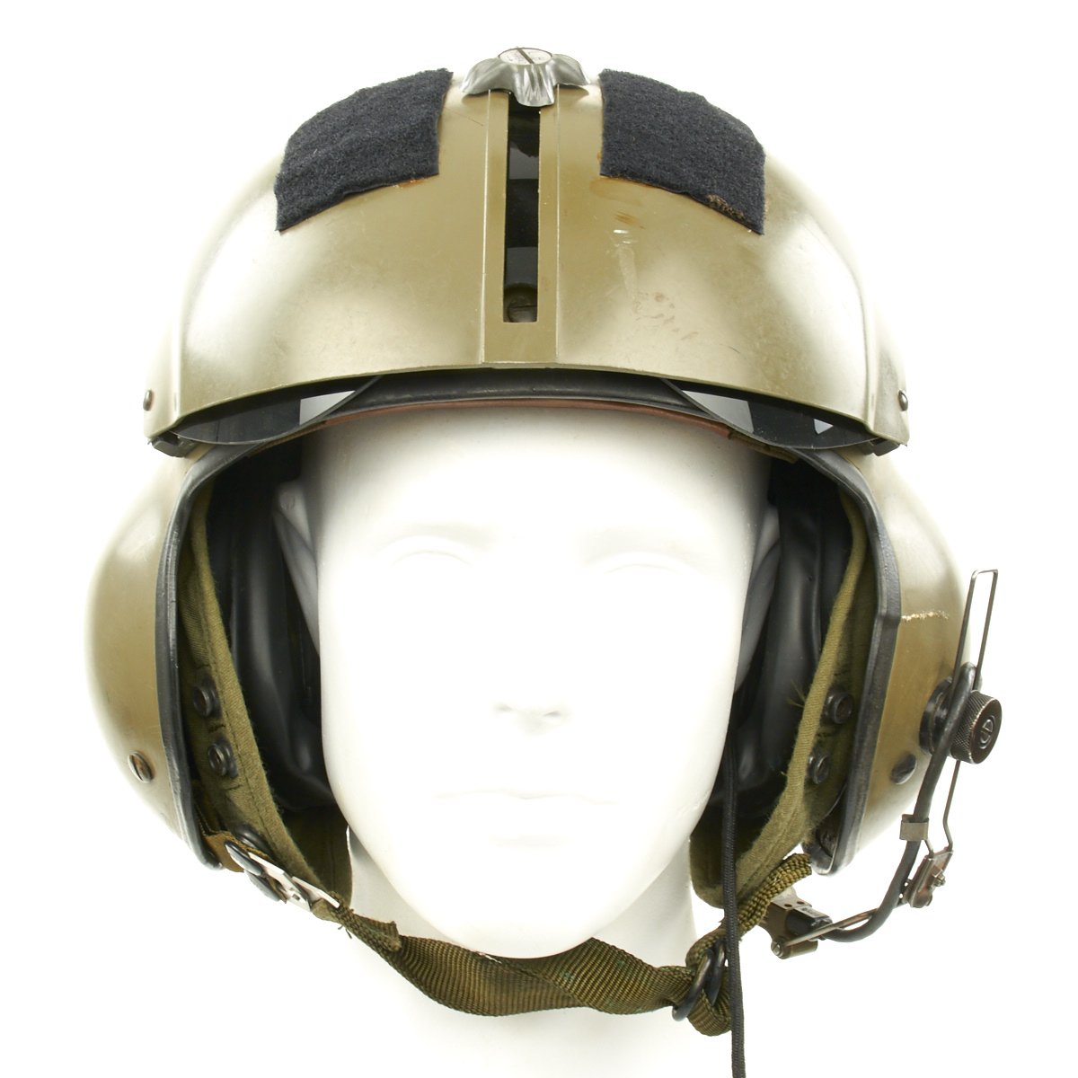 The original SPH-4 had a shell made of fiberglass cloth layers bonded by epoxy. The inner polystyrene foam energy absorbing liner was 97 mm (0.38") thick with a density of 5.2 lb/ft3. The helmet was fitted with a sling suspension liner and had a nape strap with a single snap on each side fitting to studs on a retention harness. The chin strap had a design strength of 150 lbs. The headset was mounted in 6 mm thick moulded plastic ear cups with excellent sound attenuation characteristics. A size regular helmet weighed 1.54 kg (3.4 lbs).