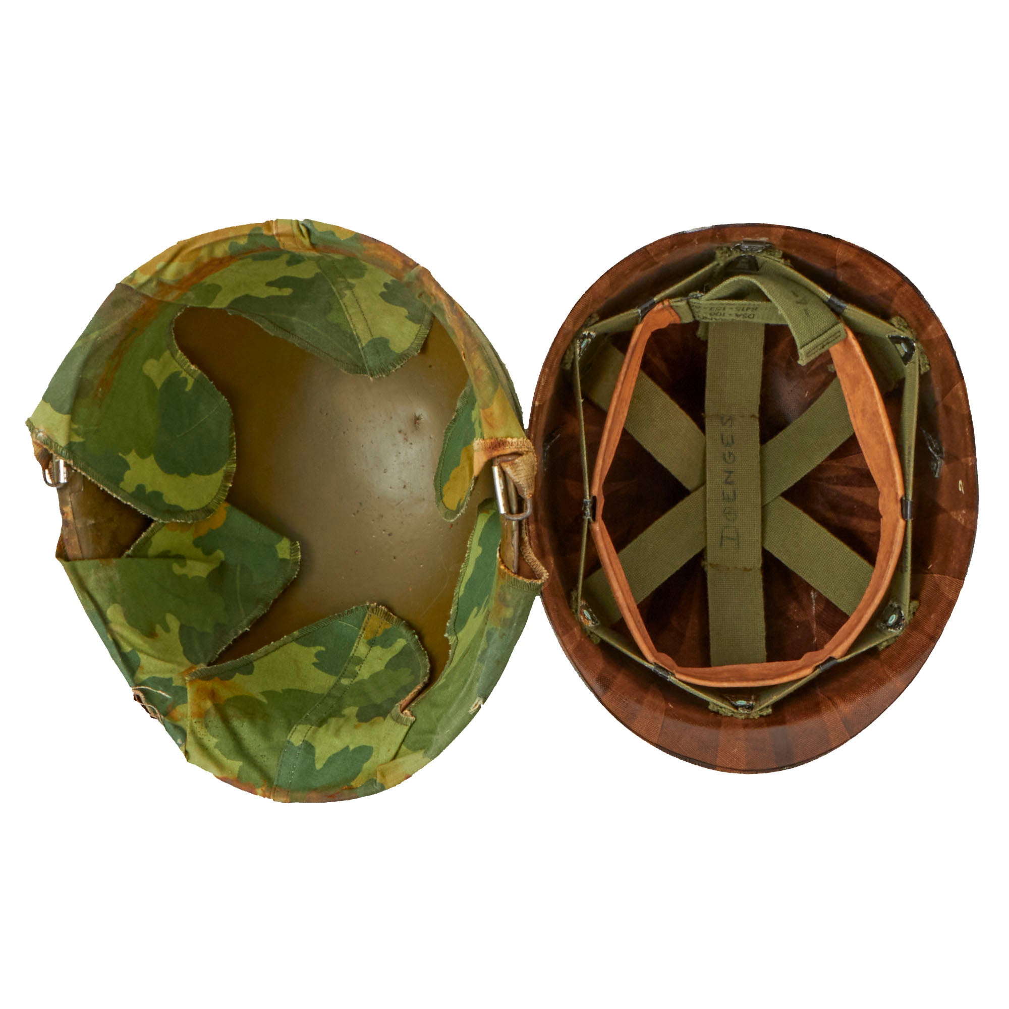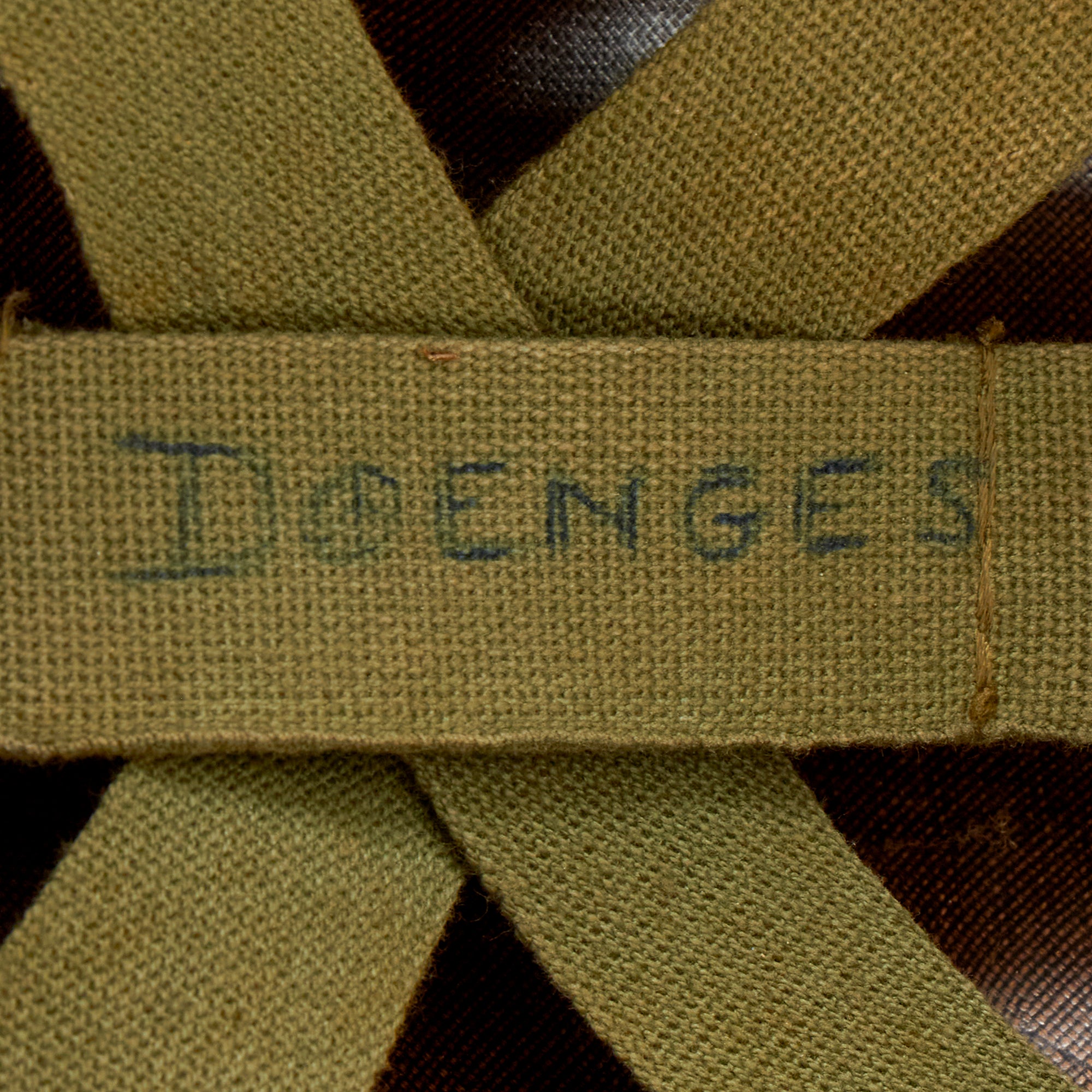 It is equipped with a standard Reversible Camouflage cover, which is marked on the opposite side. It is held in place by the elastic band that retains the cover. The cover has some burn marks at the top of the helmet, but is otherwise in fair condition. The helmet, cover, shell, and liner are all correct for a Vietnam war helmet. The chinstrap is affixed underneath the camouflage cover. The name Doenges is written on the headband at the bottom of the interior. No research has been done on this name.