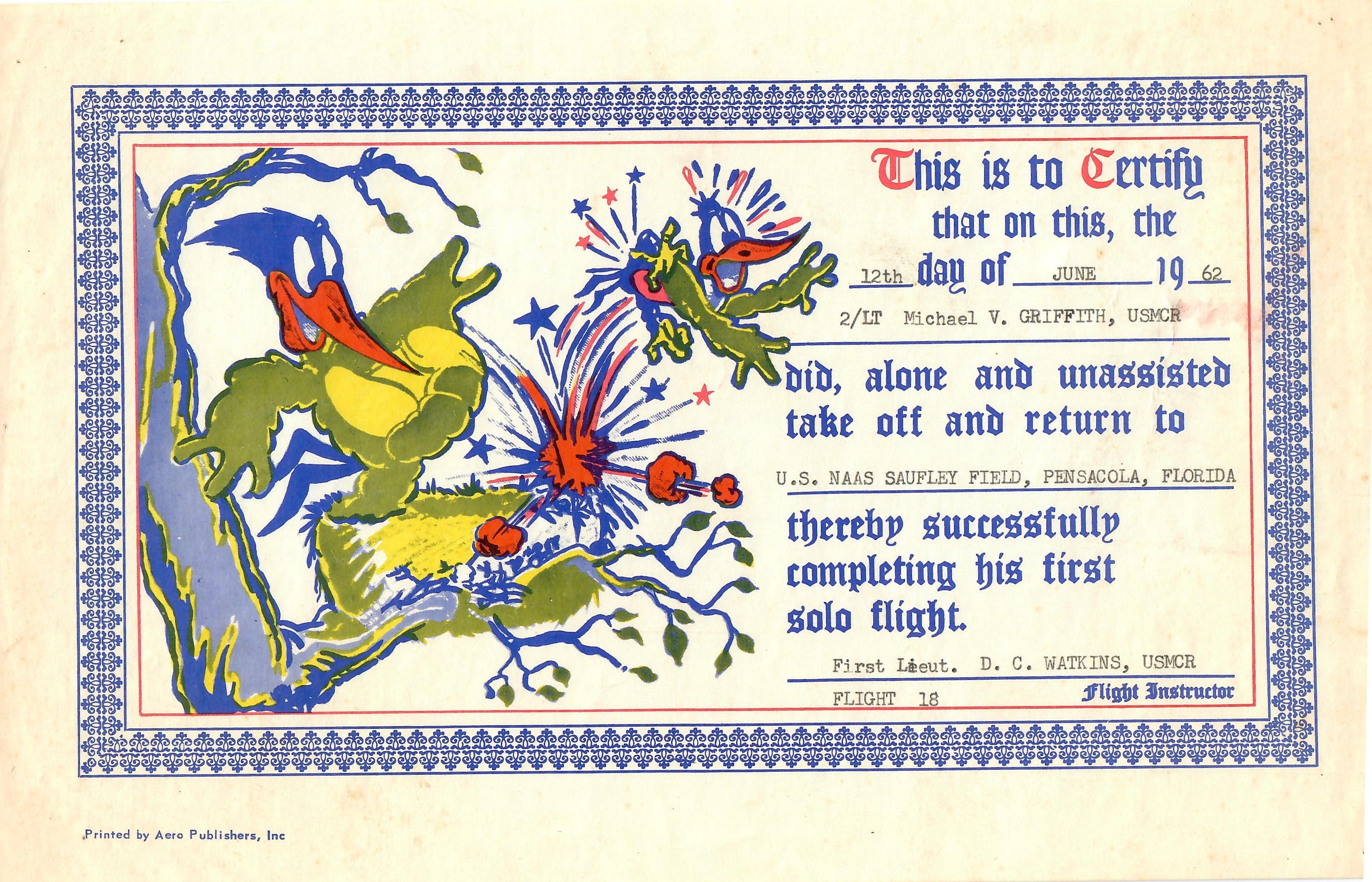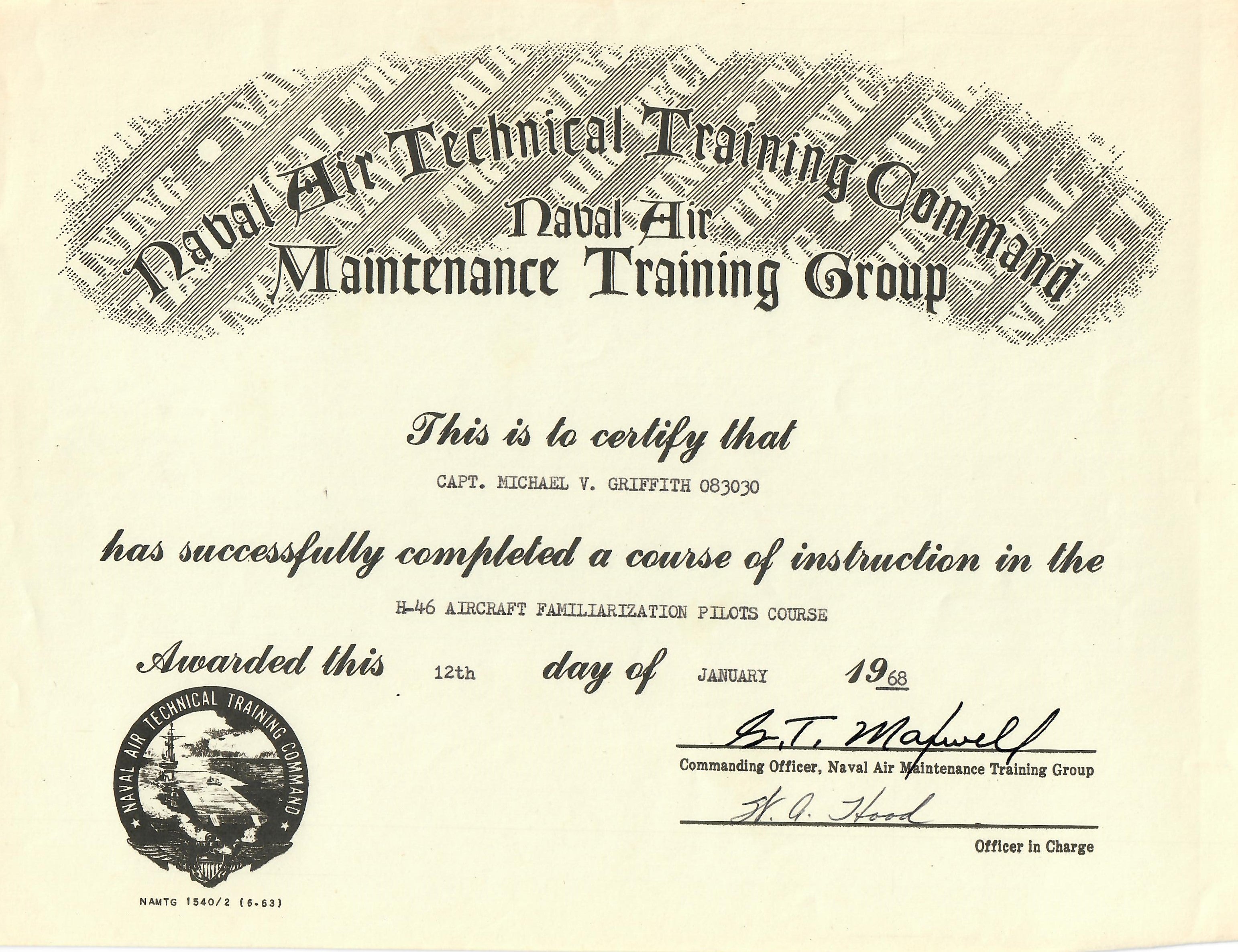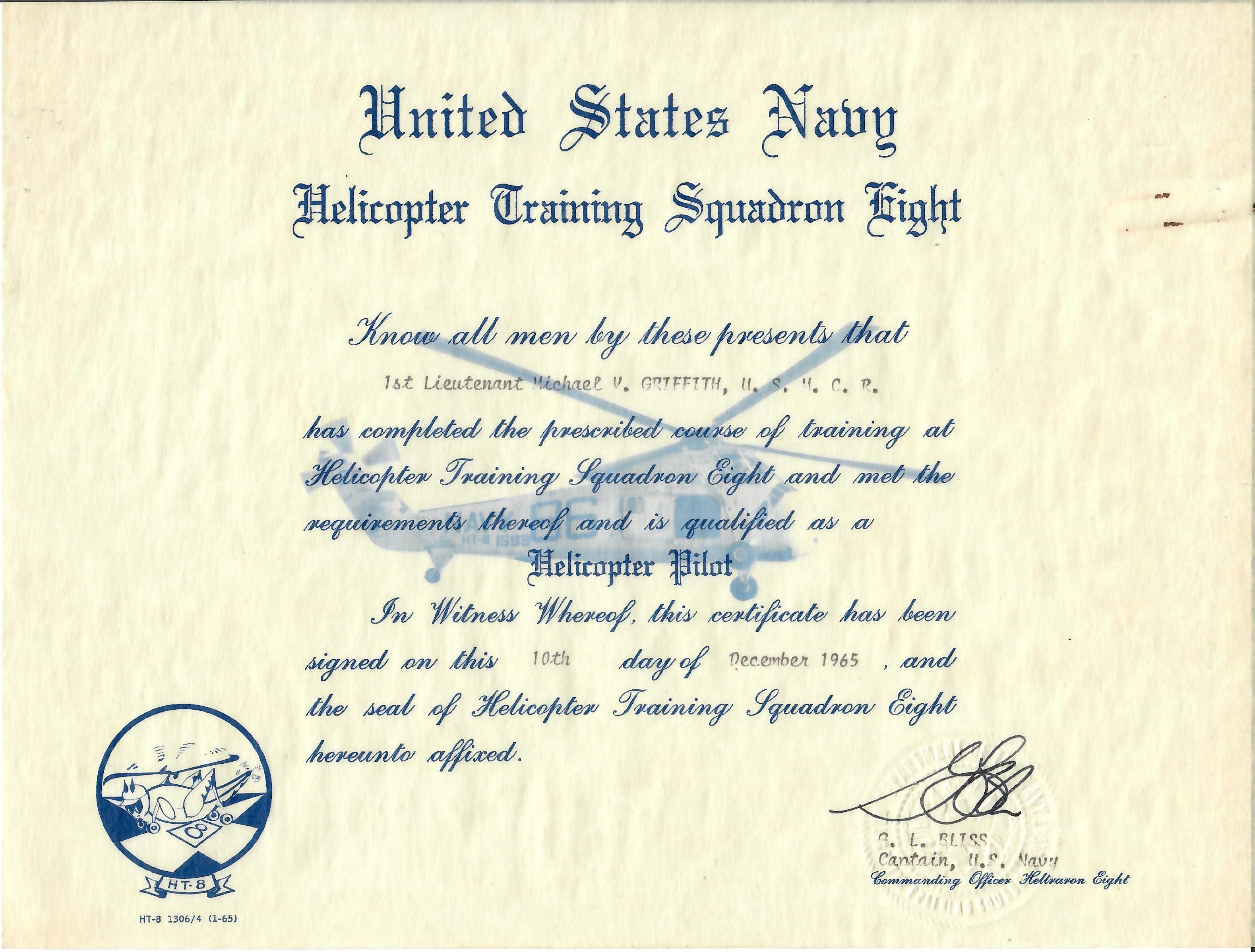 Major Griffith earned his wings from what we can tell as being a helicopter pilot, flying the Boeing Vertol CH-46 Sea Knight. During 1961, the US Marine Corps, which had been studying its requirements for a medium-lift, twin-turbine cargo/troop assault helicopter, selected Boeing Vertol's Model 107M as the basis from which to manufacture a suitable rotorcraft to meet their needs. Known colloquially as the "Phrog" and formally as the "Sea Knight", it was operated across all US Marine Corps' operational environments between its introduction during the Vietnam War and its frontline retirement during 2014.