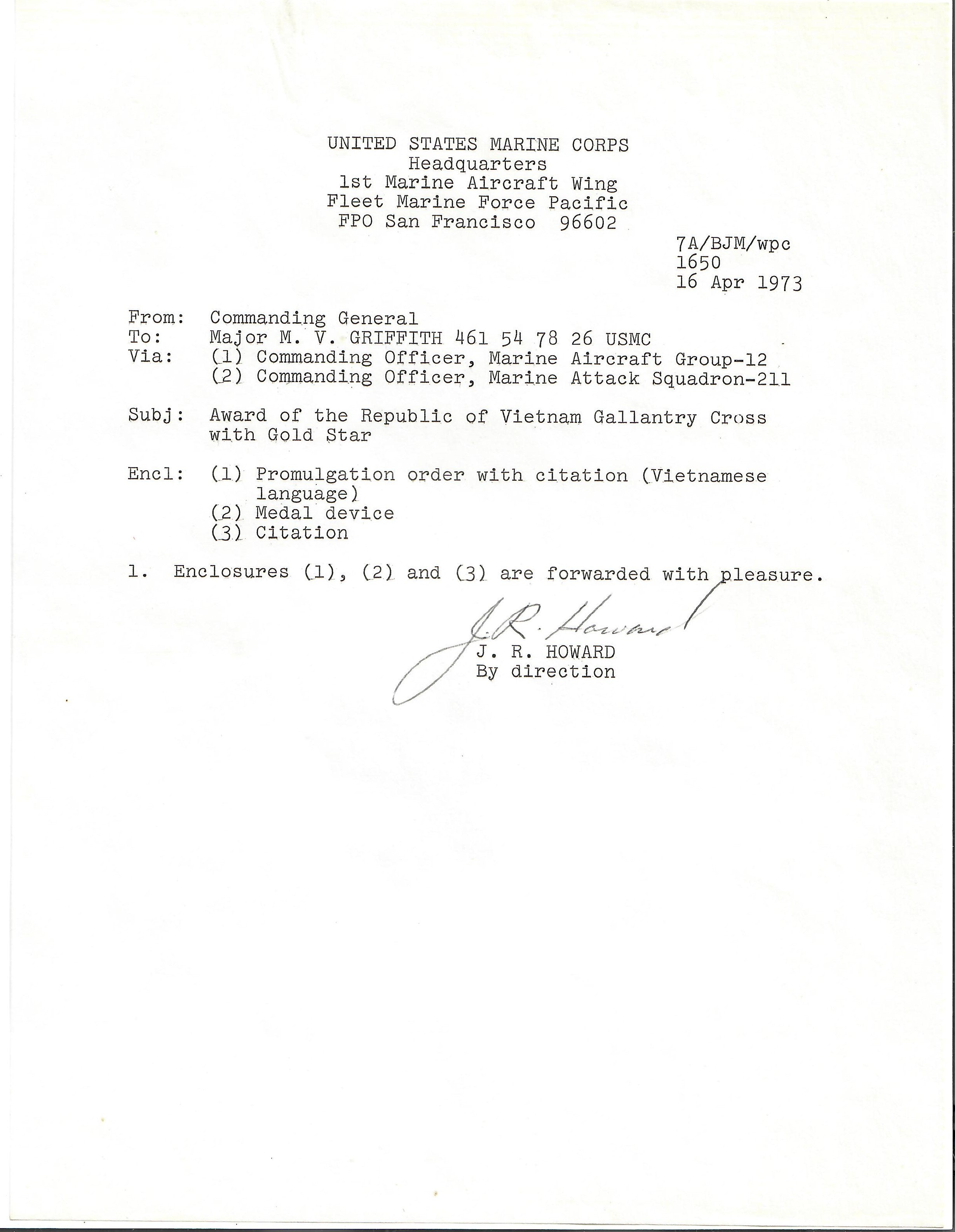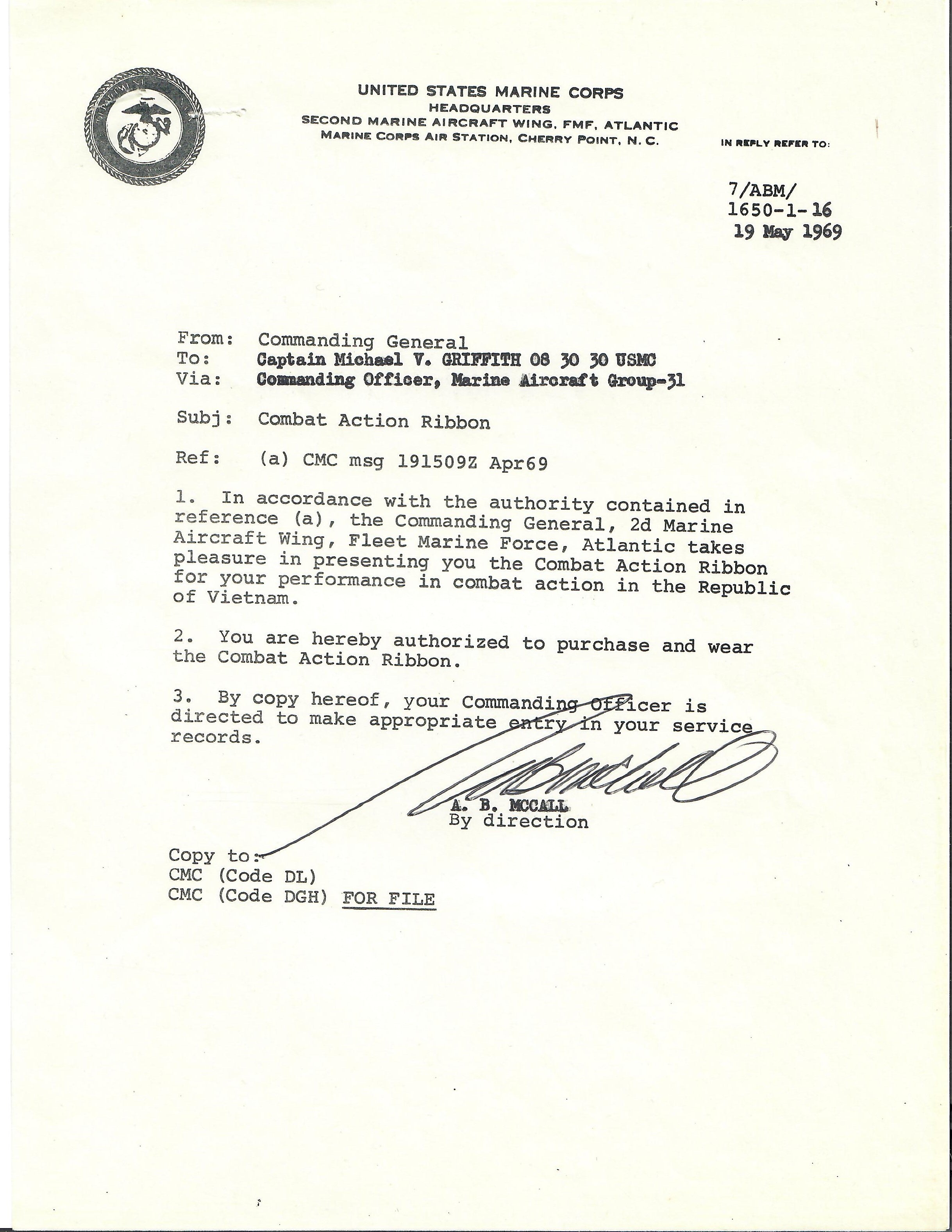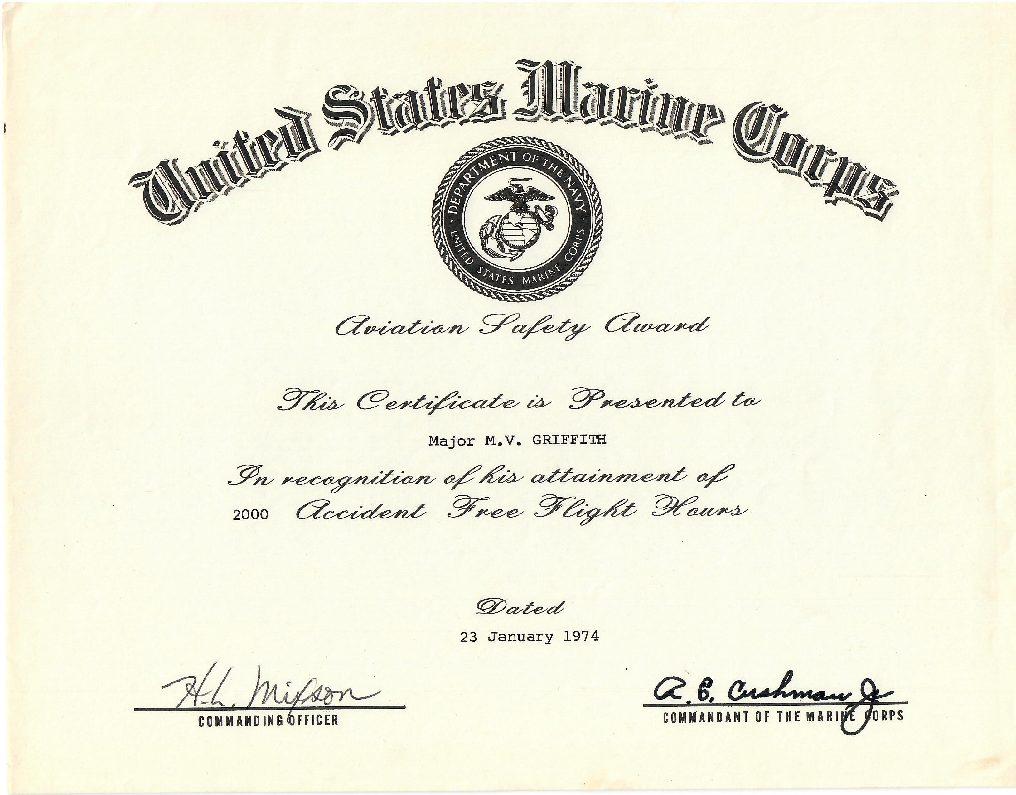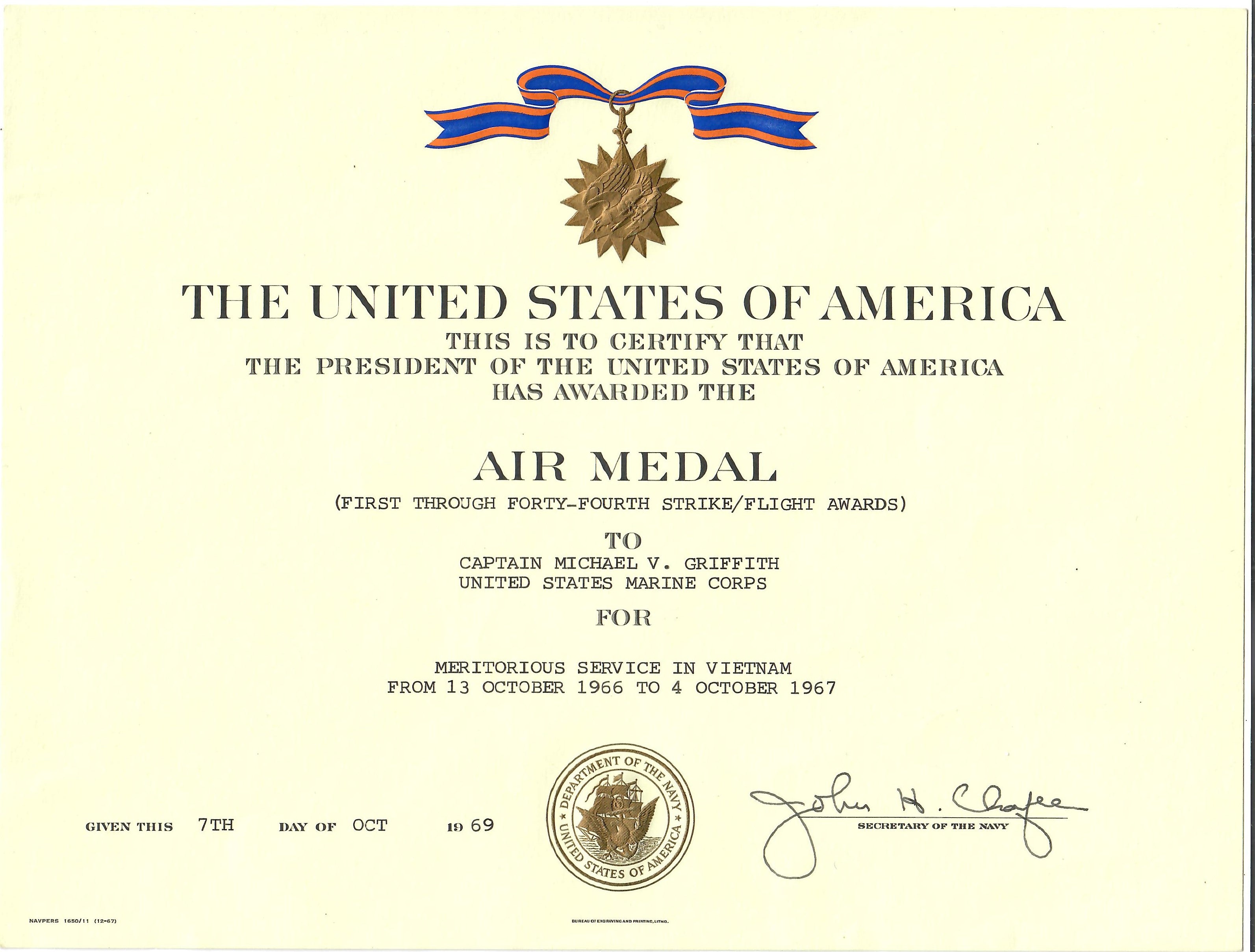 Original Items: One of a Kind Grouping. This is a lovely document heavy grouping for US Marine Pilot Major Michael V. Griffith, who served with Marine Attack Squadron 331 and other units during and after the Vietnam War. The best item in this grouping is the name engraved Air Medal that has the bronze number 59. Bronze Strike/Flight numerals denoted the number of Strike/Flight awards. They are authorized for operations in hostile or disputed territory and count the total number of Strikes (operations that faced enemy opposition) and Flights (operations that did not encounter enemy opposition) added together.