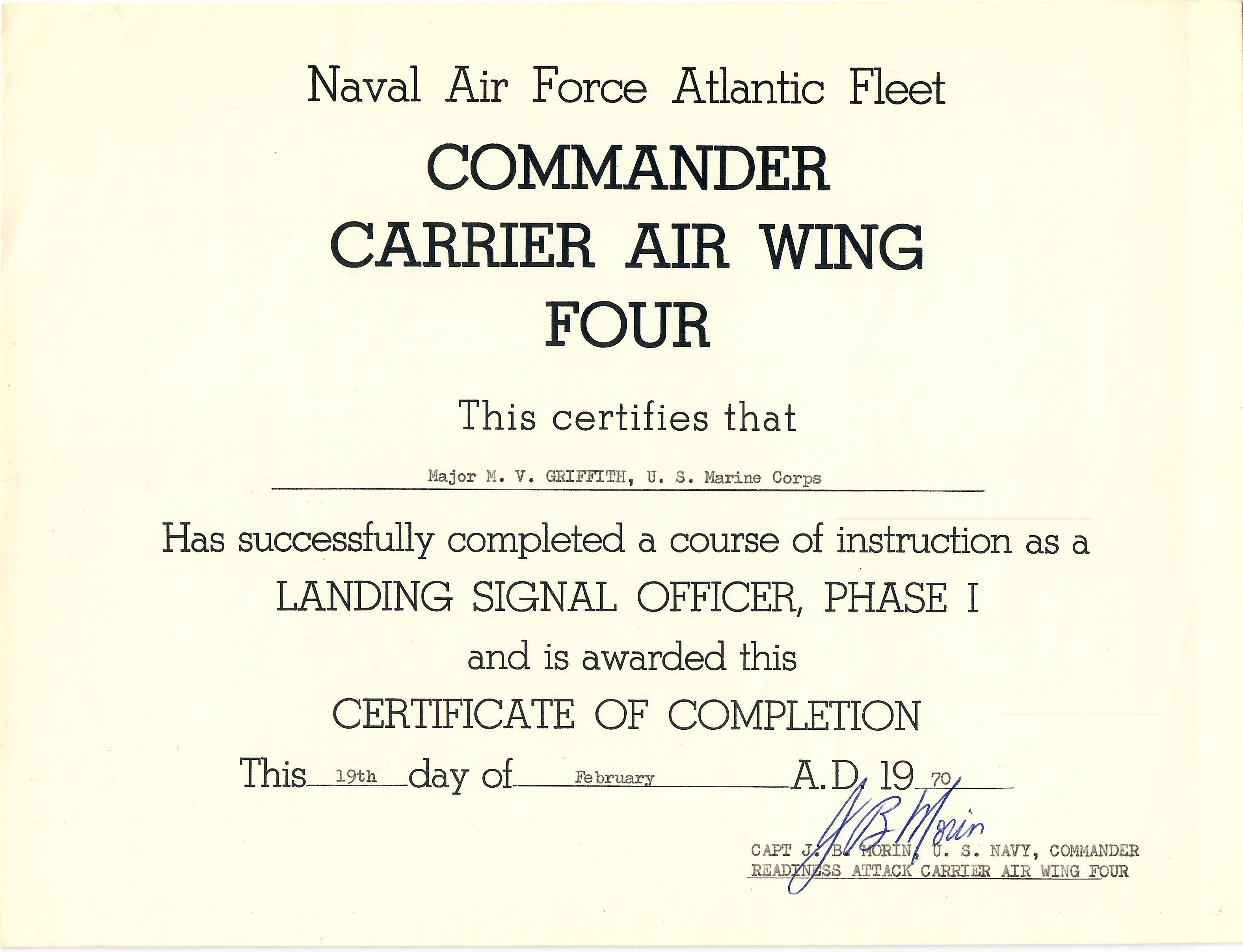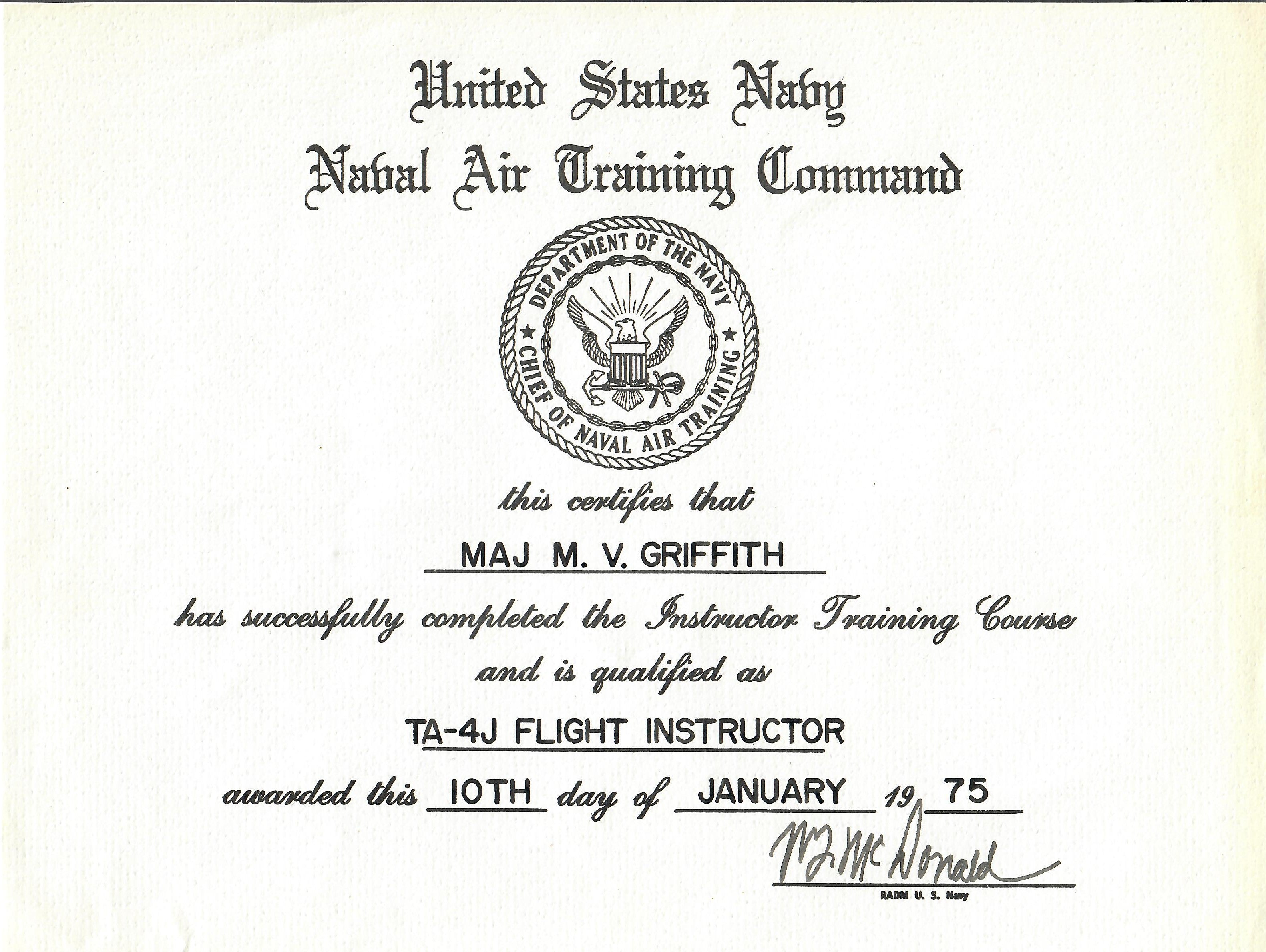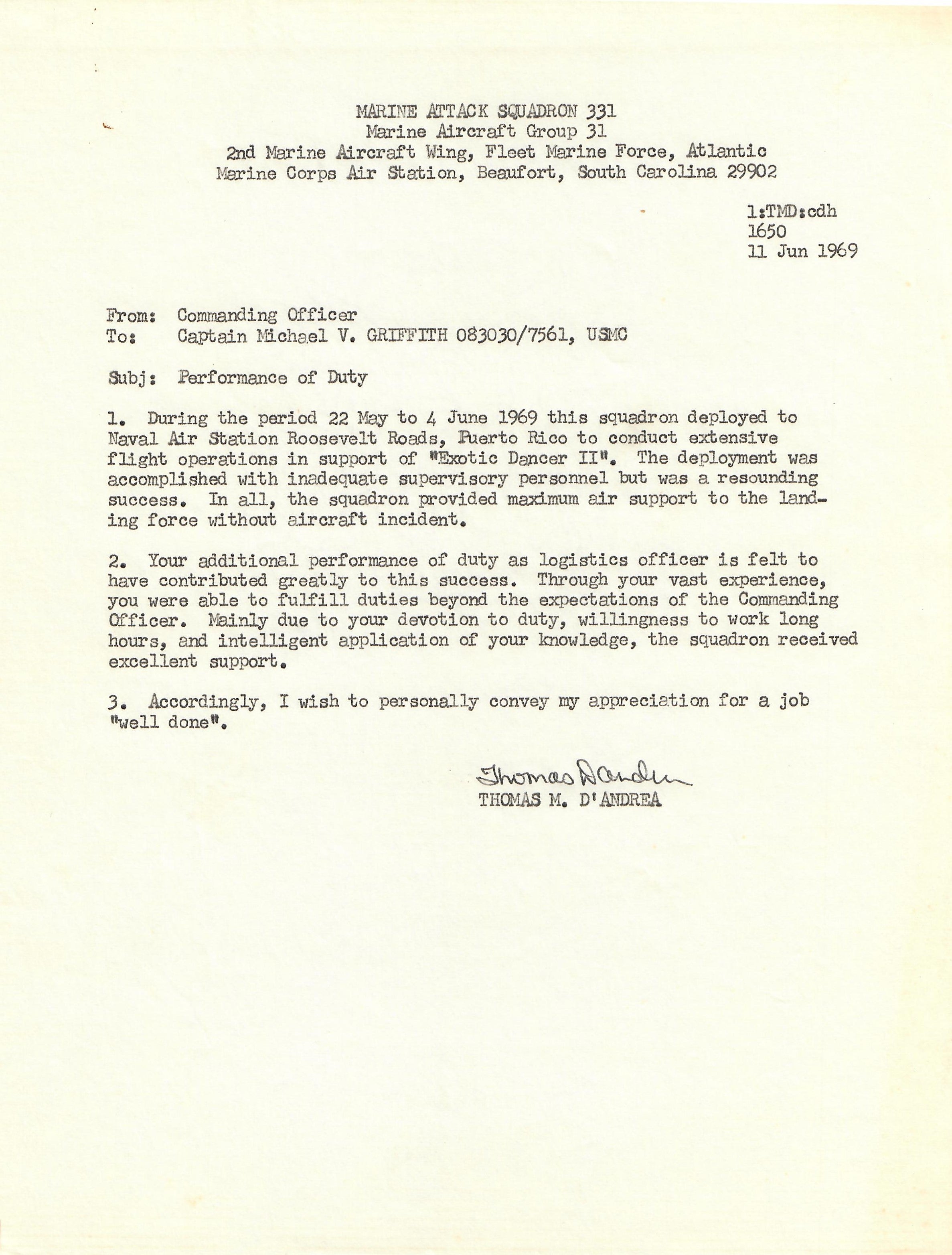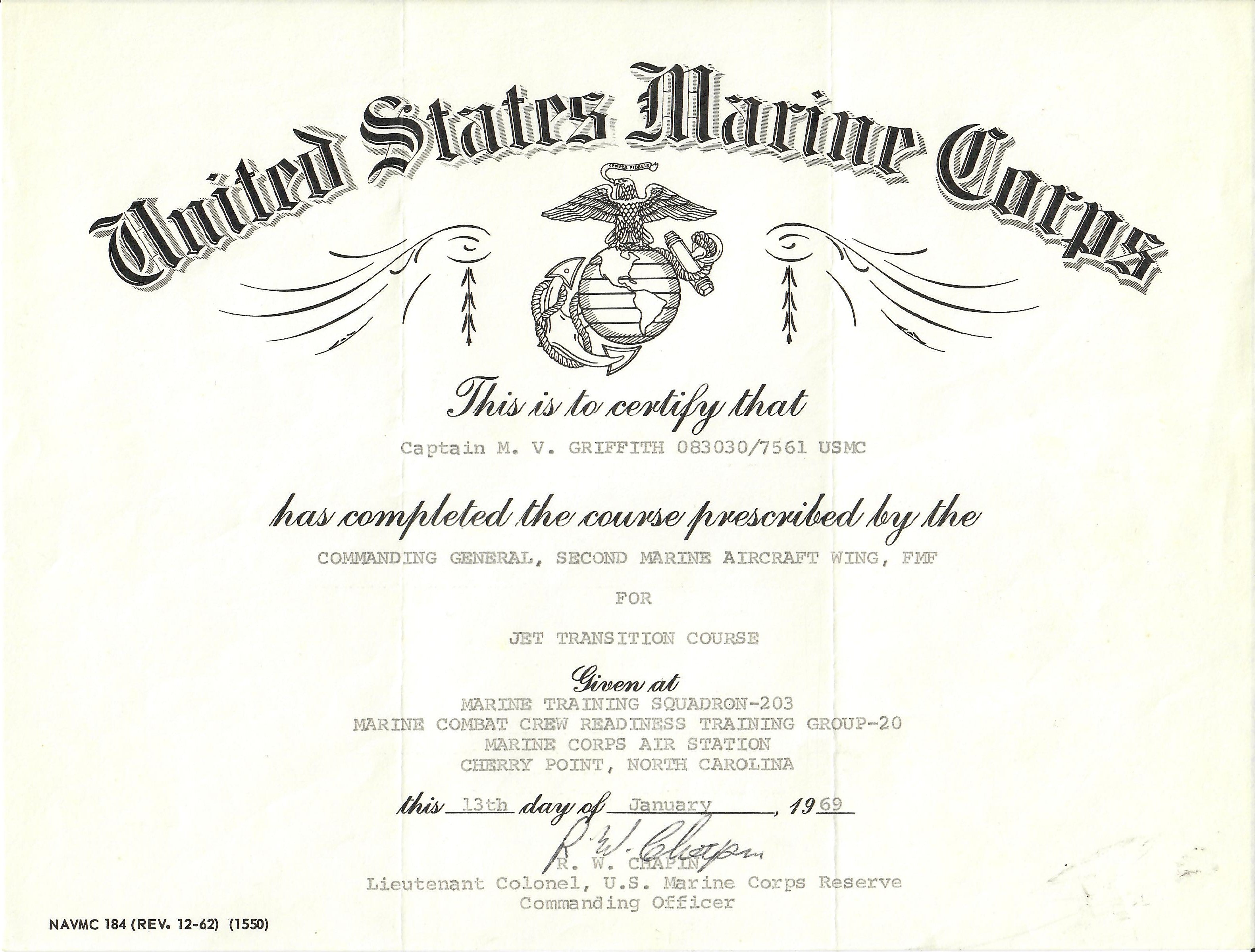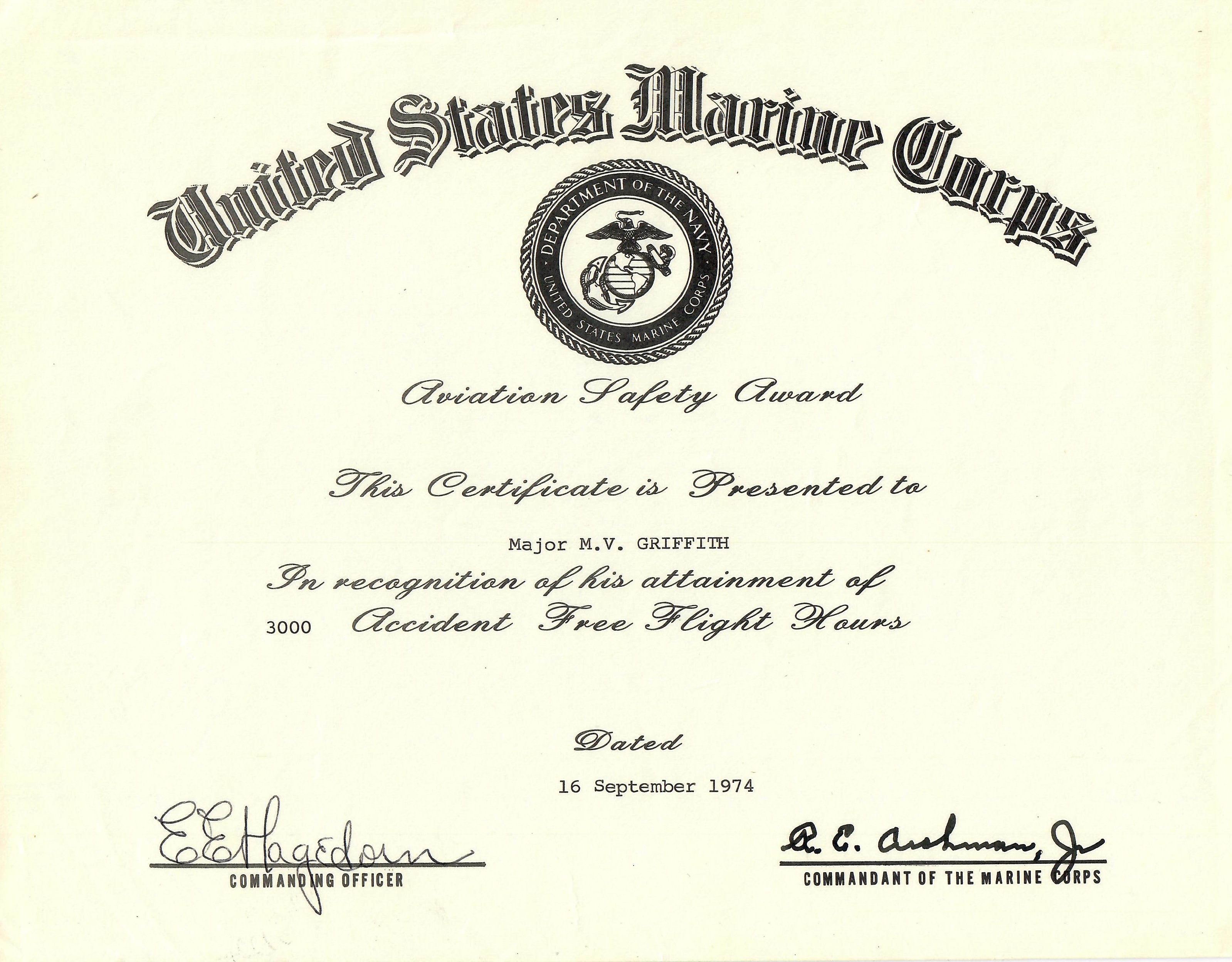 Original Items: One of a Kind Grouping. This is a lovely document heavy grouping for US Marine Pilot Major Michael V. Griffith, who served with Marine Attack Squadron 331 and other units during and after the Vietnam War. The best item in this grouping is the name engraved Air Medal that has the bronze number 59. Bronze Strike/Flight numerals denoted the number of Strike/Flight awards. They are authorized for operations in hostile or disputed territory and count the total number of Strikes (operations that faced enemy opposition) and Flights (operations that did not encounter enemy opposition) added together.
