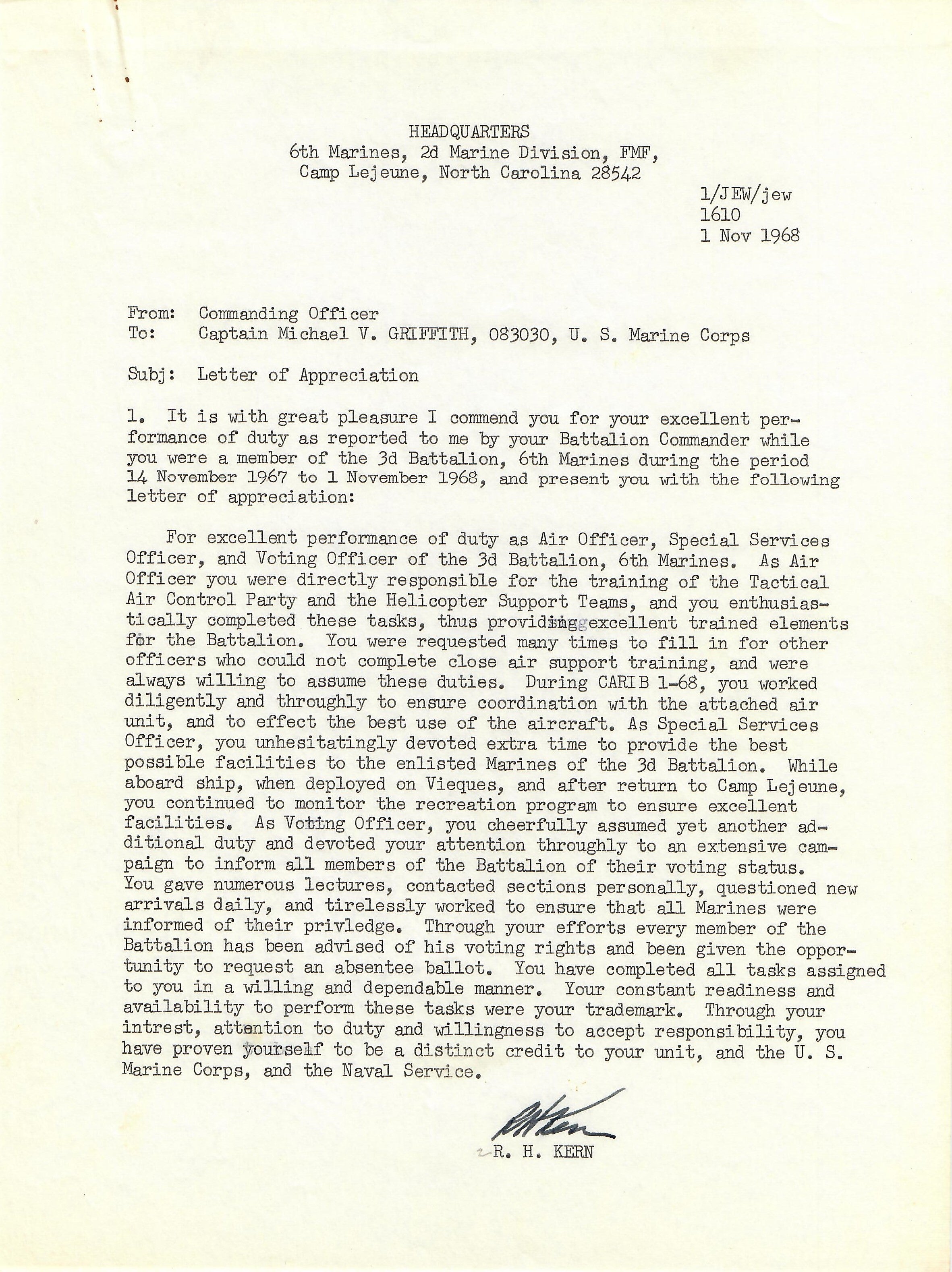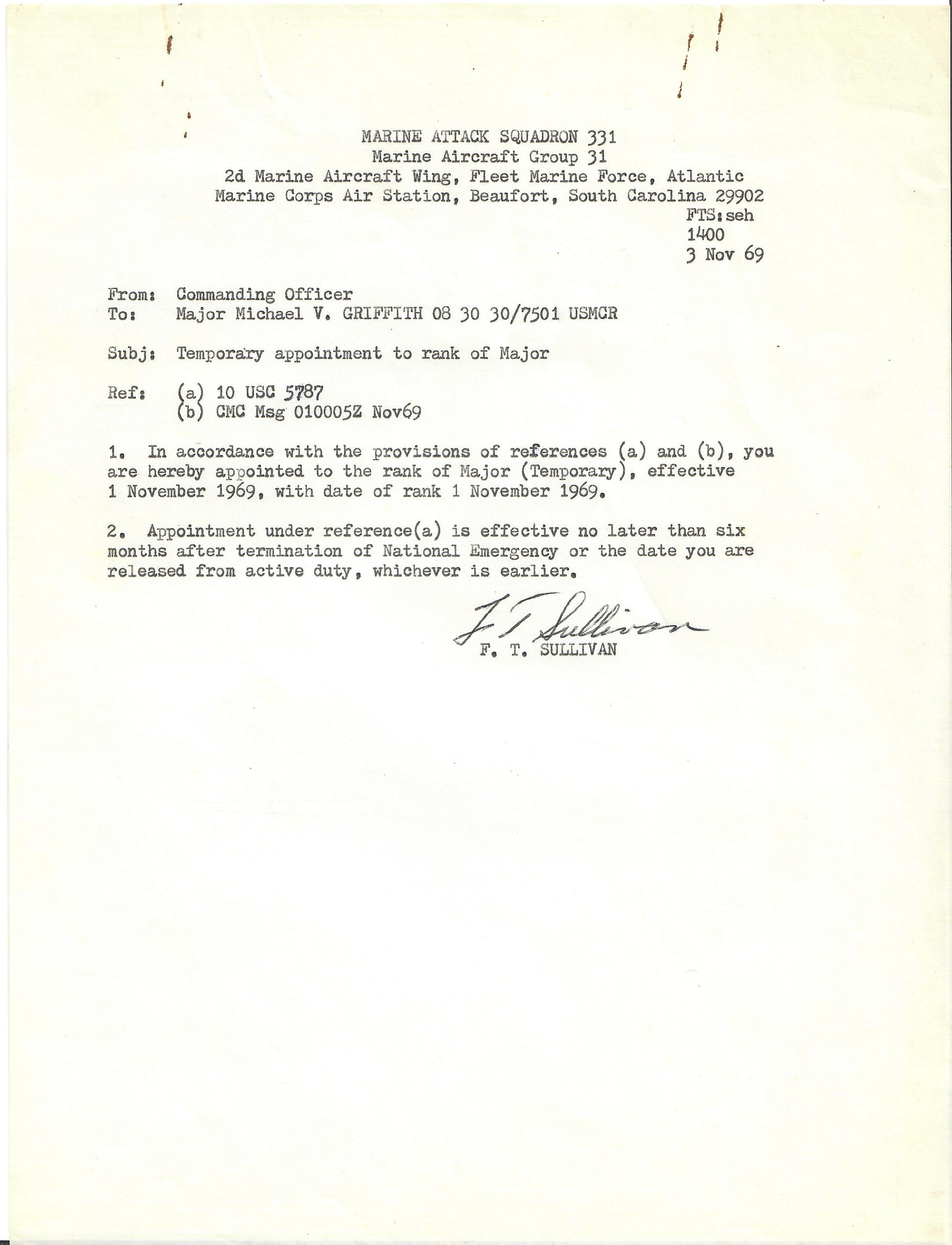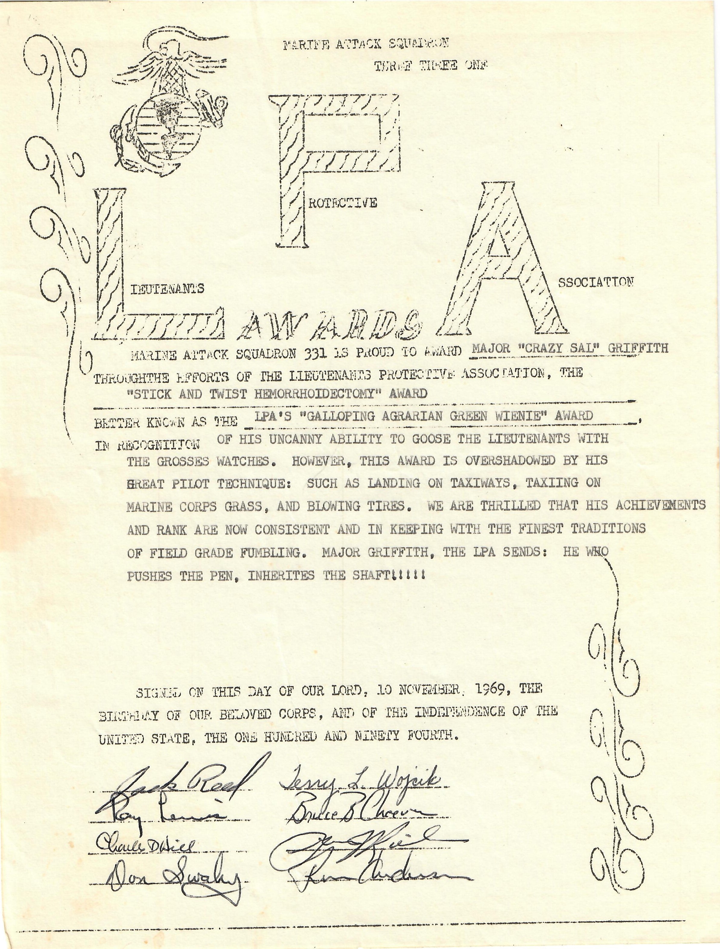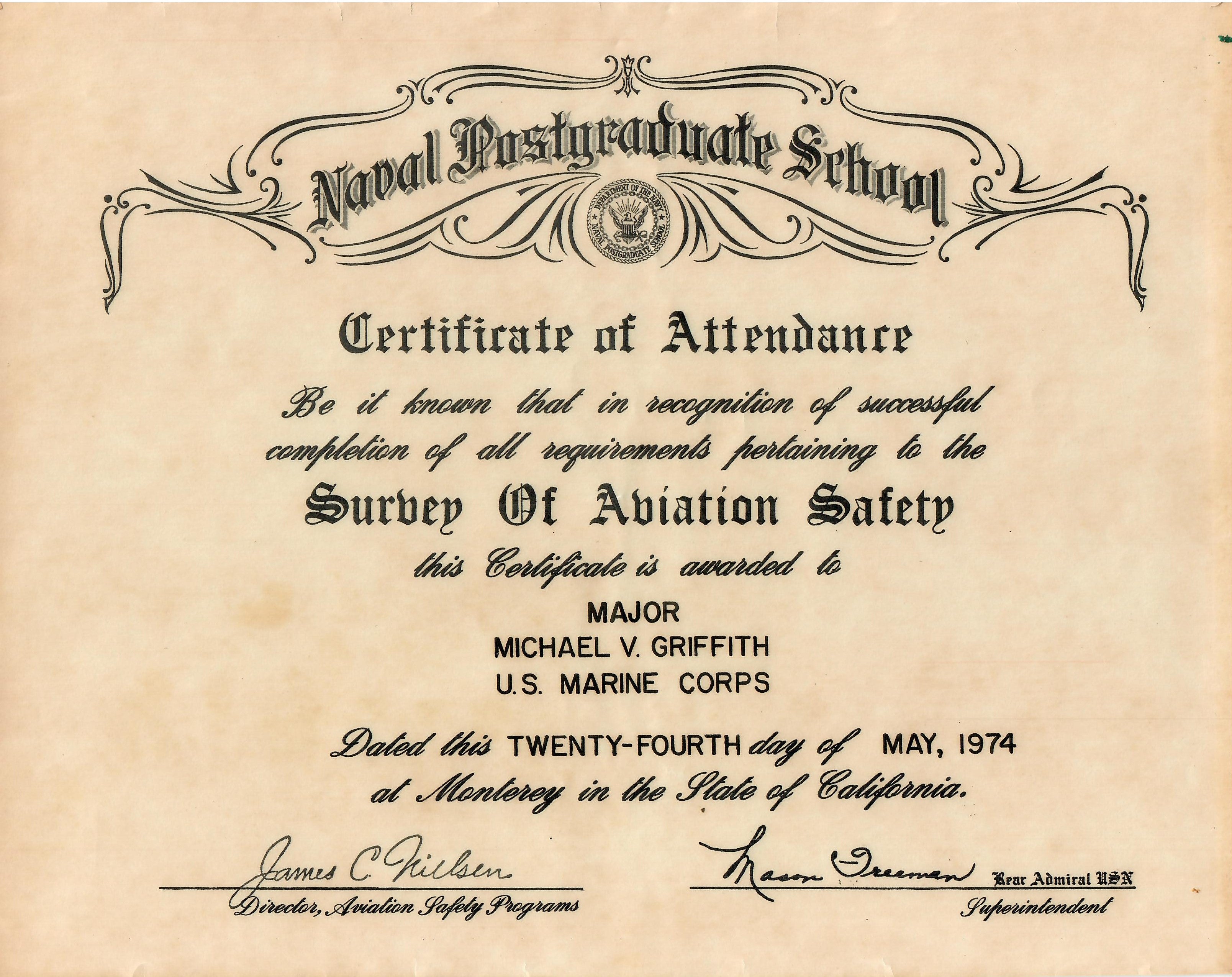 Original Items: One of a Kind Grouping. This is a lovely document heavy grouping for US Marine Pilot Major Michael V. Griffith, who served with Marine Attack Squadron 331 and other units during and after the Vietnam War. The best item in this grouping is the name engraved Air Medal that has the bronze number 59. Bronze Strike/Flight numerals denoted the number of Strike/Flight awards. They are authorized for operations in hostile or disputed territory and count the total number of Strikes (operations that faced enemy opposition) and Flights (operations that did not encounter enemy opposition) added together.