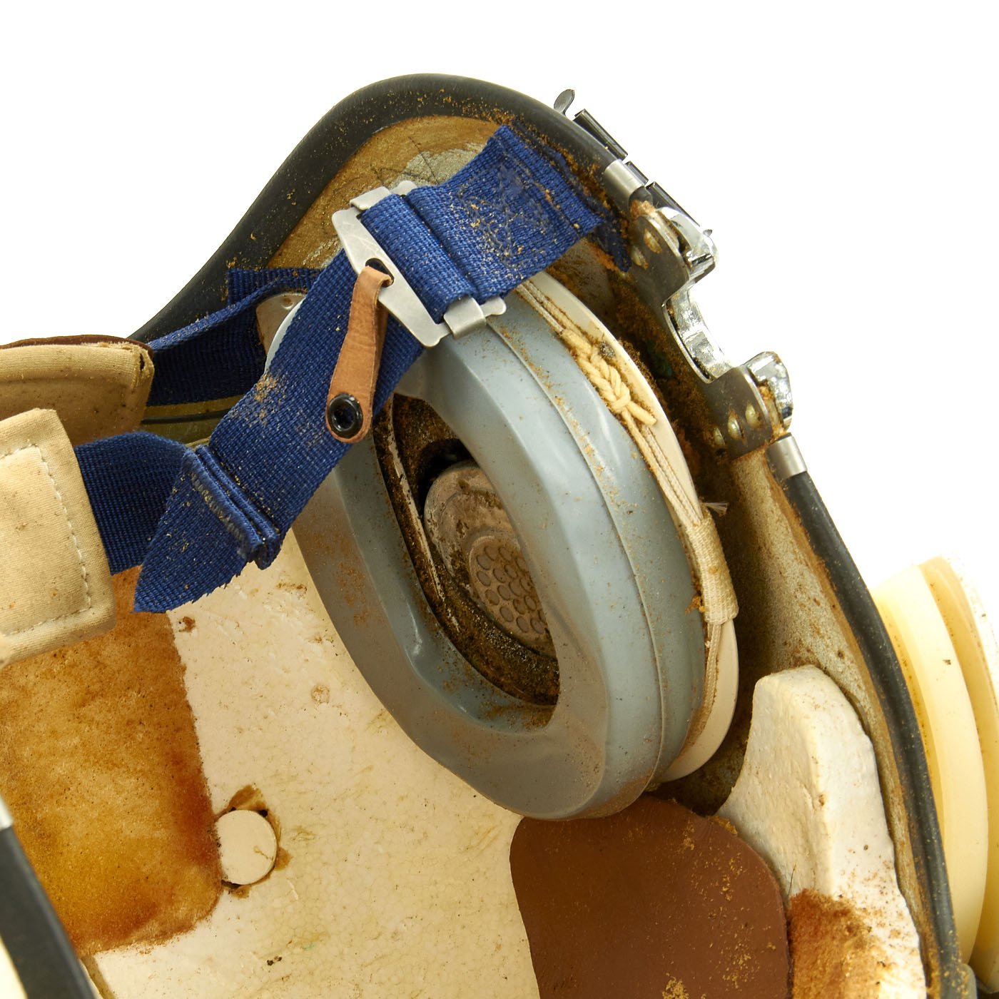 This example of a totally genuine APH-6B is offered in very good condition. It features a wonderful design with yellow and orange tape striped, a retractable tint visor and a retractable clear visor, internal earphones and boom mic. The foam from the liner is drying out and will dust if touched too much, but otherwise offered in great condition.