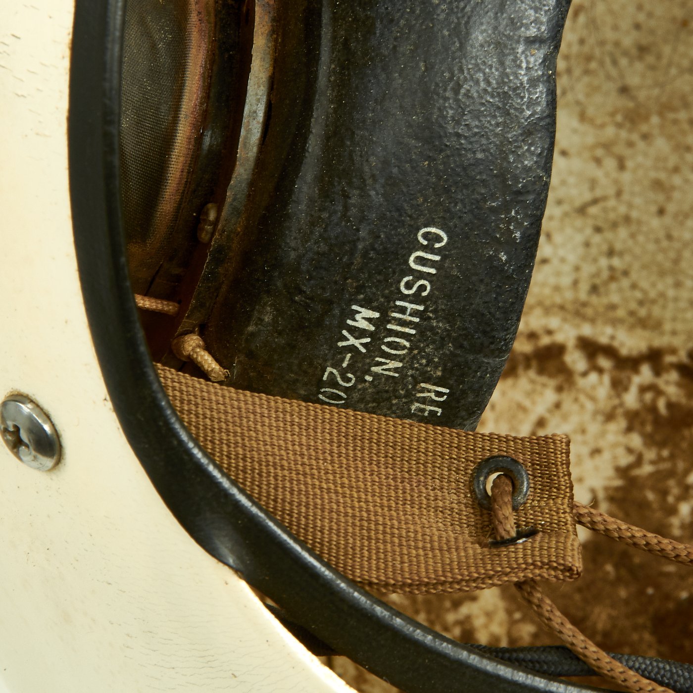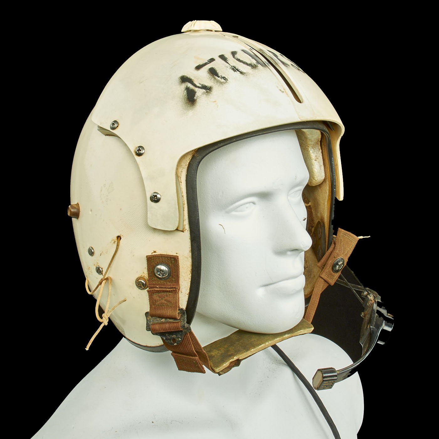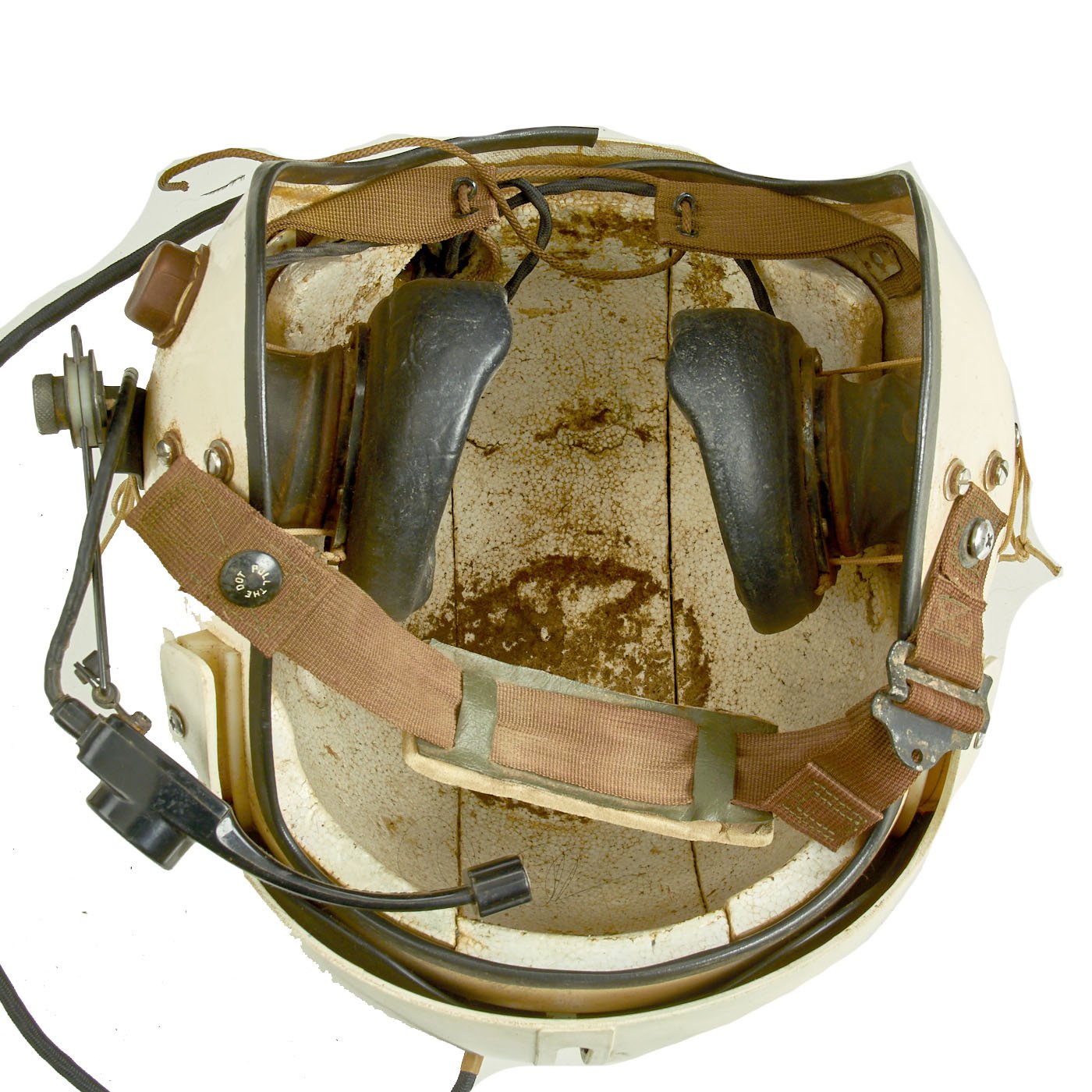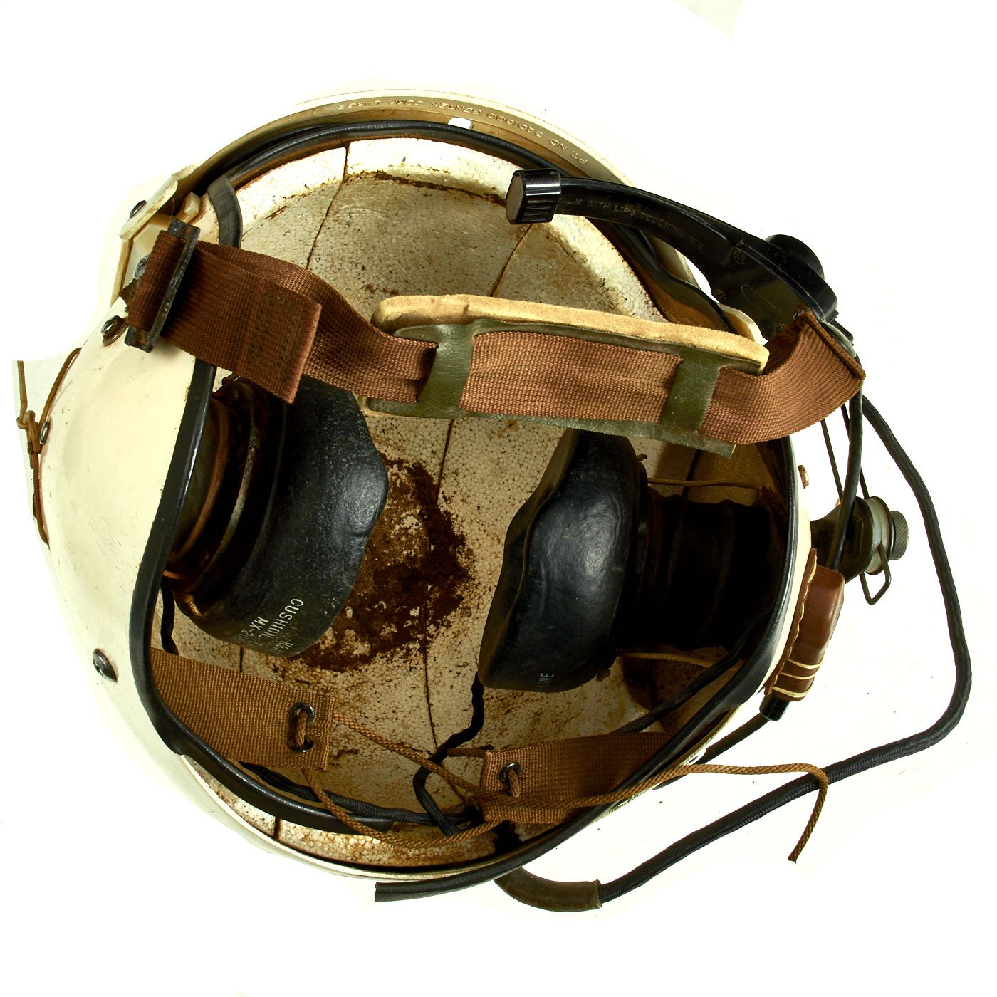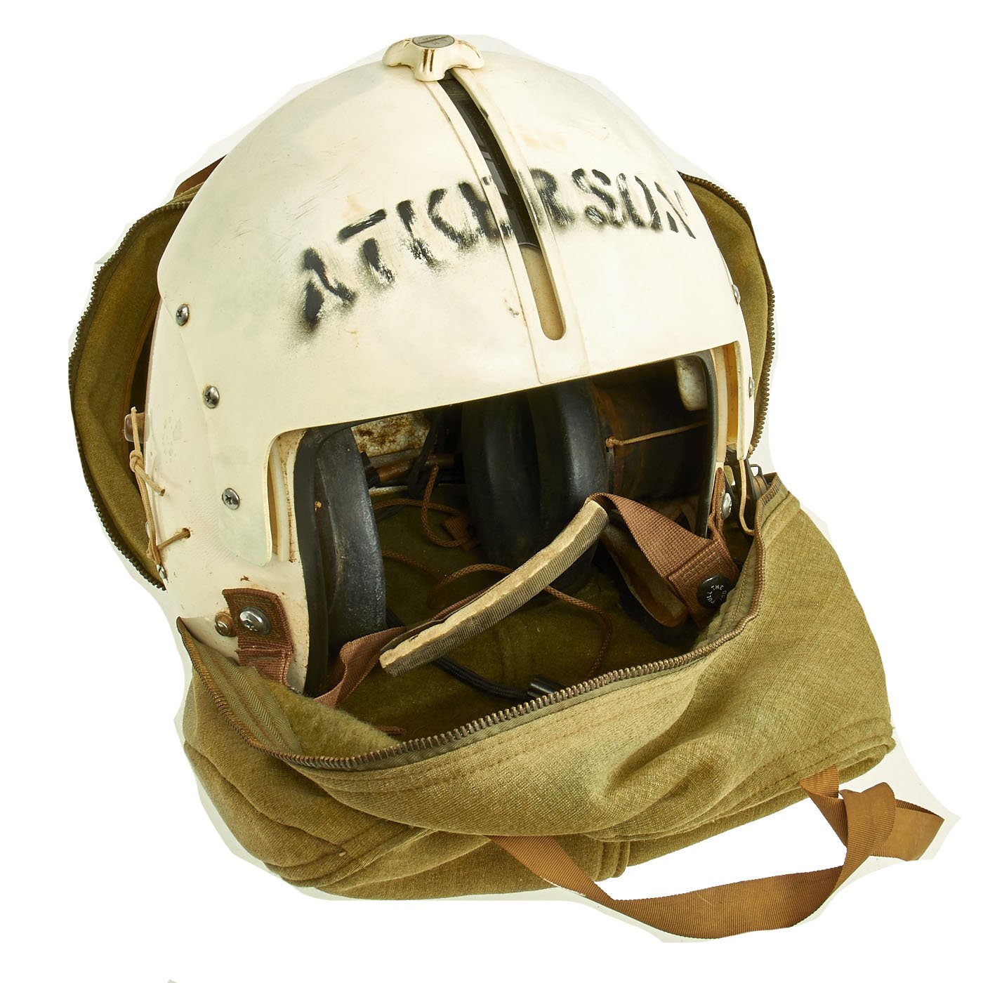 Original Item: Only One Available. This is a Vietnam War era United States Navy Helicopter Flight Helmet type APH-5 Helmet manufactured by GENTEX in size Large. The helmet is in overall very good condition with headset, boom mic, functional retractable tinted visor and felt storage bag with functional zipper. Interior helmet liner has been removed. The white Navy issue helmet is stenciled with black paint across the front ATKERSON. The original data tag is faded but still present inside the shell and reads: