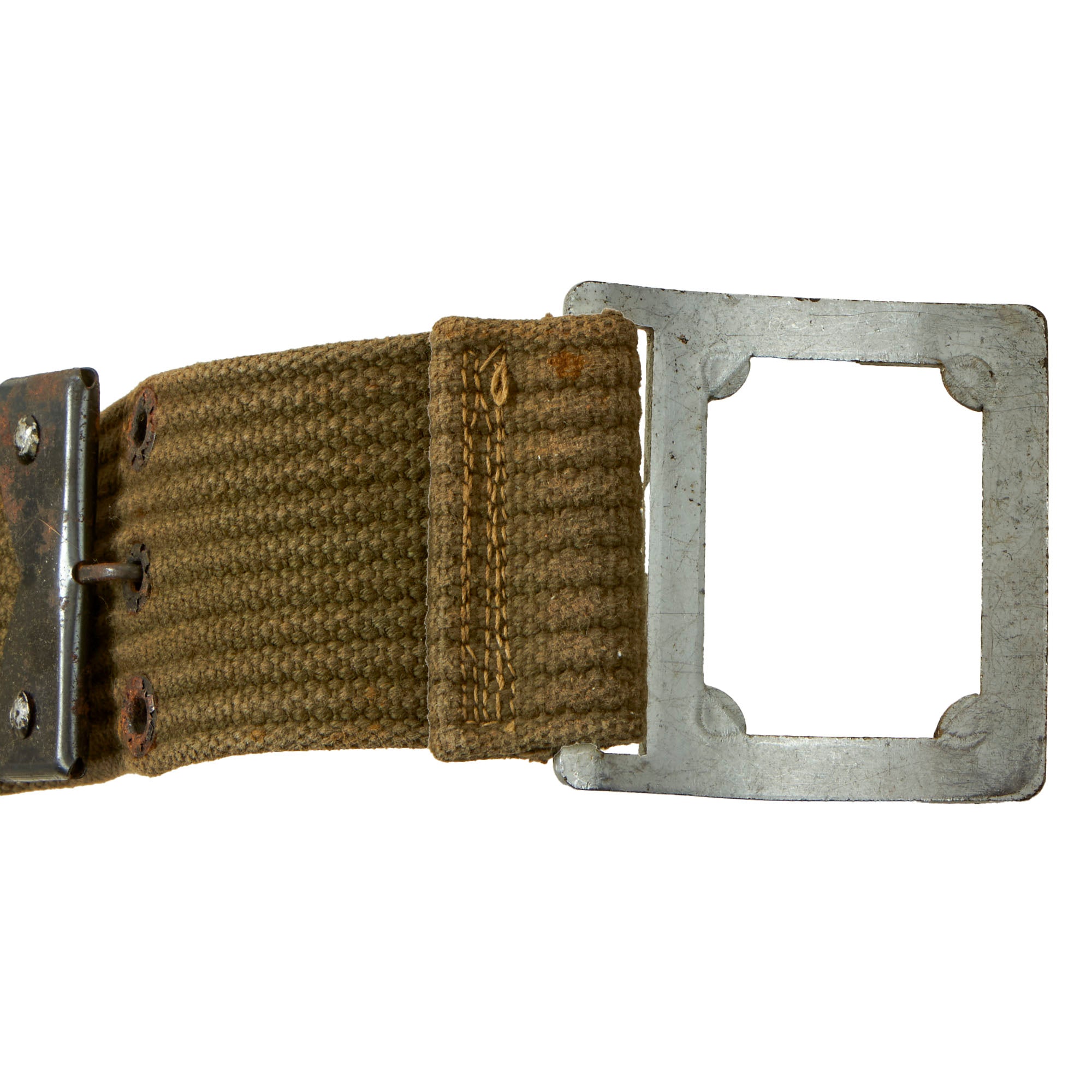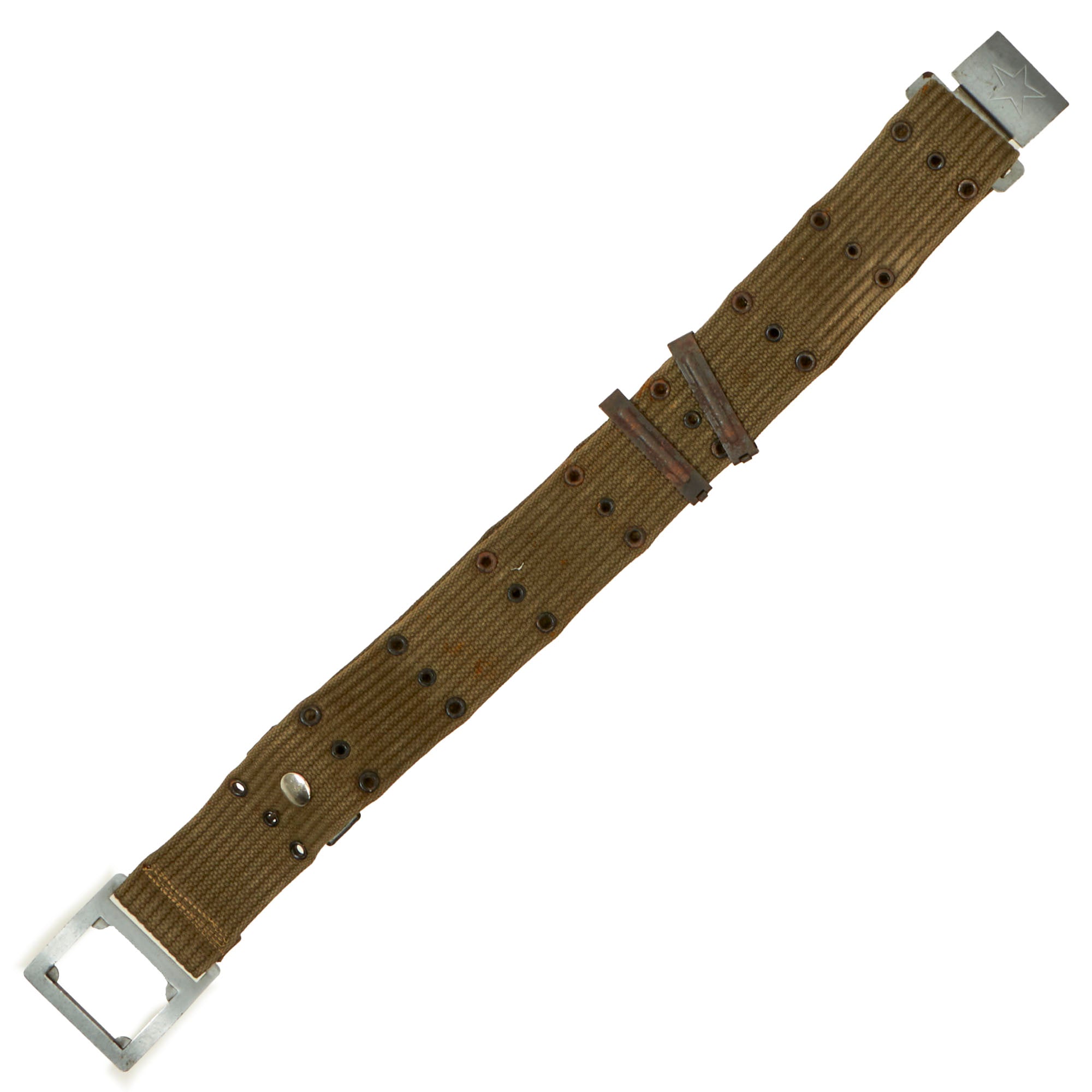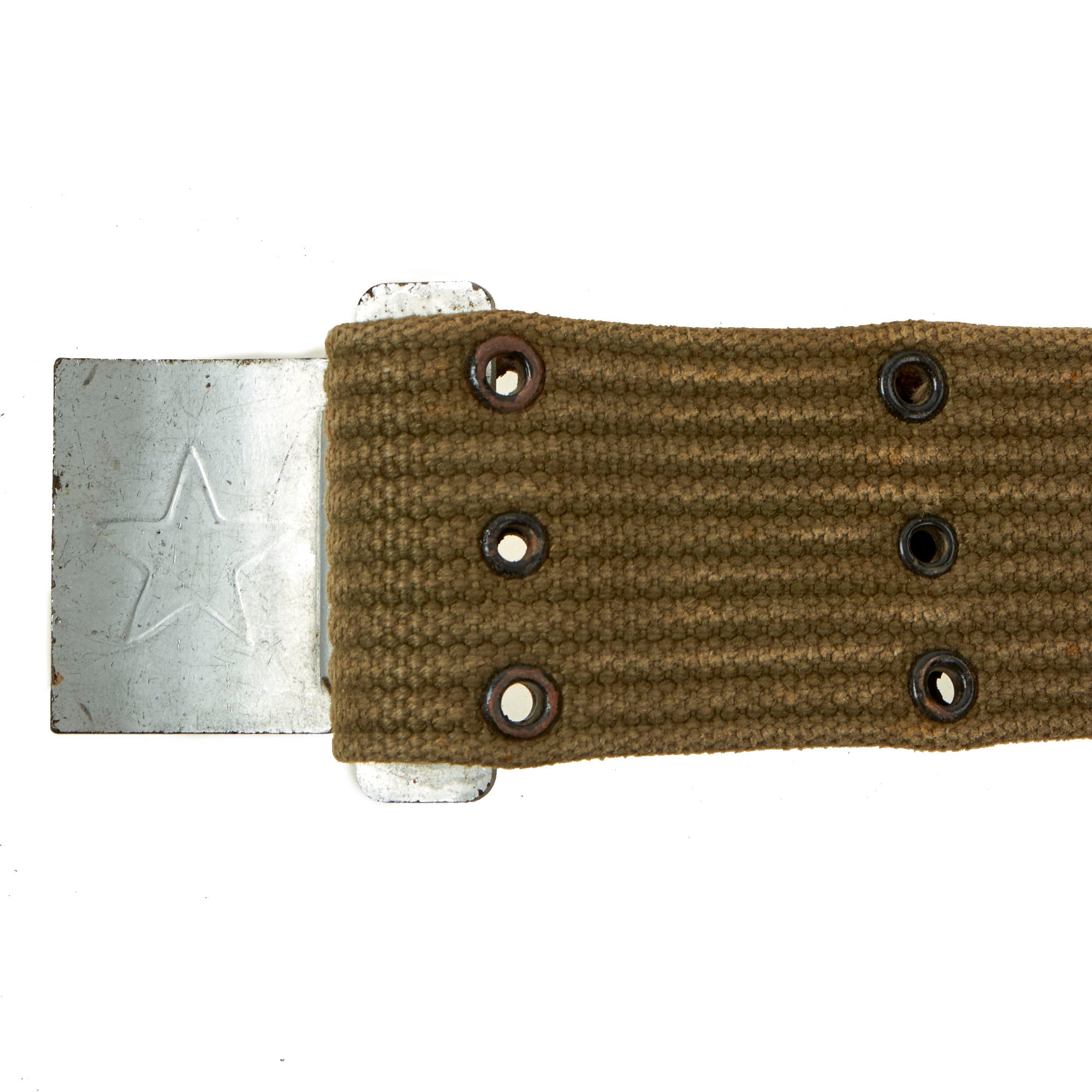 This is a wartime issued North Vietnamese Army belt with a steel buckle, in a design very reminiscent of the U.S. WWII Pistol Belt, with a plated steel snap for an ammo pouch. The canvas belt measures 24", when fully extended it will be a greater length, and has steel grommets, which show some minor staining and wear. The steel buckle is painted silver, which is still mostly present, with a few spots of paint loss and oxidation. The insert side of the buckle has the Communist five pointed star stamped to the center. The metal fittings of the belt have some heavy oxidation. There appears to be a name or location written on the belt itself, CHI-AID?
