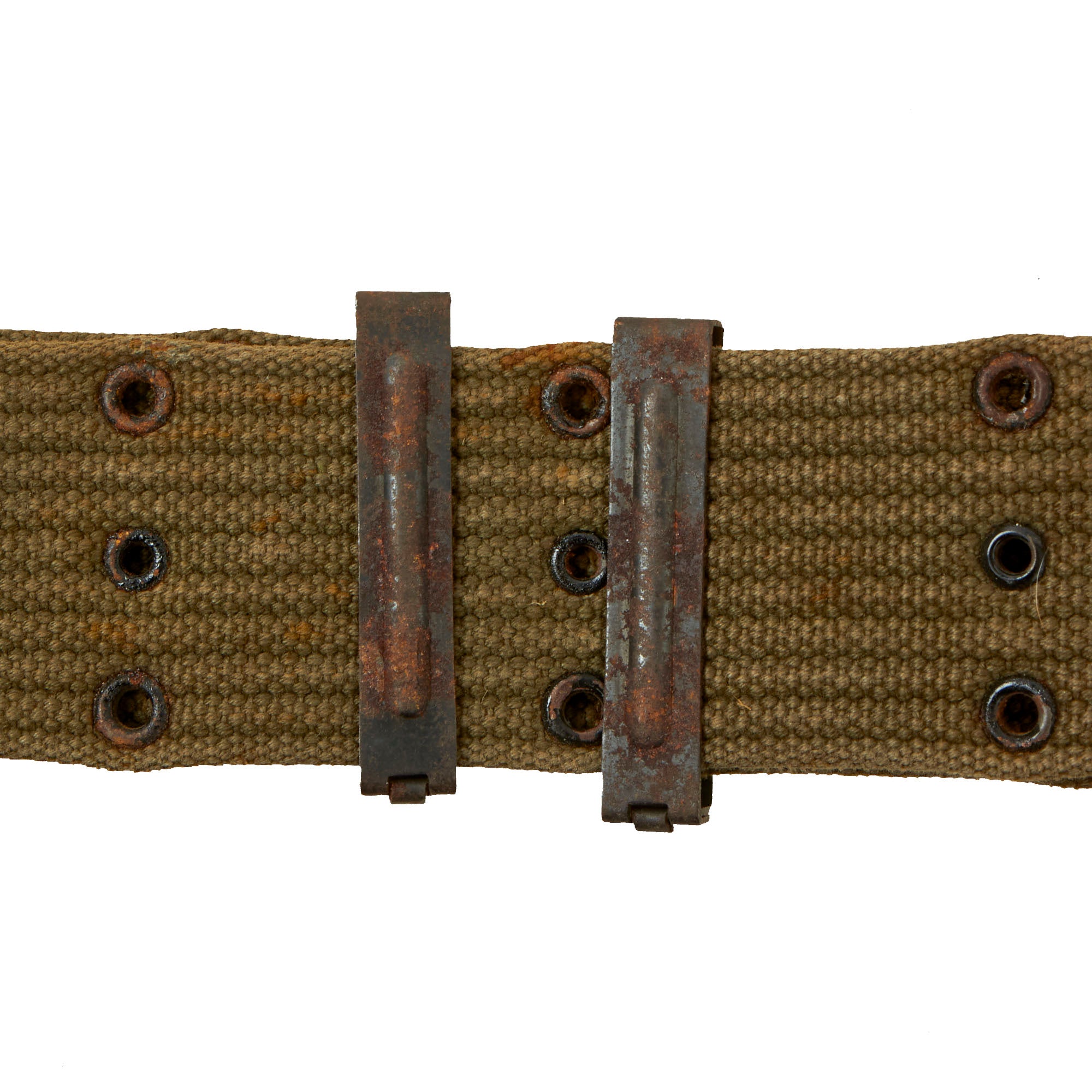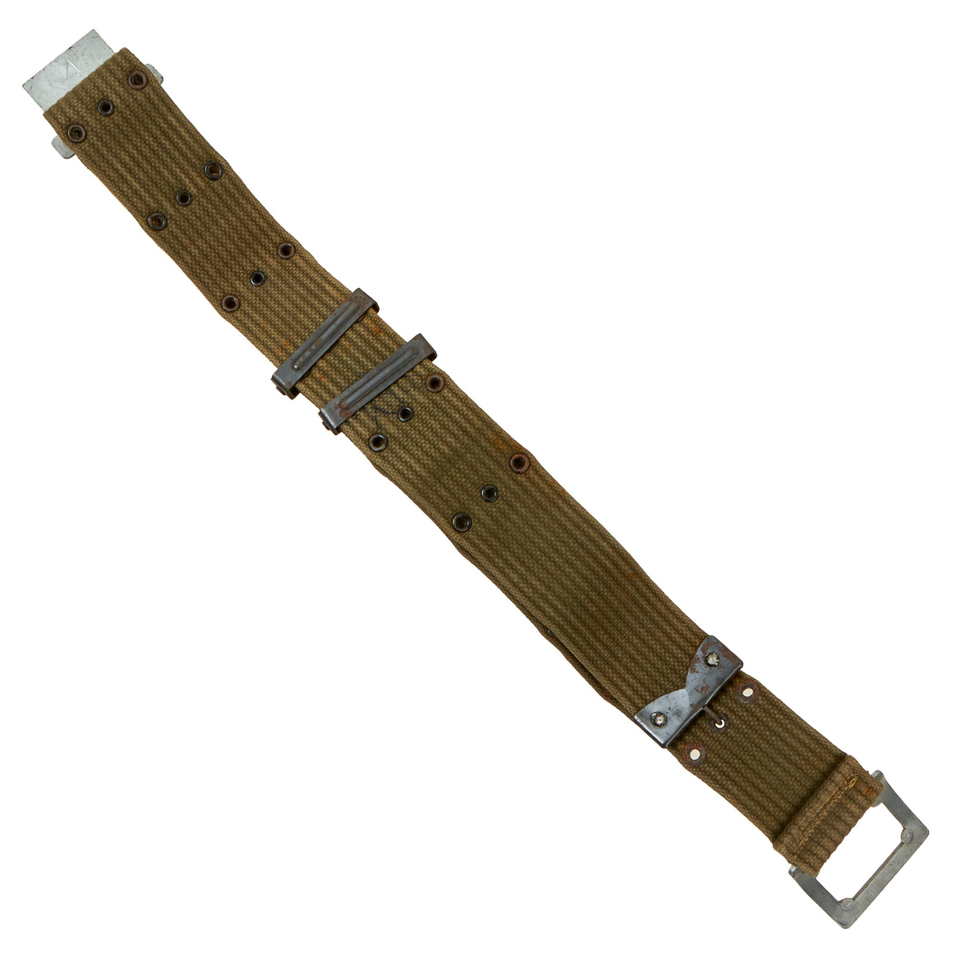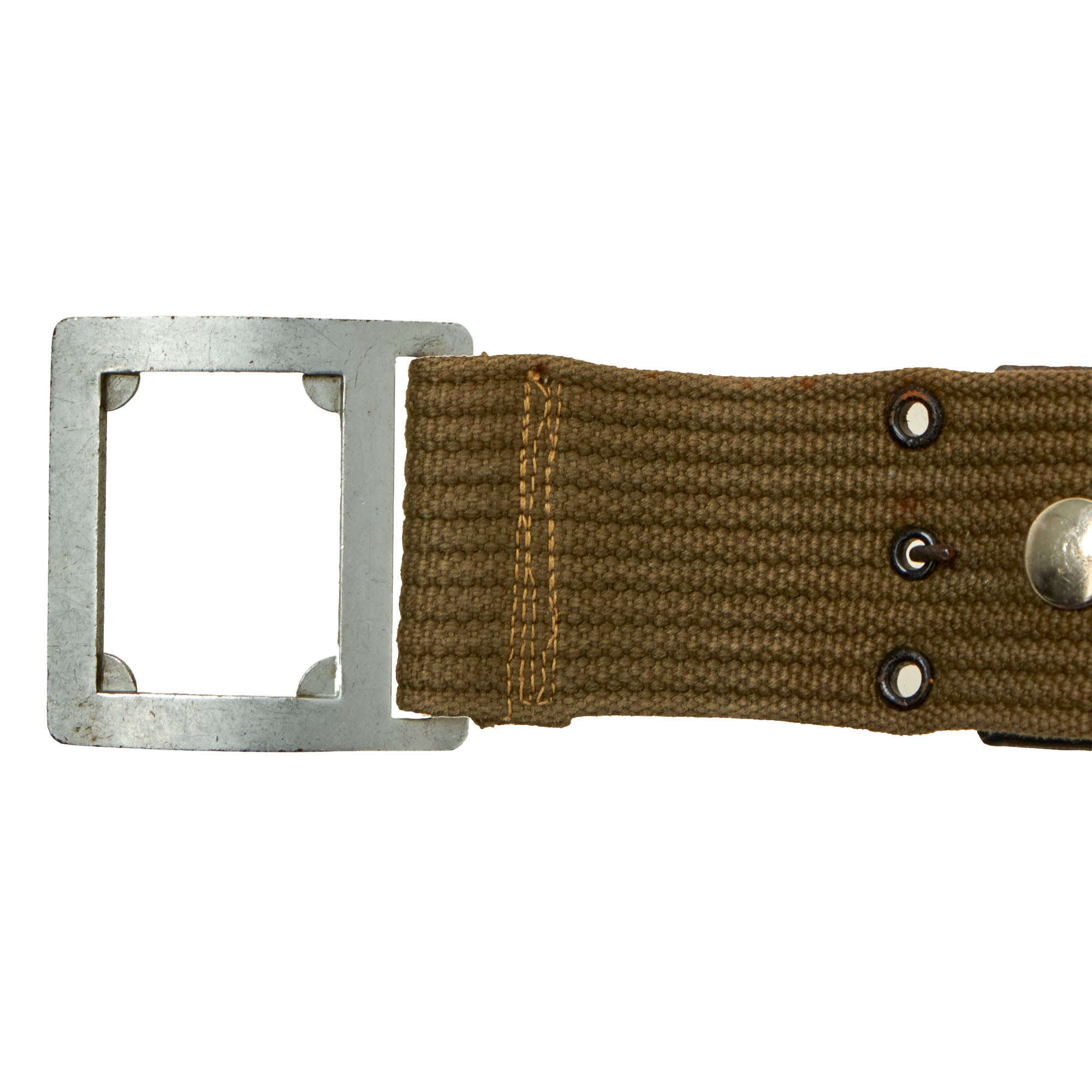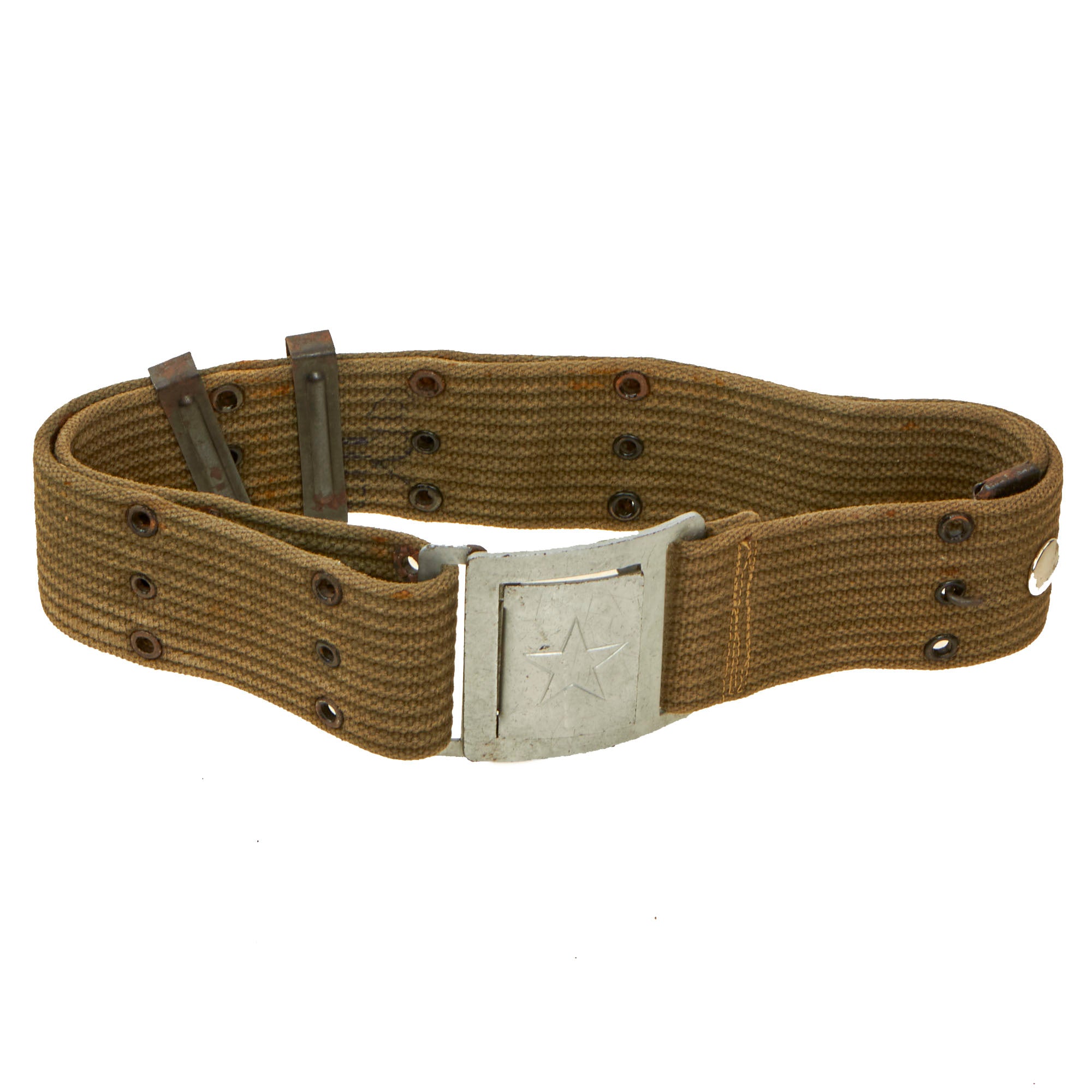 This is a wartime issued North Vietnamese Army belt with a steel buckle, in a design very reminiscent of the U.S. WWII Pistol Belt, with a plated steel snap for an ammo pouch. The canvas belt measures 24", when fully extended it will be a greater length, and has steel grommets, which show some minor staining and wear. The steel buckle is painted silver, which is still mostly present, with a few spots of paint loss and oxidation. The insert side of the buckle has the Communist five pointed star stamped to the center. The metal fittings of the belt have some heavy oxidation. There appears to be a name or location written on the belt itself, CHI-AID?