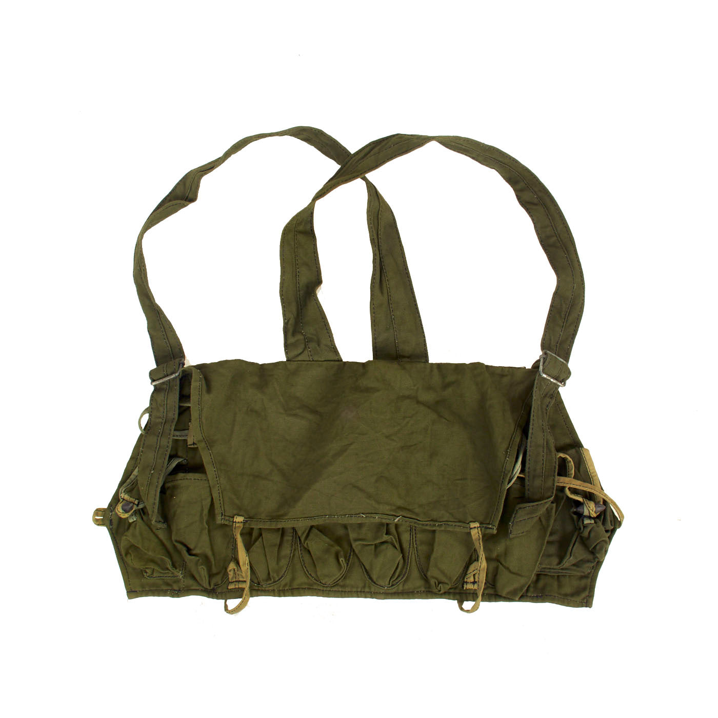 - Vietnamese Made Chest Rig: It is a fact that Hanoi made some of its own field gear. This was documented in various issues of the MACV’s Combined Material Exploitation Center (CMEC) circular entitled ST66-24. This publication, sent monthly to various field commands in Vietnam, documented recently captured NVA and VC equipment. On occasion CMEC would identify that a particular item was made in North Vietnam. The publication had a picture on one page opposite a short synopsis of the material with a conclusion about its construction and quality. The rig is in excellent condition and does appear to be complete without any significant damage.