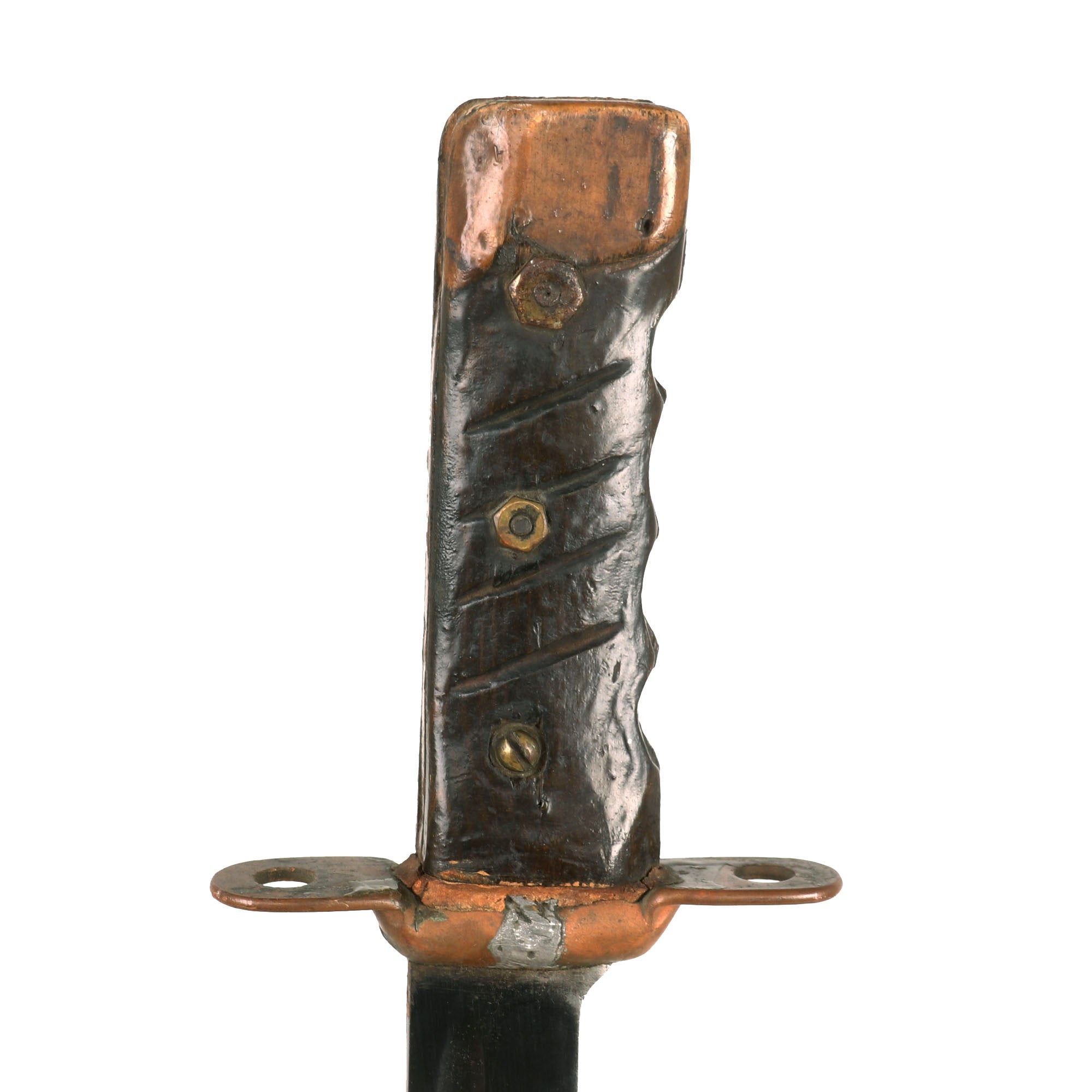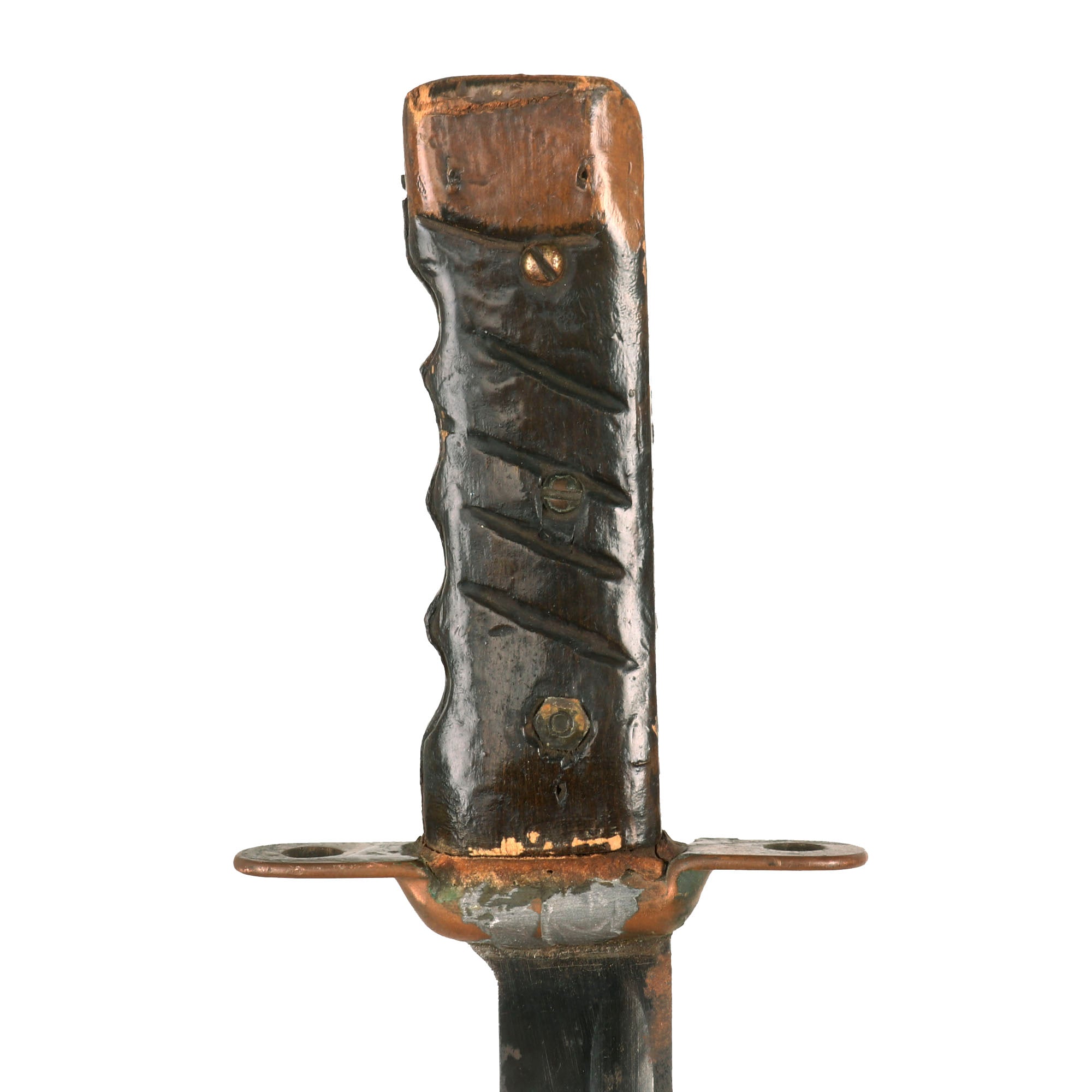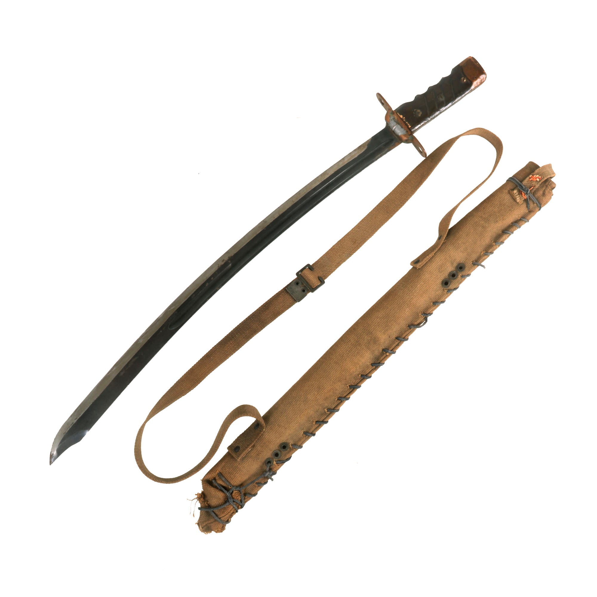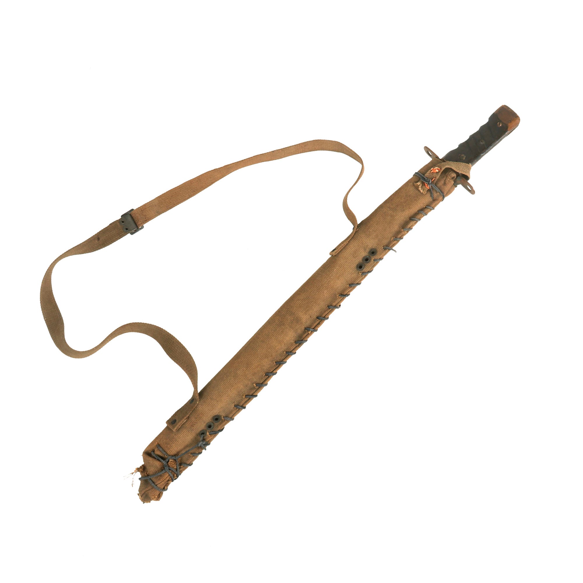 - Klewang Style Sword/Machete With Canvas “Theater Made” Scabbard: This 30 inch edged weapon was used for brush clearing and or combat operations. The blade does have the appearance having been taken from a Dutch KNIL M-1898/1911 Klewang Cutlass, though lack of information and markings on the blade itself makes it difficult to determine the origin. It is in wonderful condition and has a 5 ¾” “field replaced” hilt assembly.