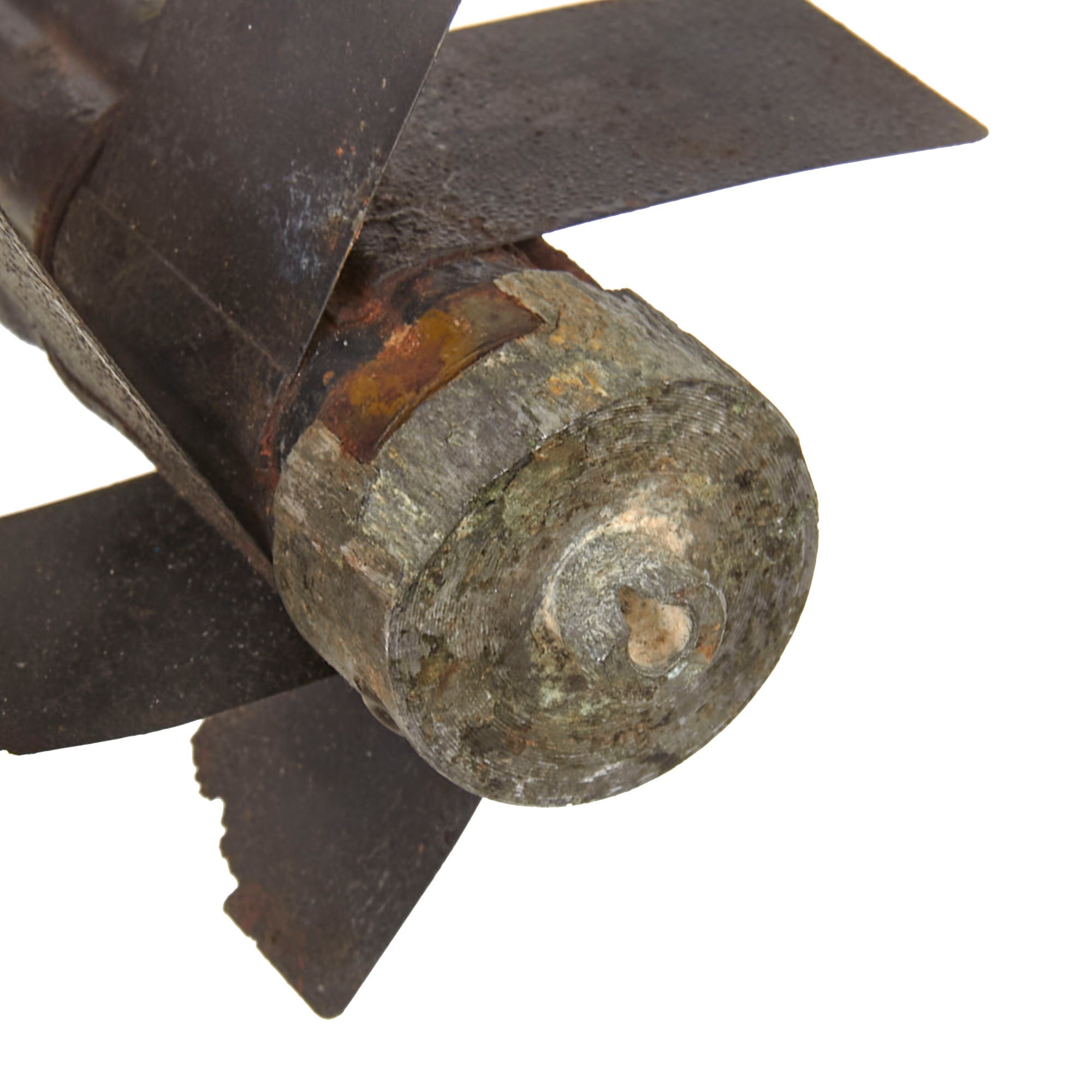 This example is painted black, and appears to retain its original paint, with heavy wear from oxidation chipping much of the paint. The round measures roughly 19¾” long and retains its tail fin assembly, with five of the six original fins retained, the sixth having broken off long ago.