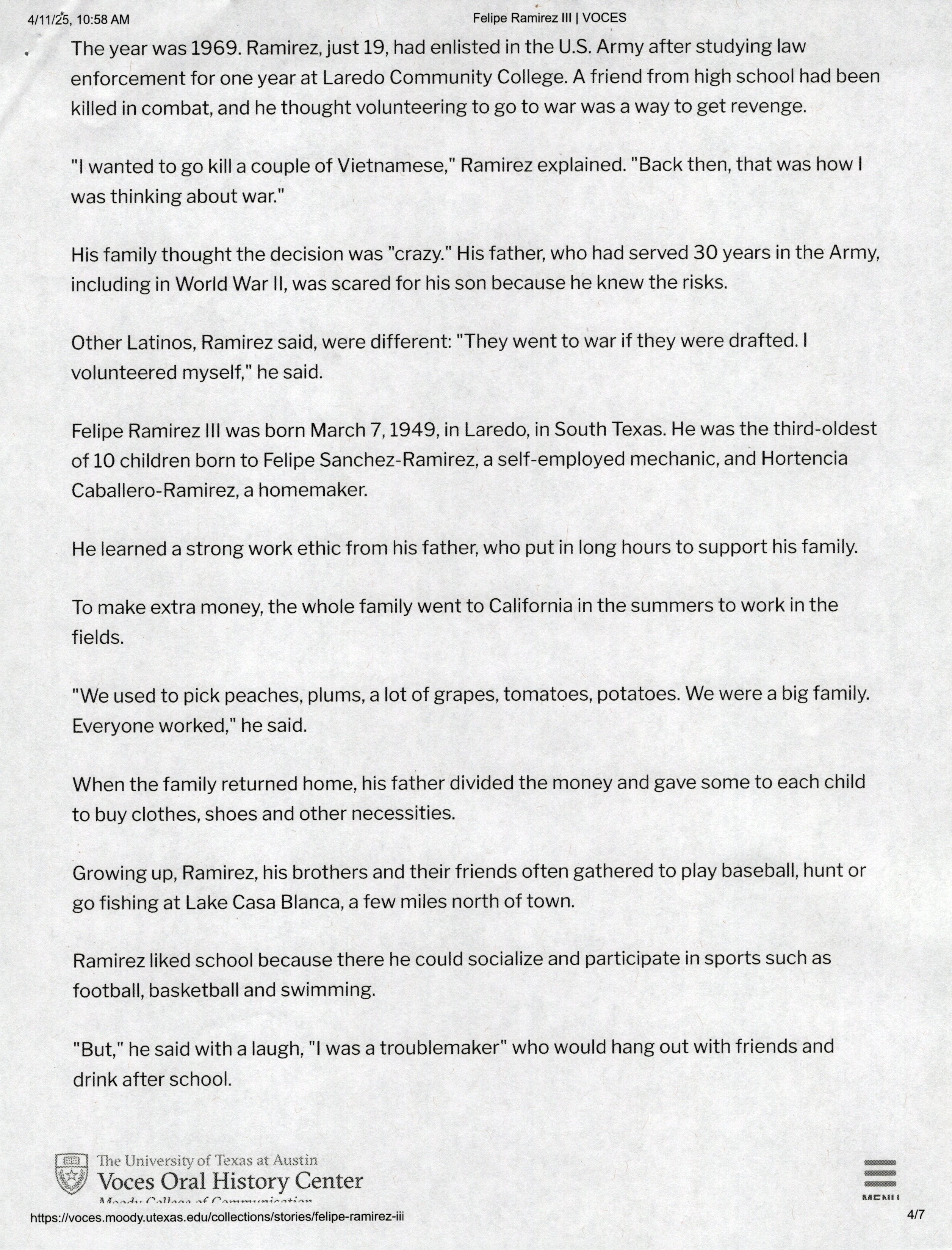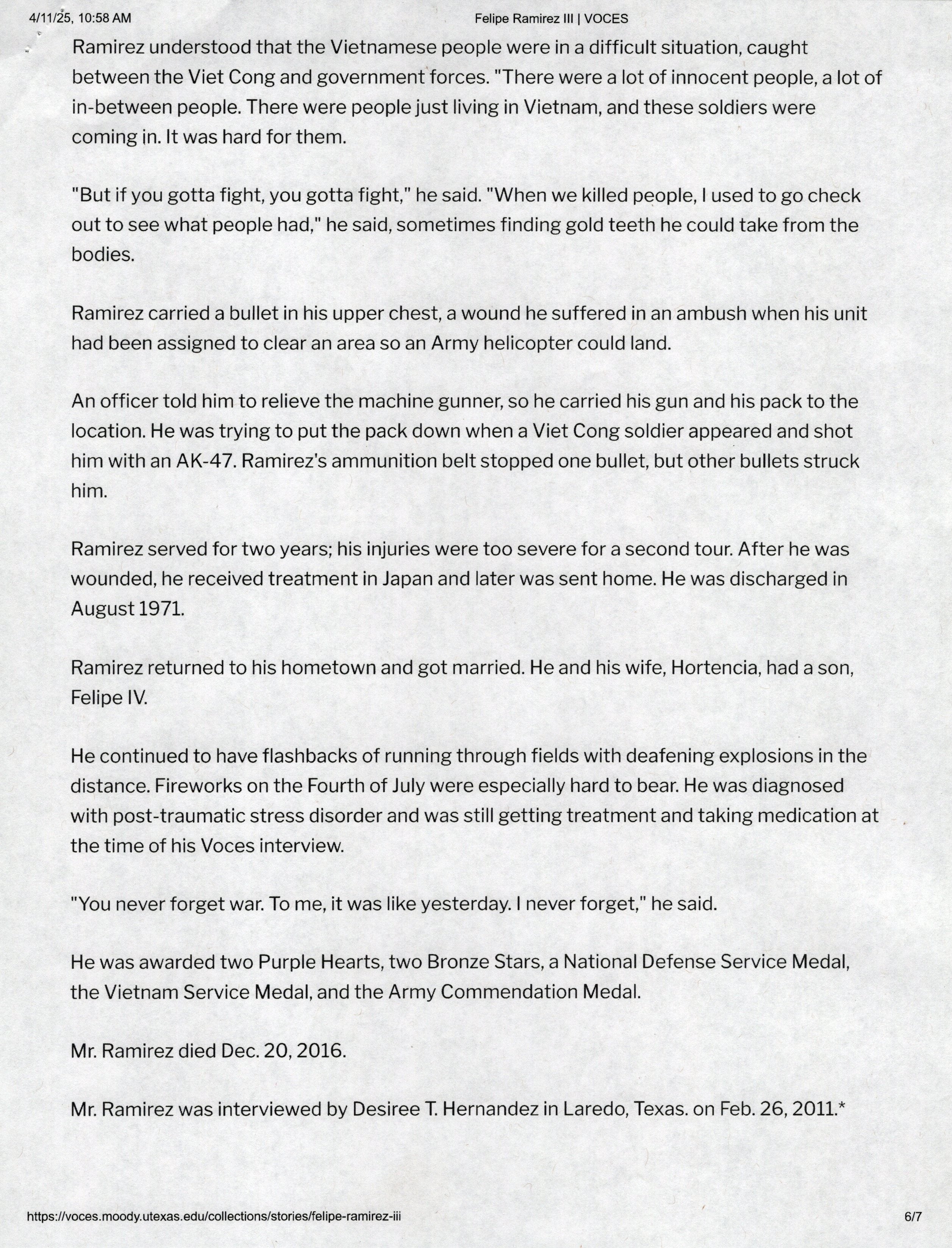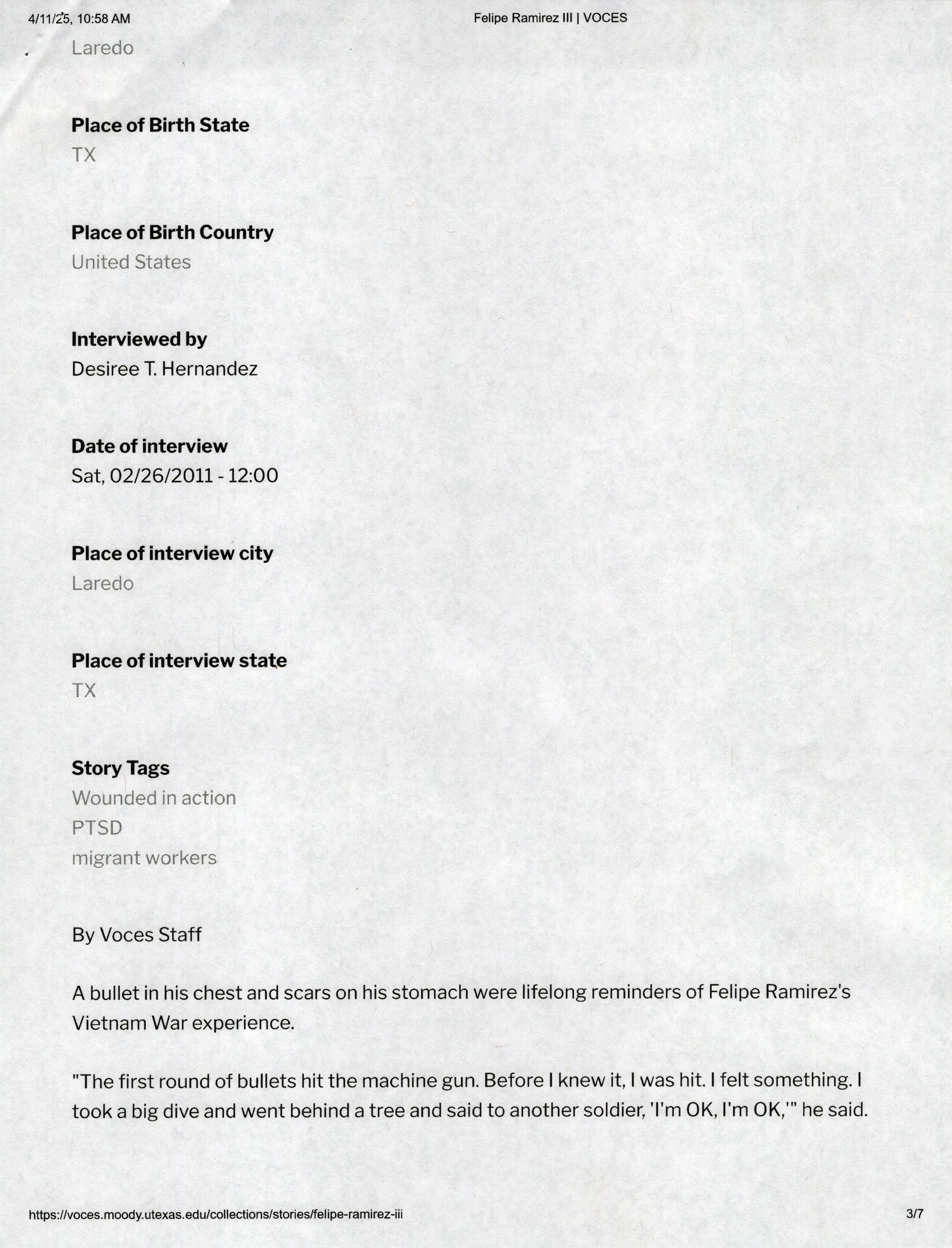 Ramirez was born on March 7th, 1949 in Laredo, Texas. The interview was taken on February 26th, 2011. It starts with “A bullet in his chest and scars on his stomach were lifelong reminders of Felipe Ramirez’s Vietnam War experience. The first round of bullets hit the machine gun. Before I knew it, I was hit. I felt something. I took a big dive and went behind a tree and said to another soldier, “I’m OK, I’m OK”.