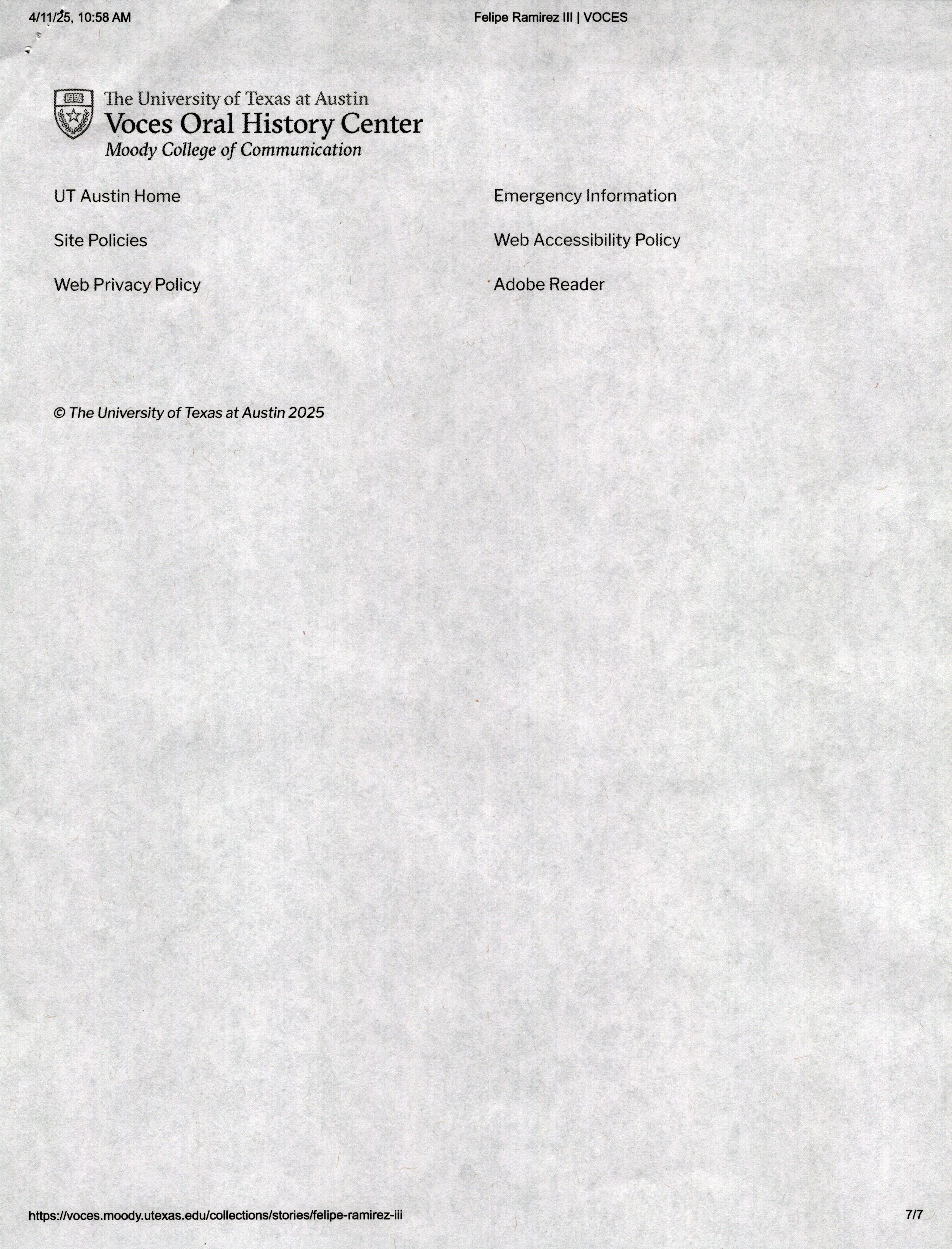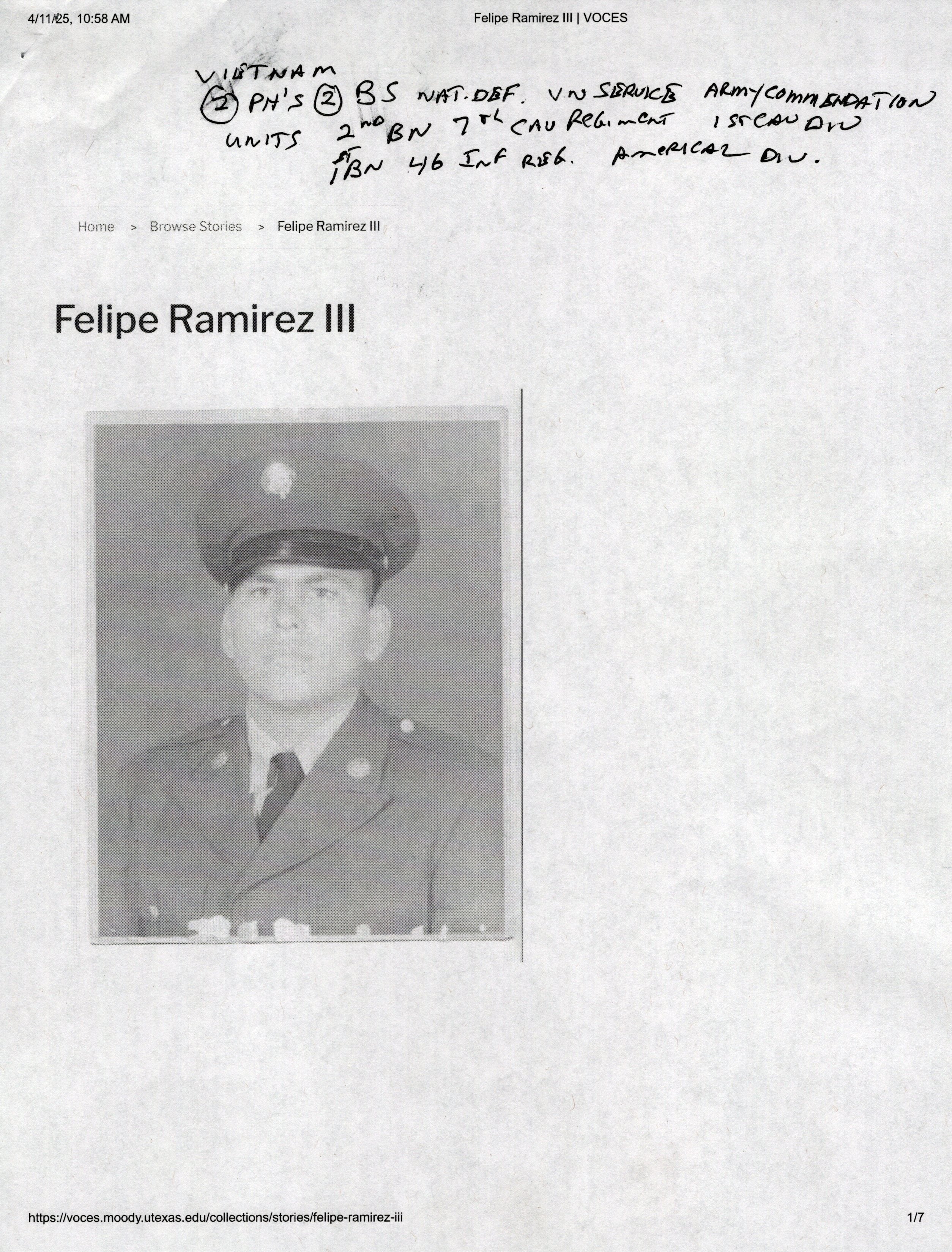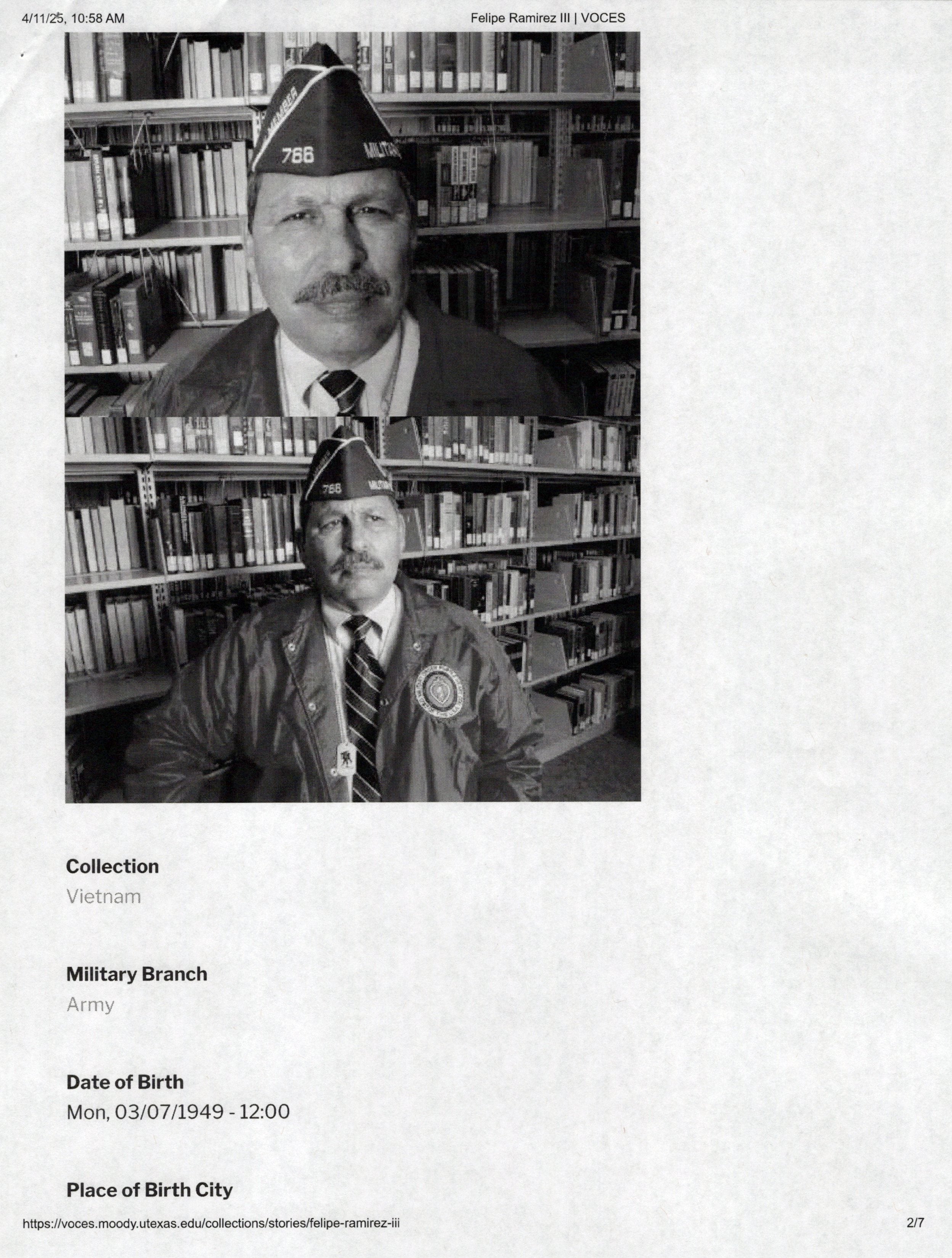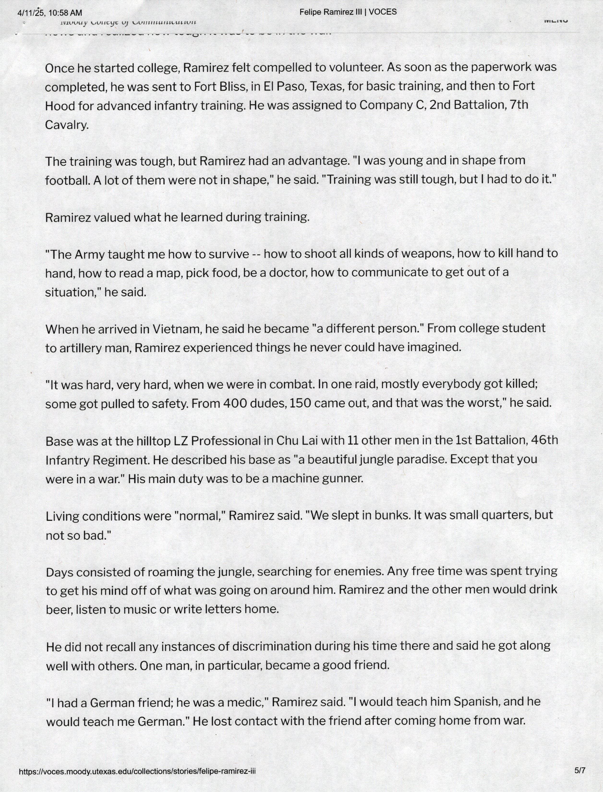 Ramirez was born on March 7th, 1949 in Laredo, Texas. The interview was taken on February 26th, 2011. It starts with “A bullet in his chest and scars on his stomach were lifelong reminders of Felipe Ramirez’s Vietnam War experience. The first round of bullets hit the machine gun. Before I knew it, I was hit. I felt something. I took a big dive and went behind a tree and said to another soldier, “I’m OK, I’m OK”.