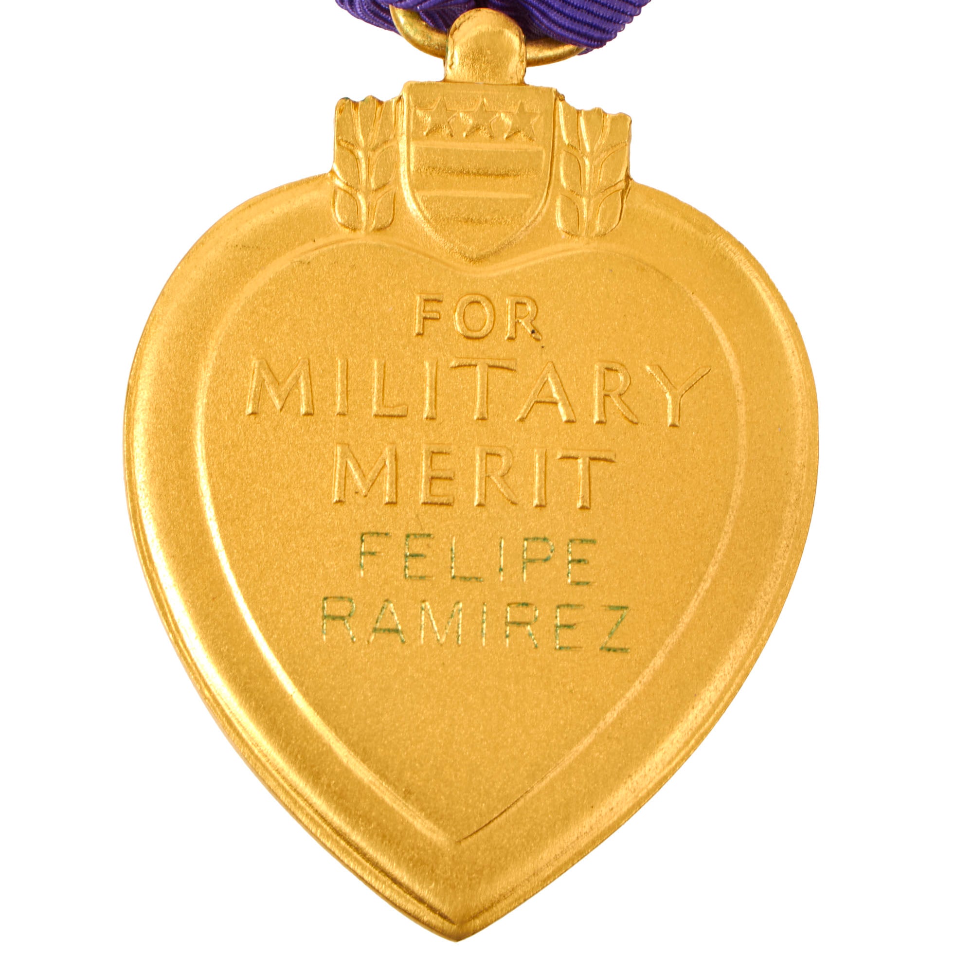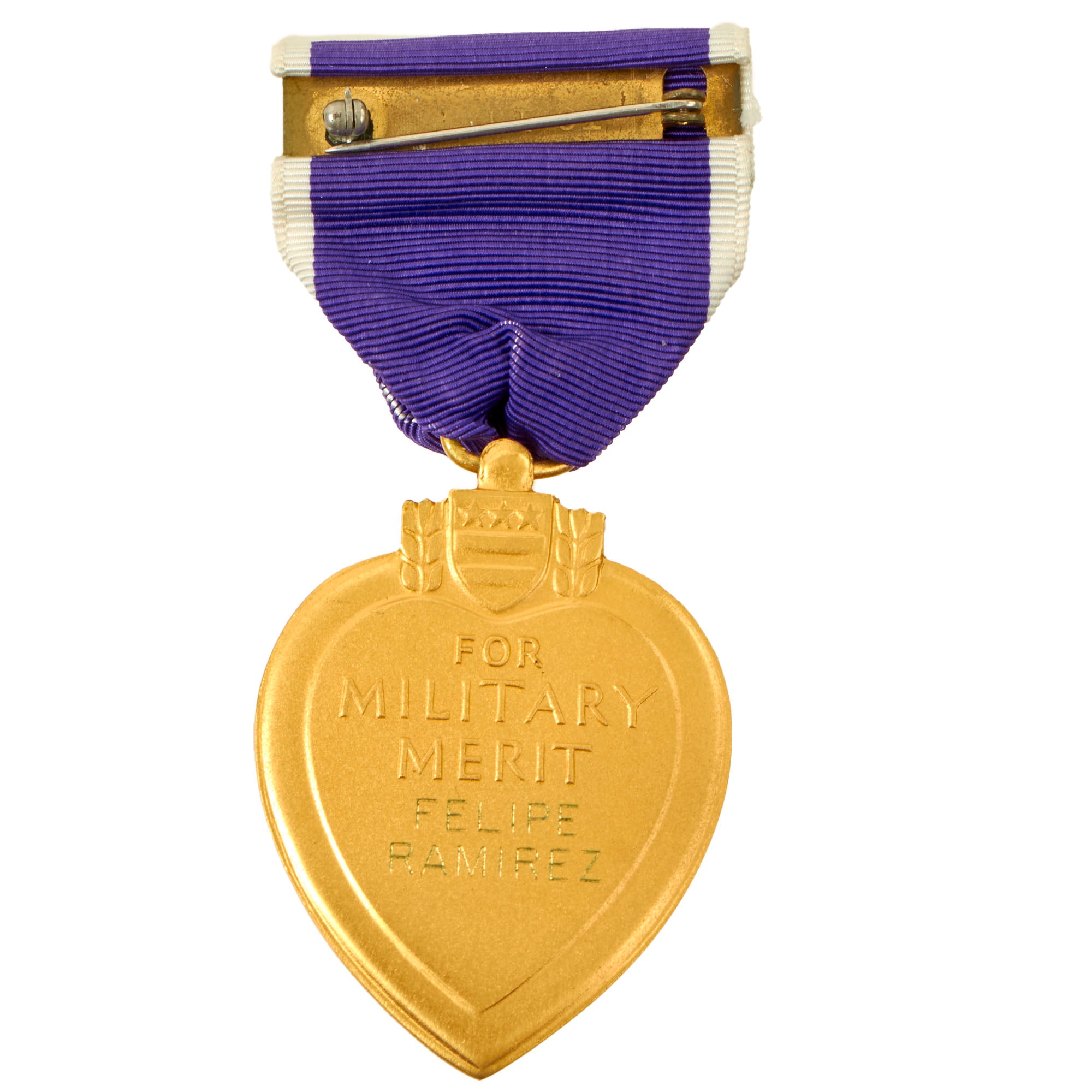 Original Item. One-of-a-Kind. This is a tremendous example of a Purple Heart, especially intriguing due to the printed research and interview that comes with it. It’s named to Felipe Ramirez, who served with the 2nd Battalion, 7th Cavalry Regiment and the 1st Battalion, 46th Infantry Regiment, Americal Division. Ramirez was awarded two Purple Heart Medals and two Bronze Star Medals.