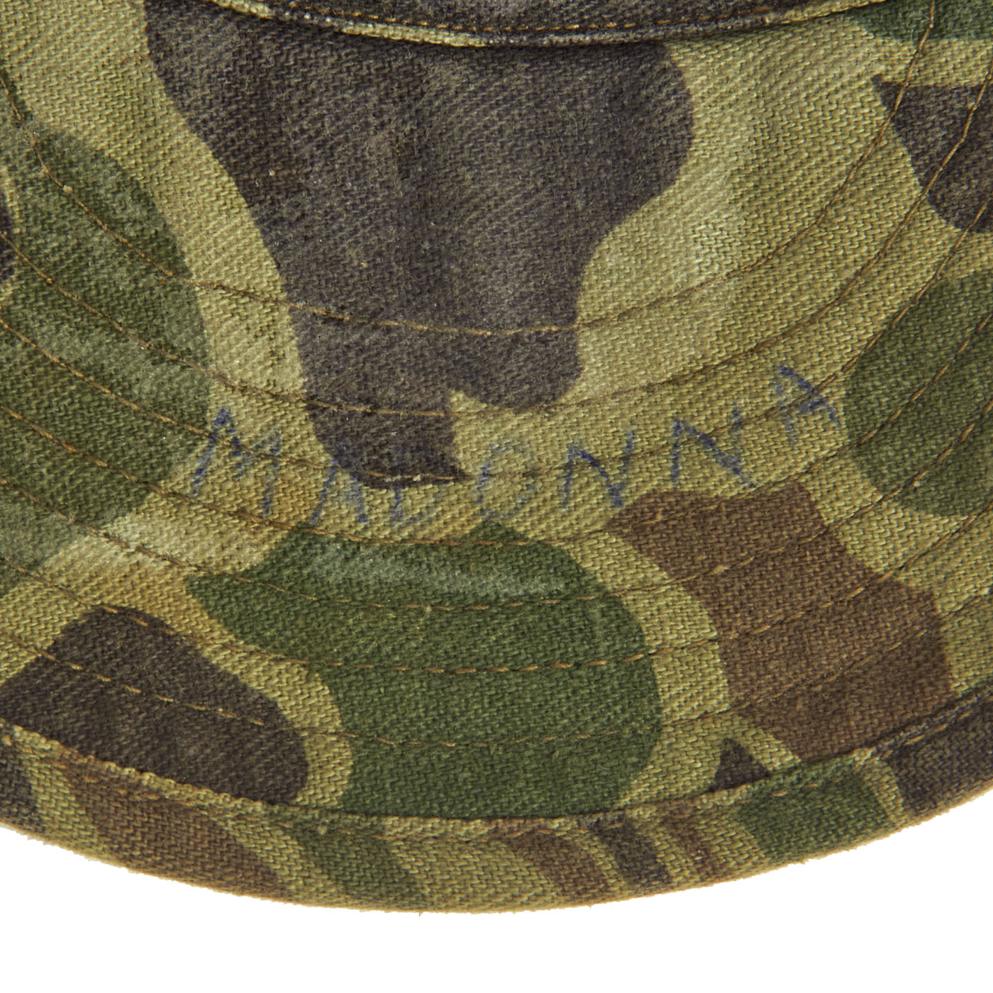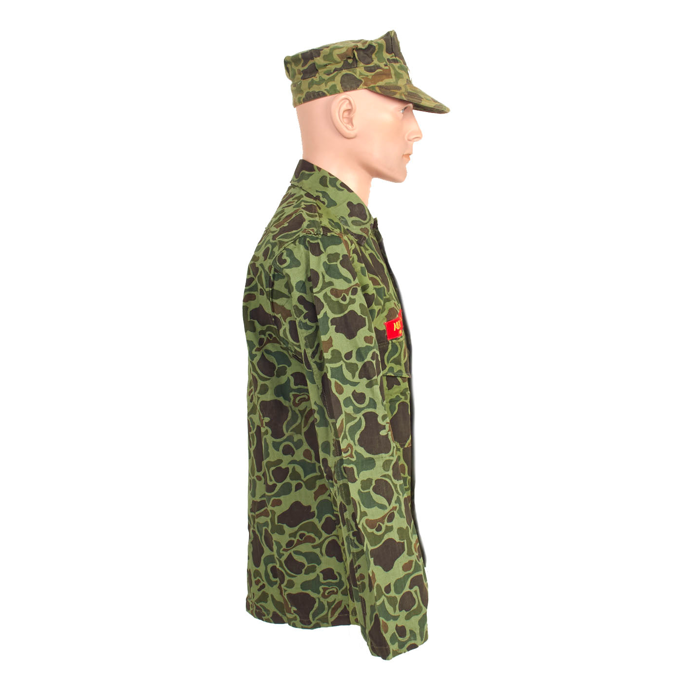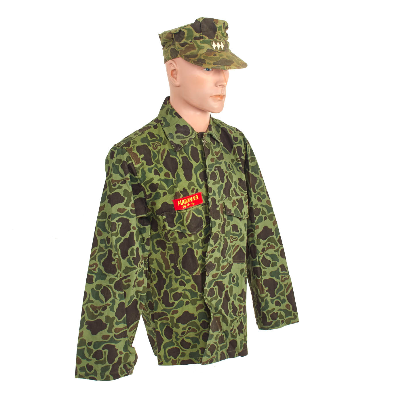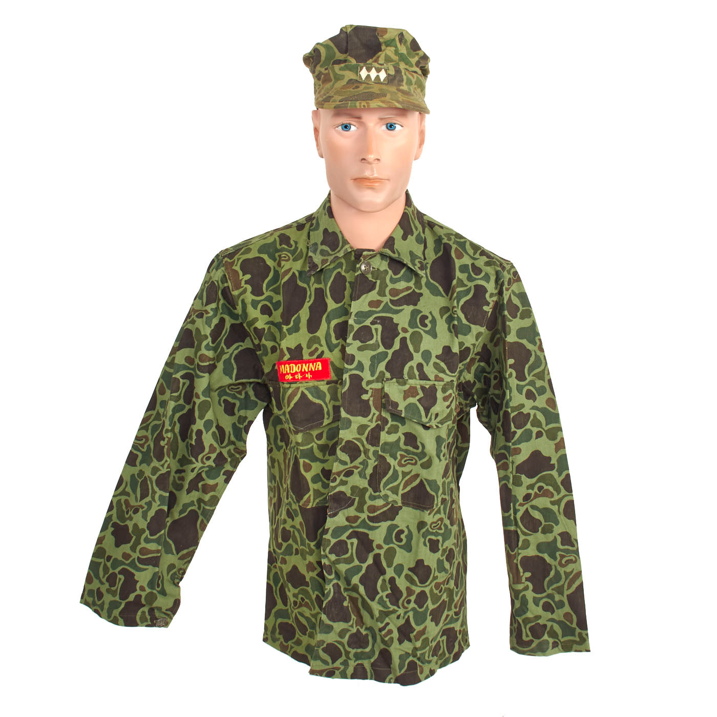 This uniform set is for an American officer advisor to Republic of Korea (ROK) troops that were sent to Vietnam during the war. The jacket, pants and hat are matching South Korean camouflage camouflage. The uniform is constructed of a lightweight cotton. The jacket has a red embroidered MADDONA name tape, 4-button closure, two front pockets (with single-button flaps) and Marine Corps style field cap with 4 vent holes and rank insignia to front. The name Maddon is spelled in ink on the underside of the brim.