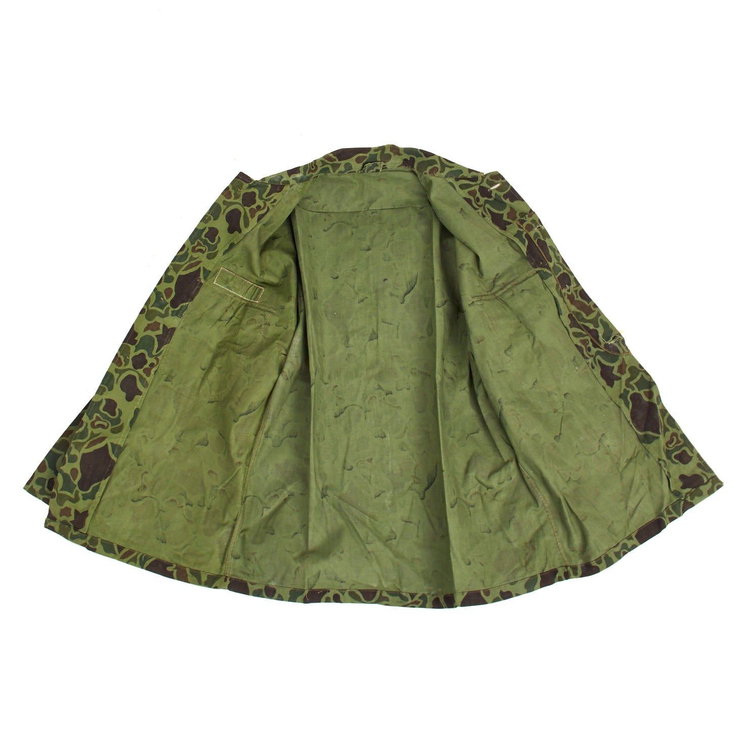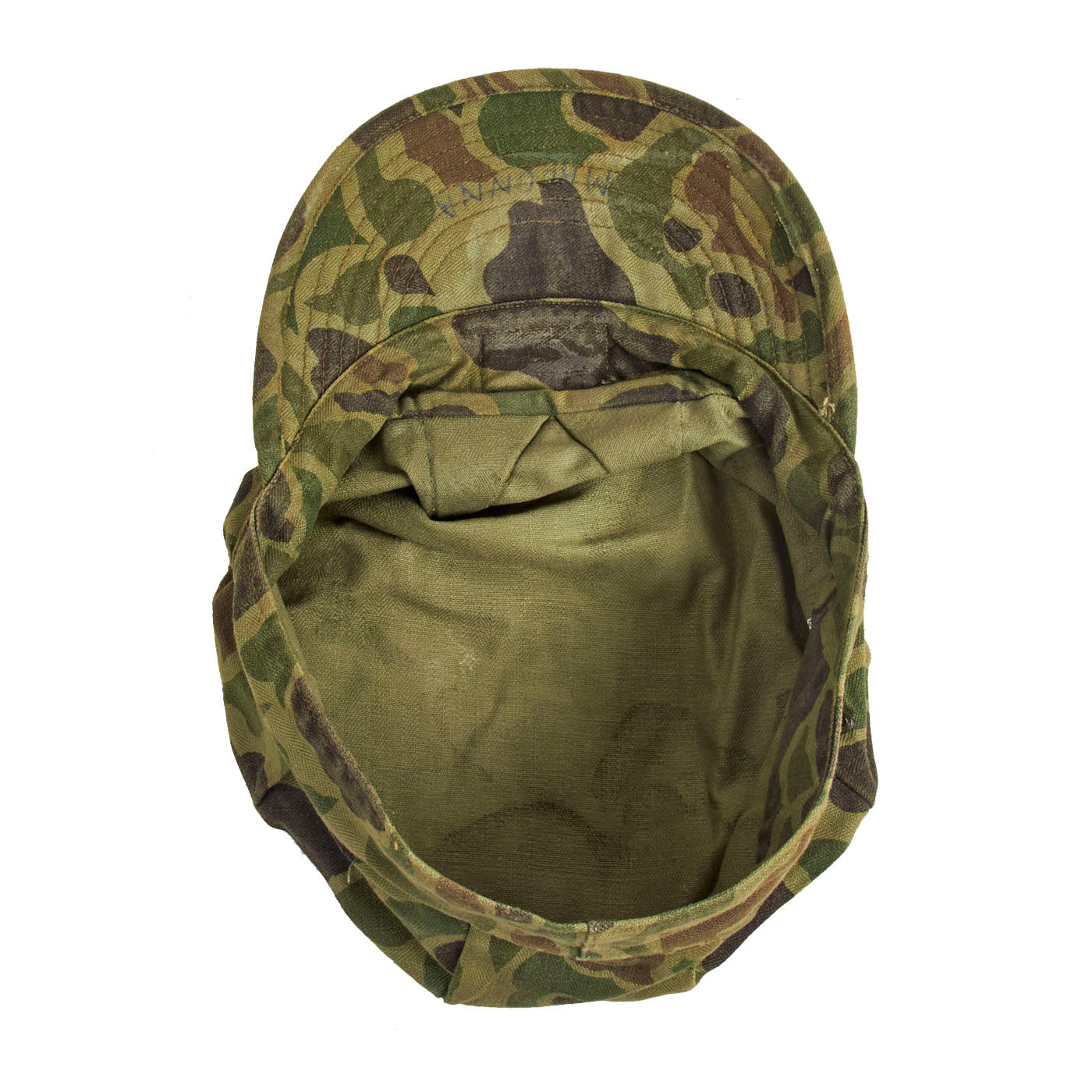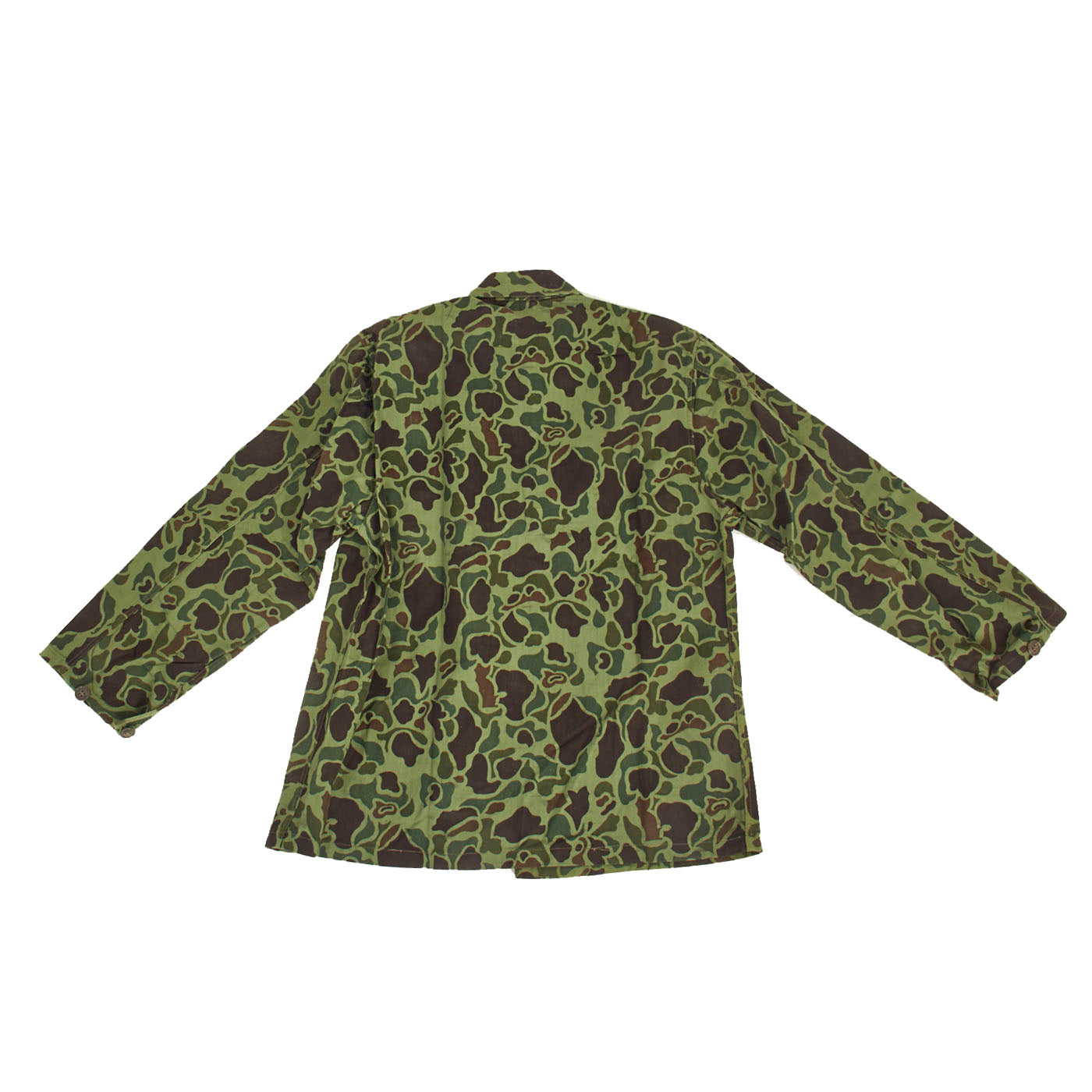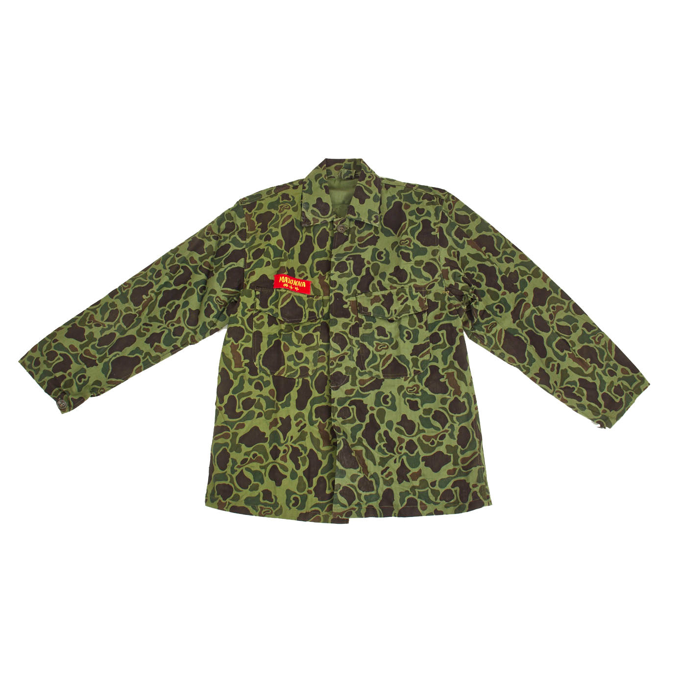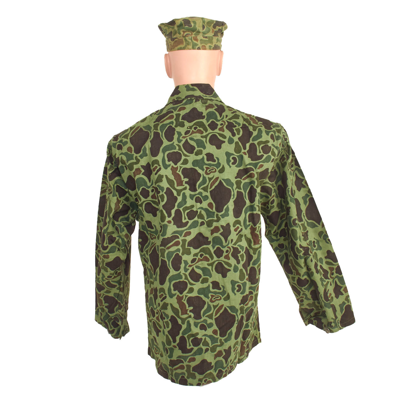This uniform set is for an American officer advisor to Republic of Korea (ROK) troops that were sent to Vietnam during the war. The jacket, pants and hat are matching South Korean camouflage camouflage. The uniform is constructed of a lightweight cotton. The jacket has a red embroidered MADDONA name tape, 4-button closure, two front pockets (with single-button flaps) and Marine Corps style field cap with 4 vent holes and rank insignia to front. The name Maddon is spelled in ink on the underside of the brim.