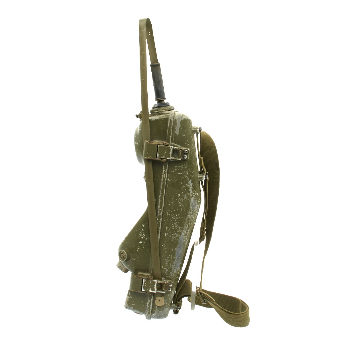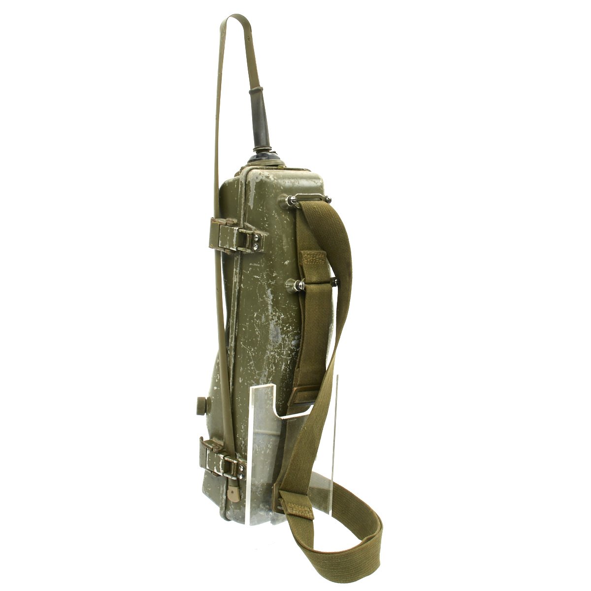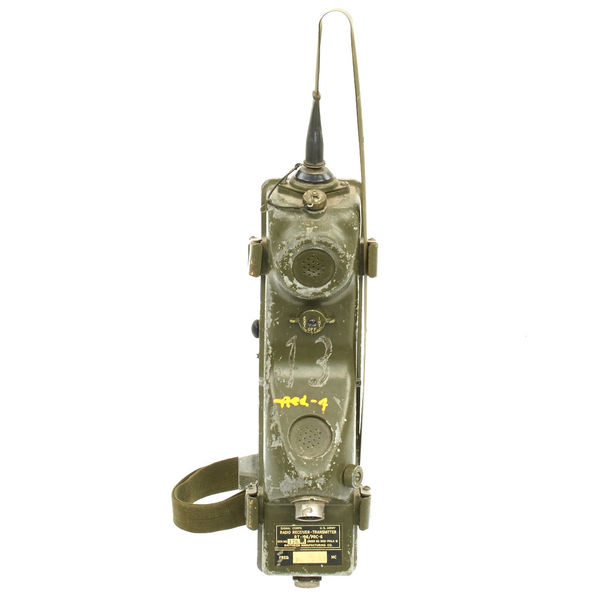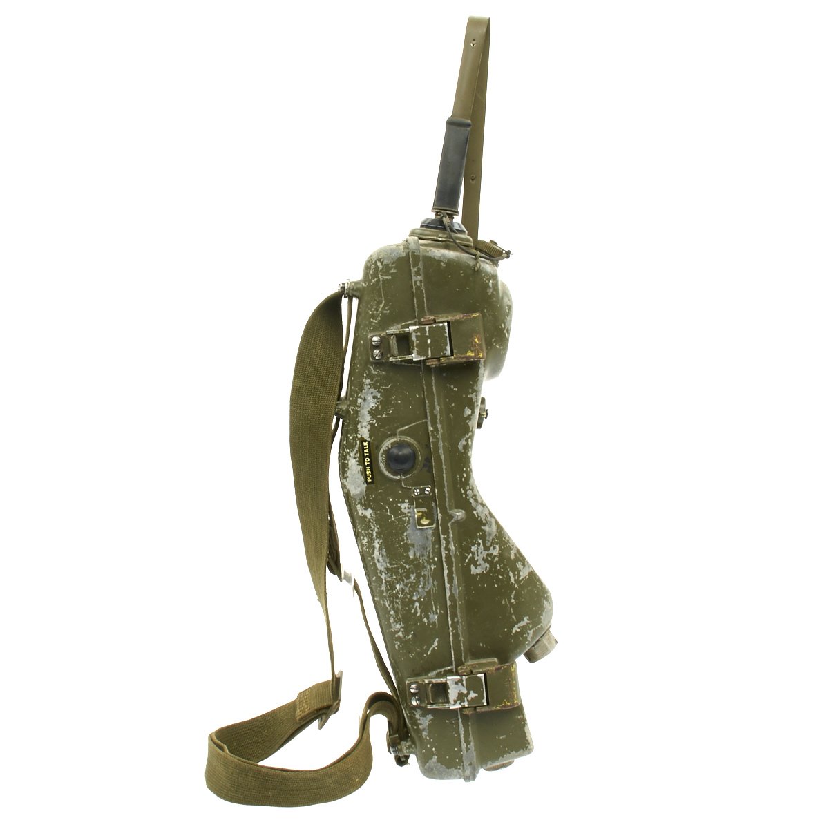 This example appears complete, though it definitely does show some service wear. The paint has worn off in places, so that the alloy body material can be seen. The spring steel "whip" antenna has almost all the original paint, and folds up easily. There are some markings painted on the exterior by the microphone. The rear sling is in good condition and is fully adjustable. The various connectors appear serviceable.