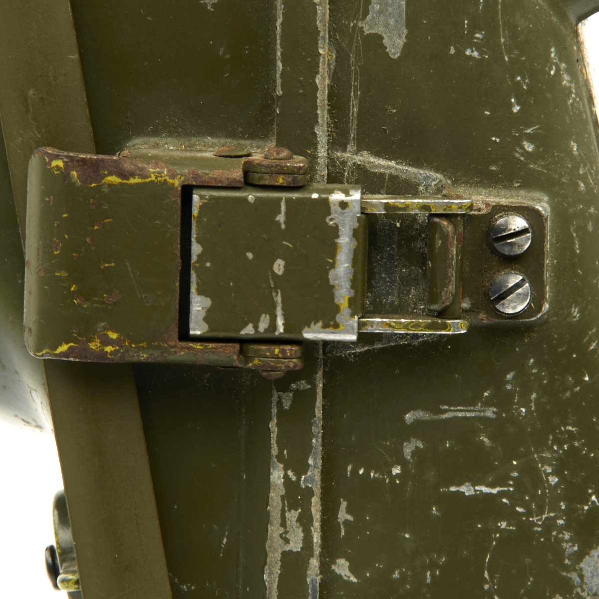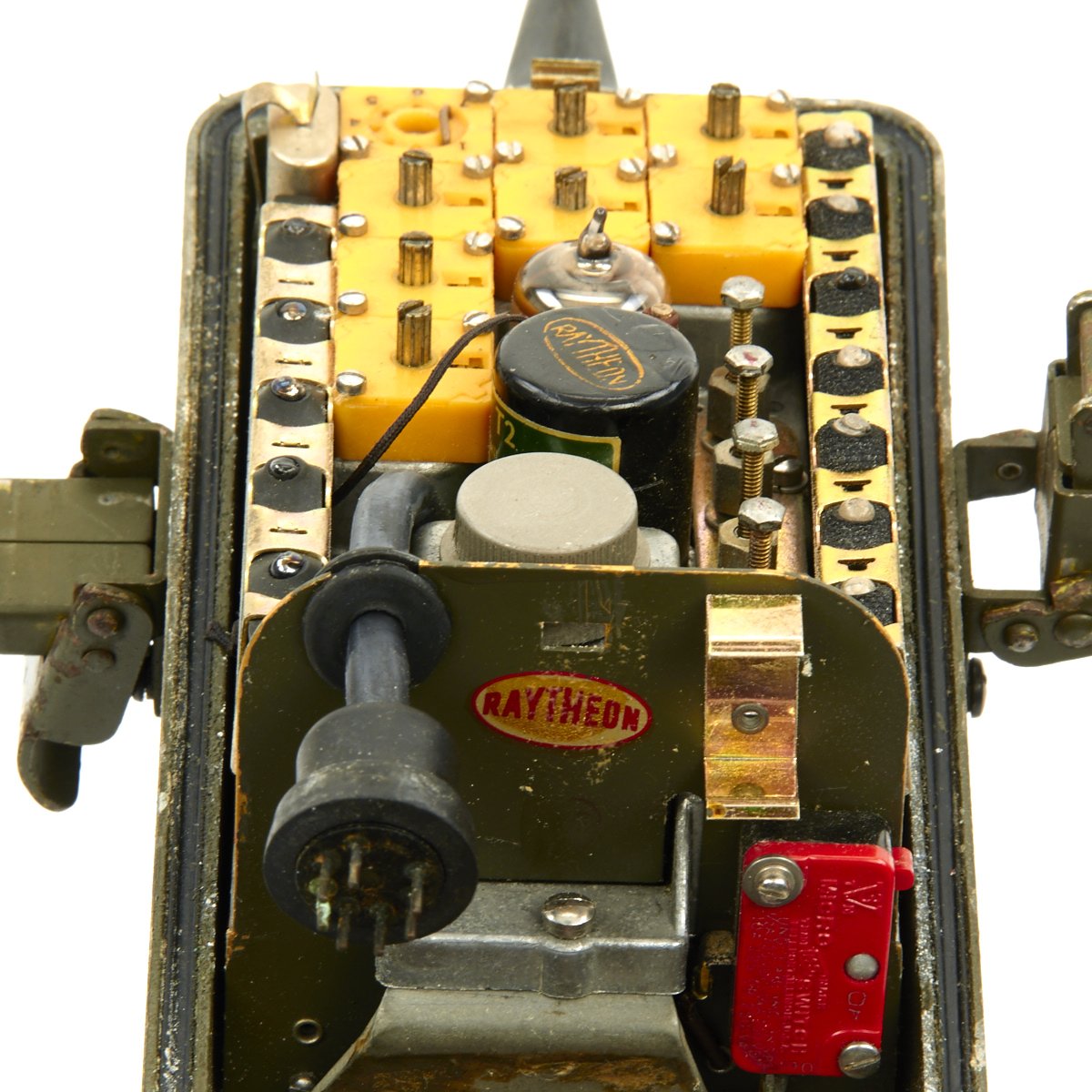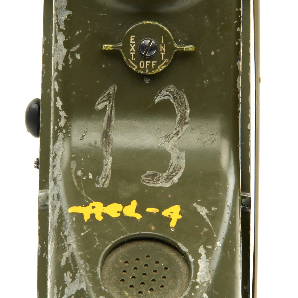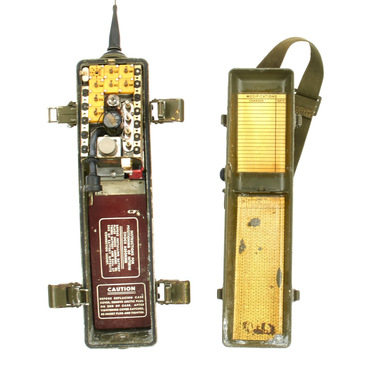 This example appears complete, though it definitely does show some service wear. The paint has worn off in places, so that the alloy body material can be seen. The spring steel "whip" antenna has almost all the original paint, and folds up easily. There are some markings painted on the exterior by the microphone. The rear sling is in good condition and is fully adjustable. The various connectors appear serviceable.