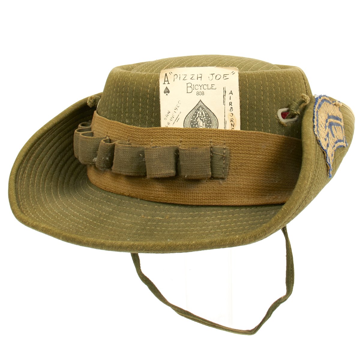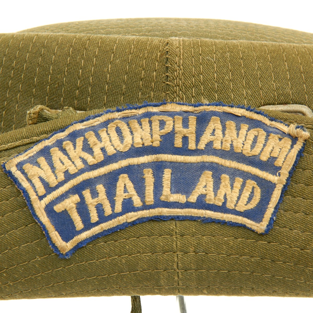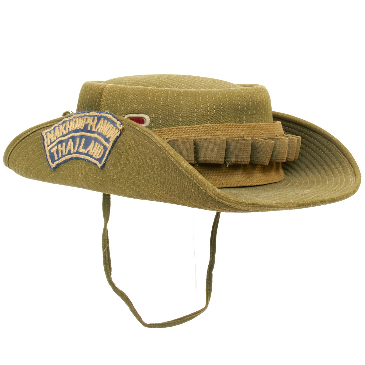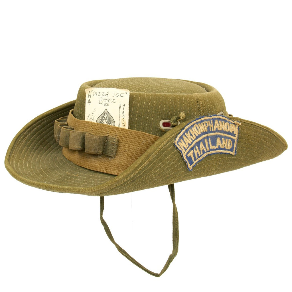 Original Item: Only One Available. This is a rare theater made Vietnam War bush hat. This style hat became popular with USGIs, specifically NCOs, who spent time in the wet hot conditions of Vietnam during the war. The left side of the hat is stitched with a Nakhon Phanom Thailand rocker patch which has a blue background and heavy white embroidered stitching. The band of the hat holds shotgun shell rounds. Underneth that band is a paper Ace of Spades playing card with personalized messages and Airborne.