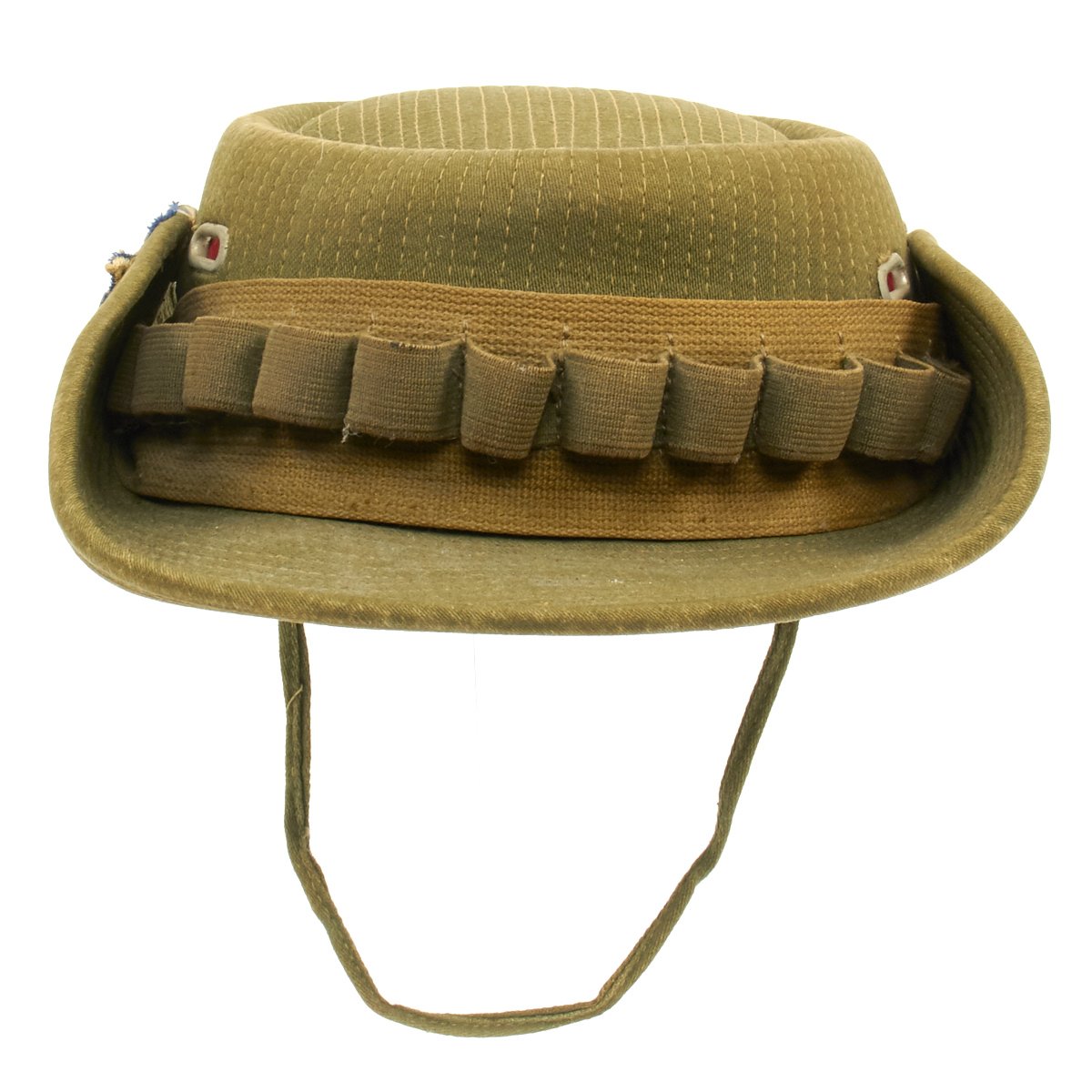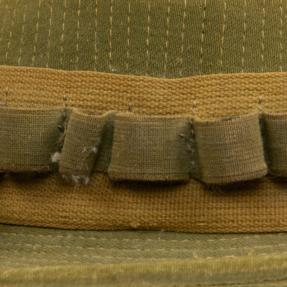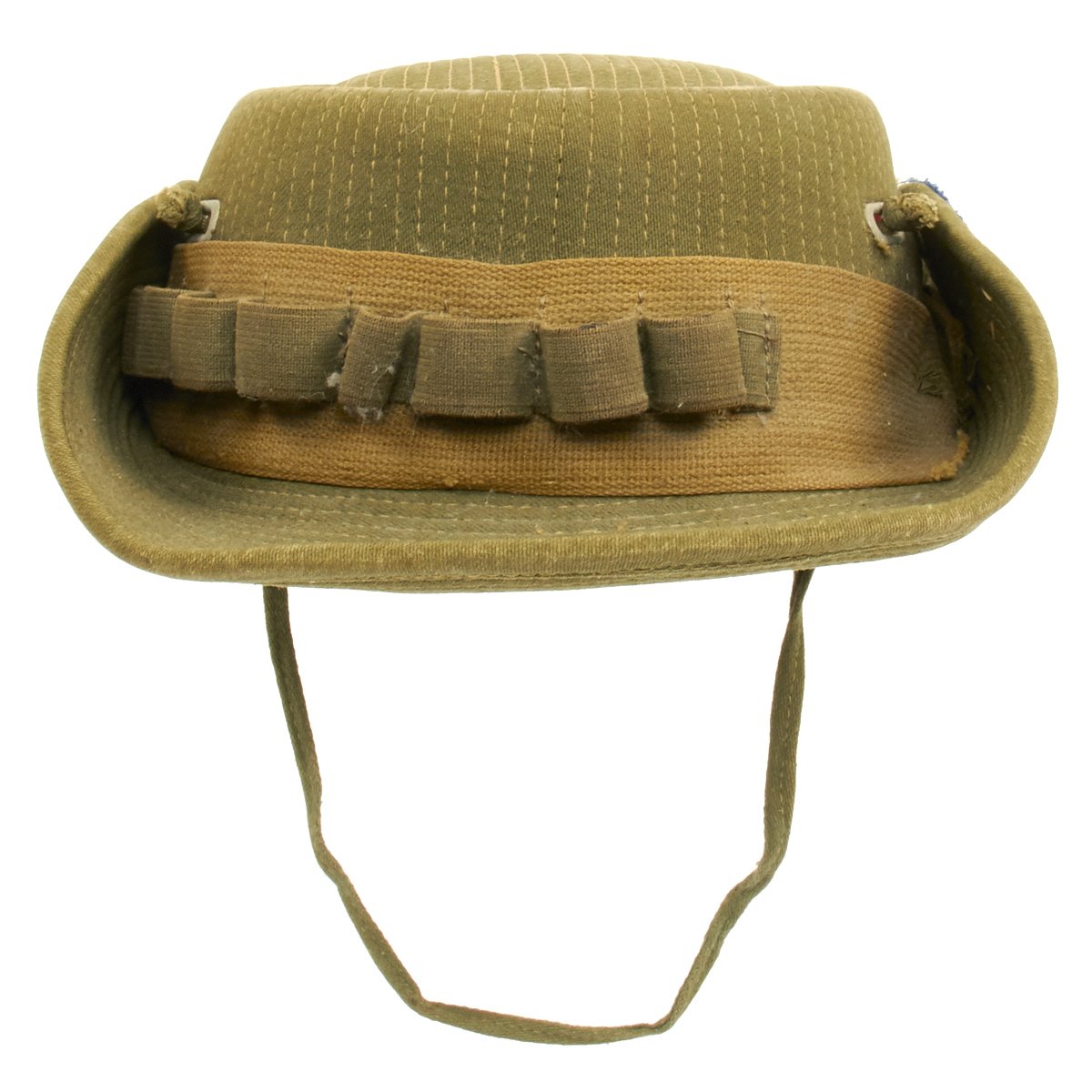 Original Item: Only One Available. This is a rare theater made Vietnam War bush hat. This style hat became popular with USGIs, specifically NCOs, who spent time in the wet hot conditions of Vietnam during the war. The left side of the hat is stitched with a Nakhon Phanom Thailand rocker patch which has a blue background and heavy white embroidered stitching. The band of the hat holds shotgun shell rounds. Underneth that band is a paper Ace of Spades playing card with personalized messages and Airborne.