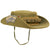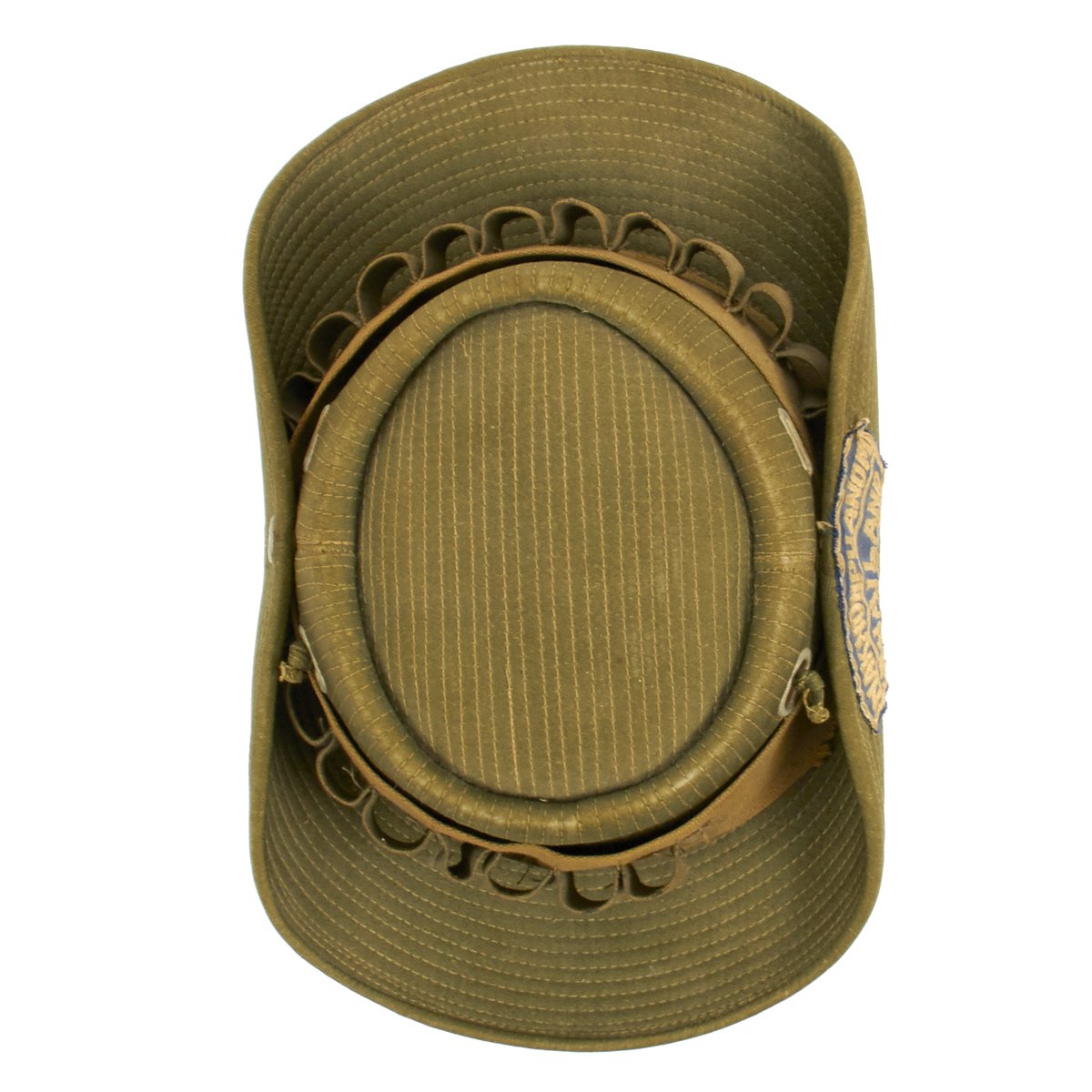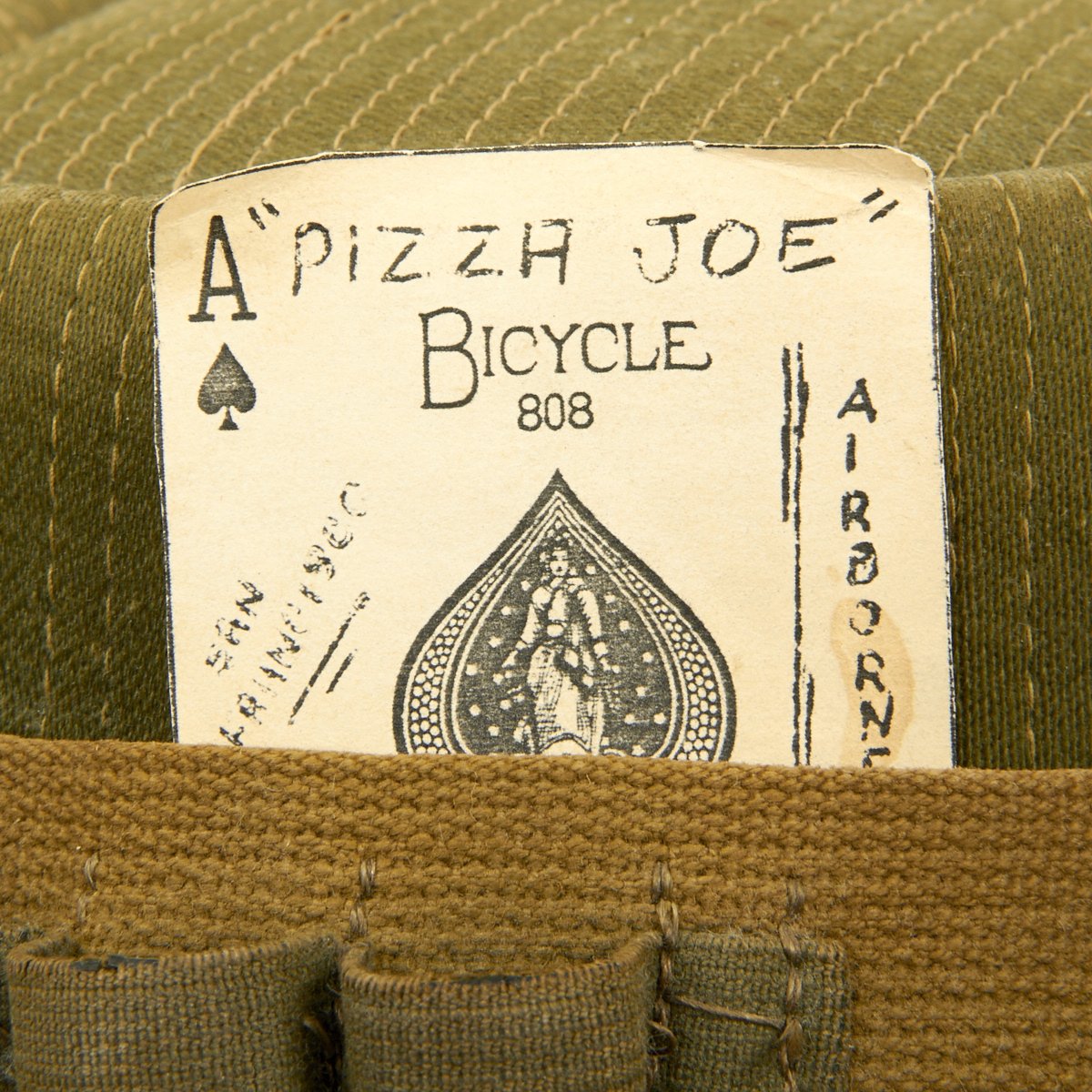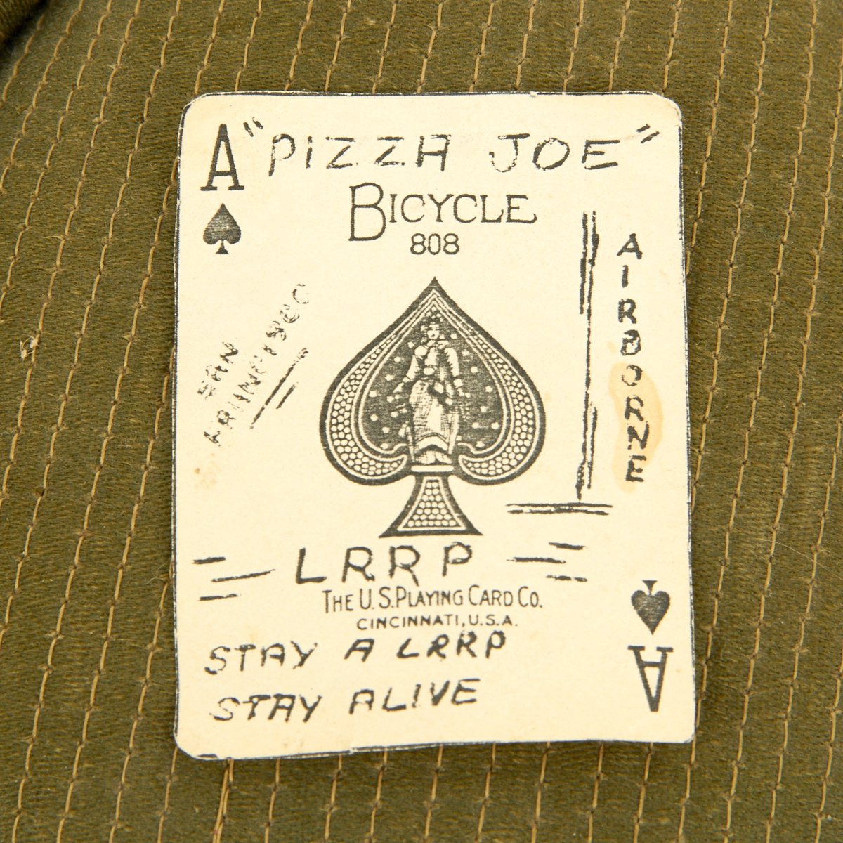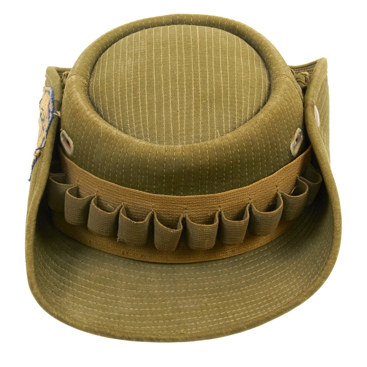 Original Item: Only One Available. This is a rare theater made Vietnam War bush hat. This style hat became popular with USGIs, specifically NCOs, who spent time in the wet hot conditions of Vietnam during the war. The left side of the hat is stitched with a Nakhon Phanom Thailand rocker patch which has a blue background and heavy white embroidered stitching. The band of the hat holds shotgun shell rounds. Underneth that band is a paper Ace of Spades playing card with personalized messages and Airborne.