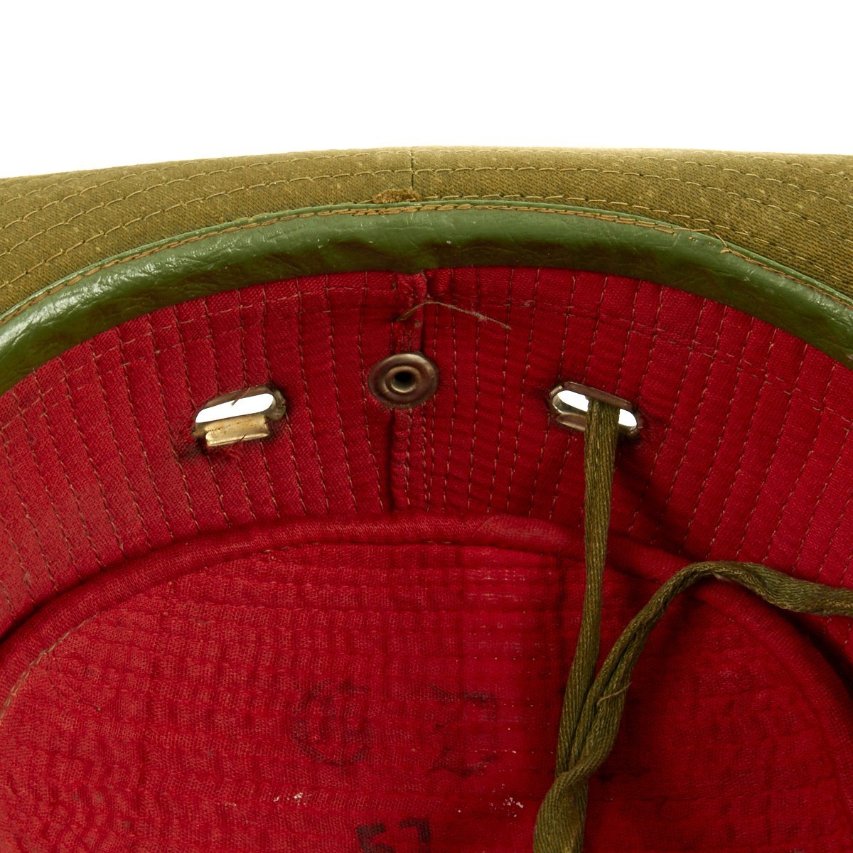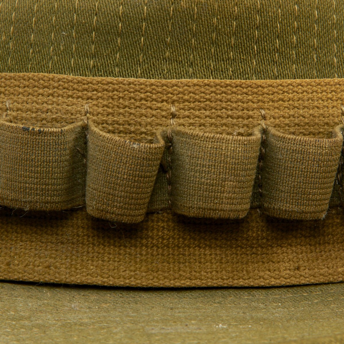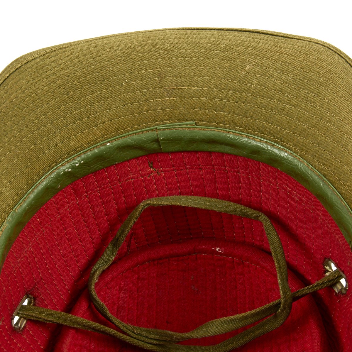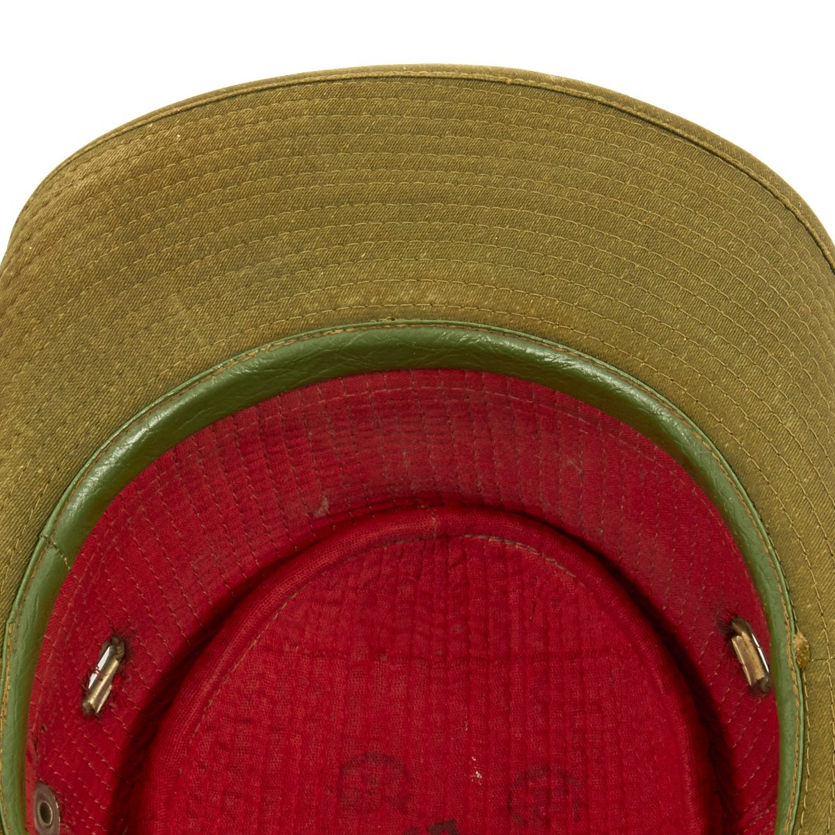 The hat itself is heavy gauge canvas construction with green exterior and red interior and is a size 57 (US 7 1/8). Overall condition is excellent.