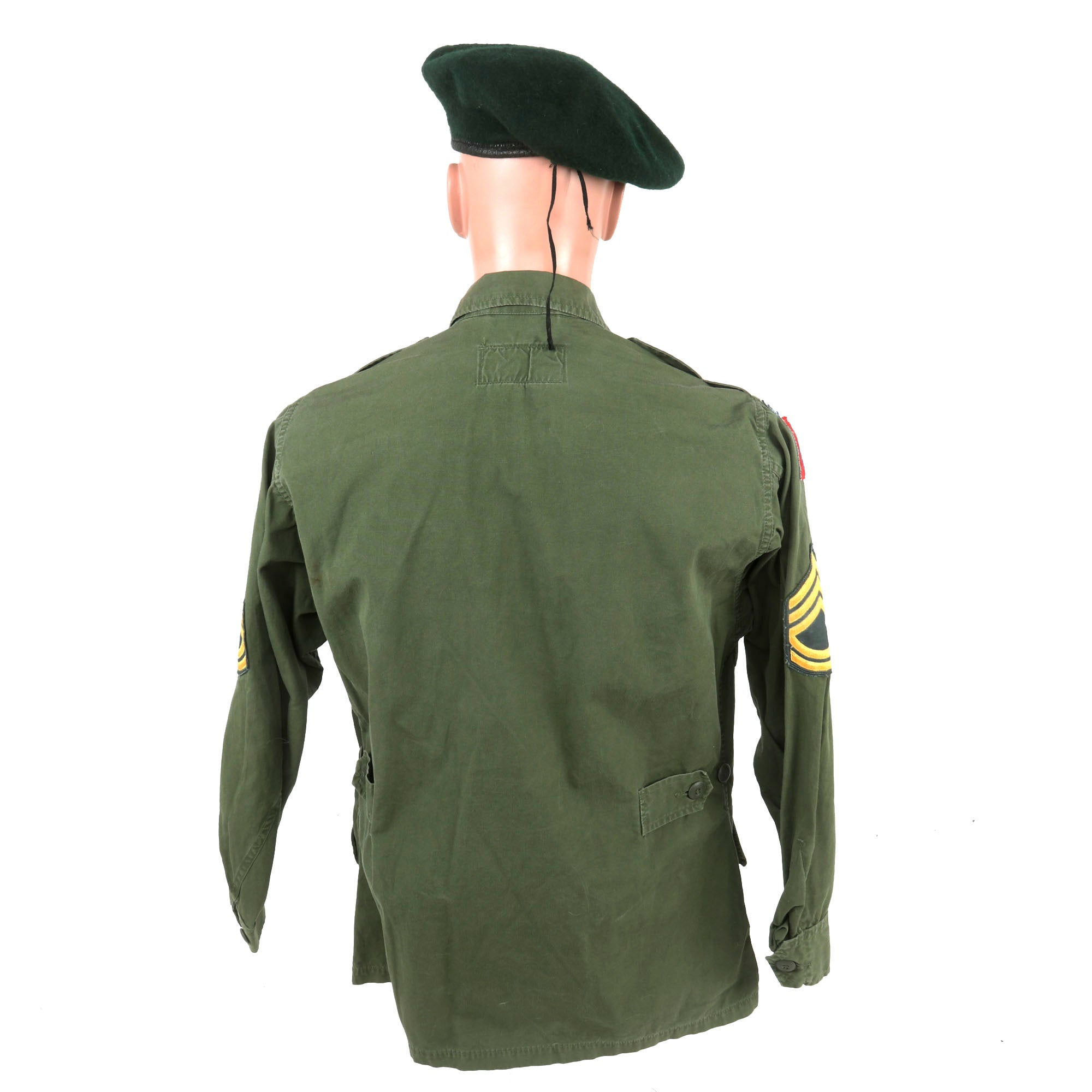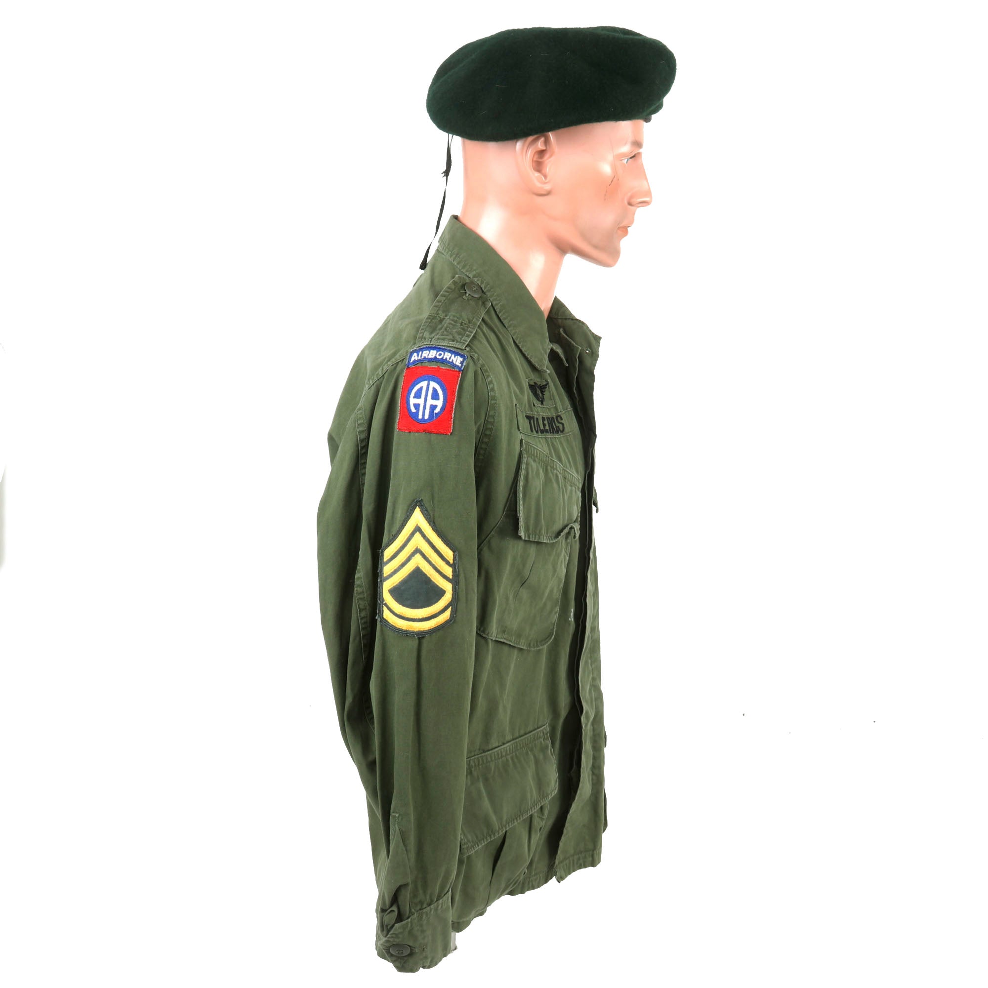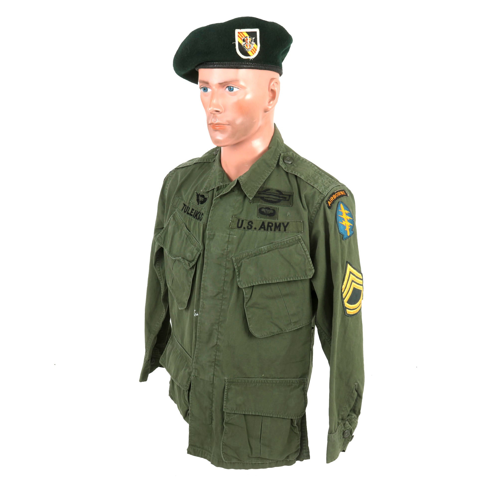 Original Item: Only One Available. This is an excellent example of a completely original, untouched, Vietnam War Special Forces Jungle Fatigue Jacket with “Incountry” Vietnamese-Made insignia for a Paratrooper who served with the 5th Special Forces Group, Sergeant First Class Tuleikis. Also included is a private-purchase beret with a flash for the 5th SPG.