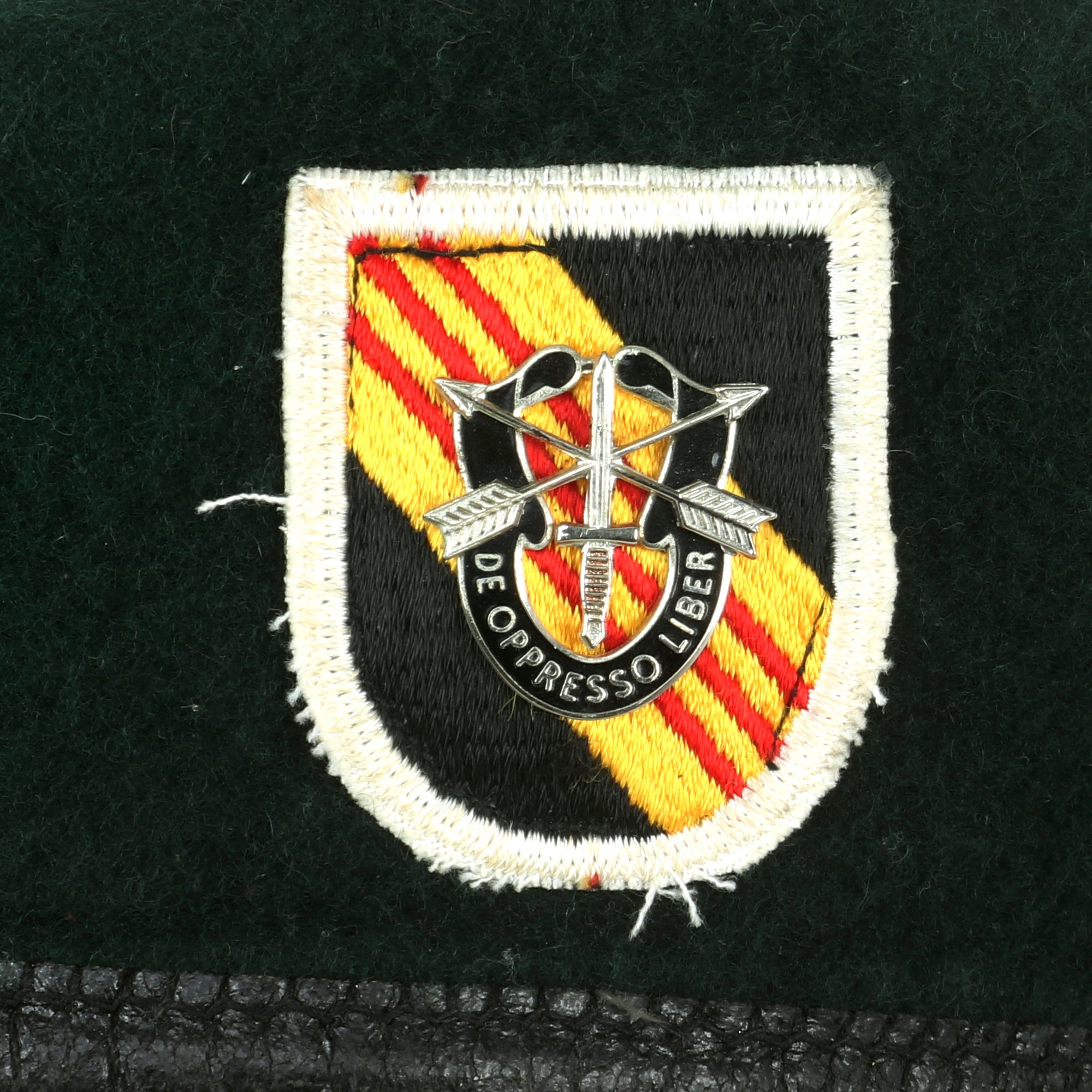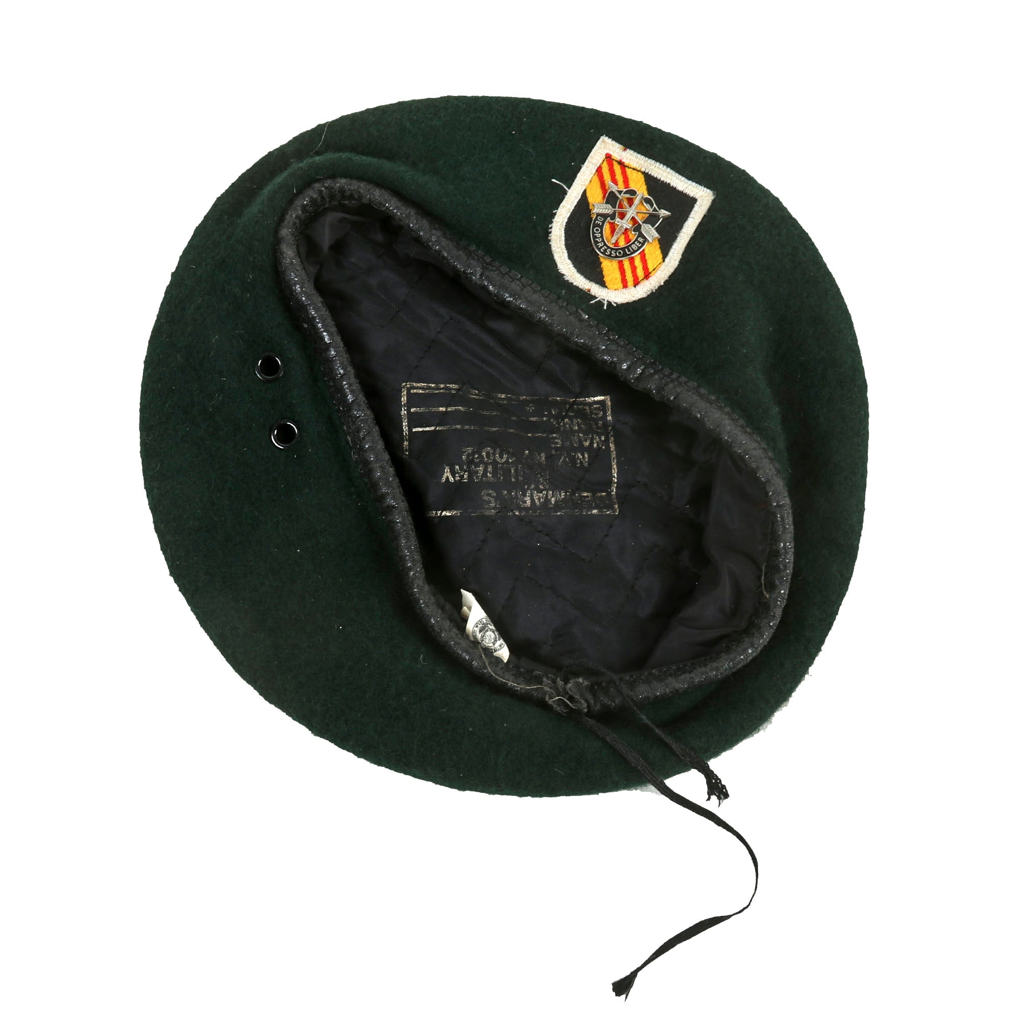 The private-purchase beret has a size tag, 7¼, and is marked to DENMARK’S MILITARY in New York City. There is a flash for the 5th Special Forces Group with the correct De Oppresso Liber motto.