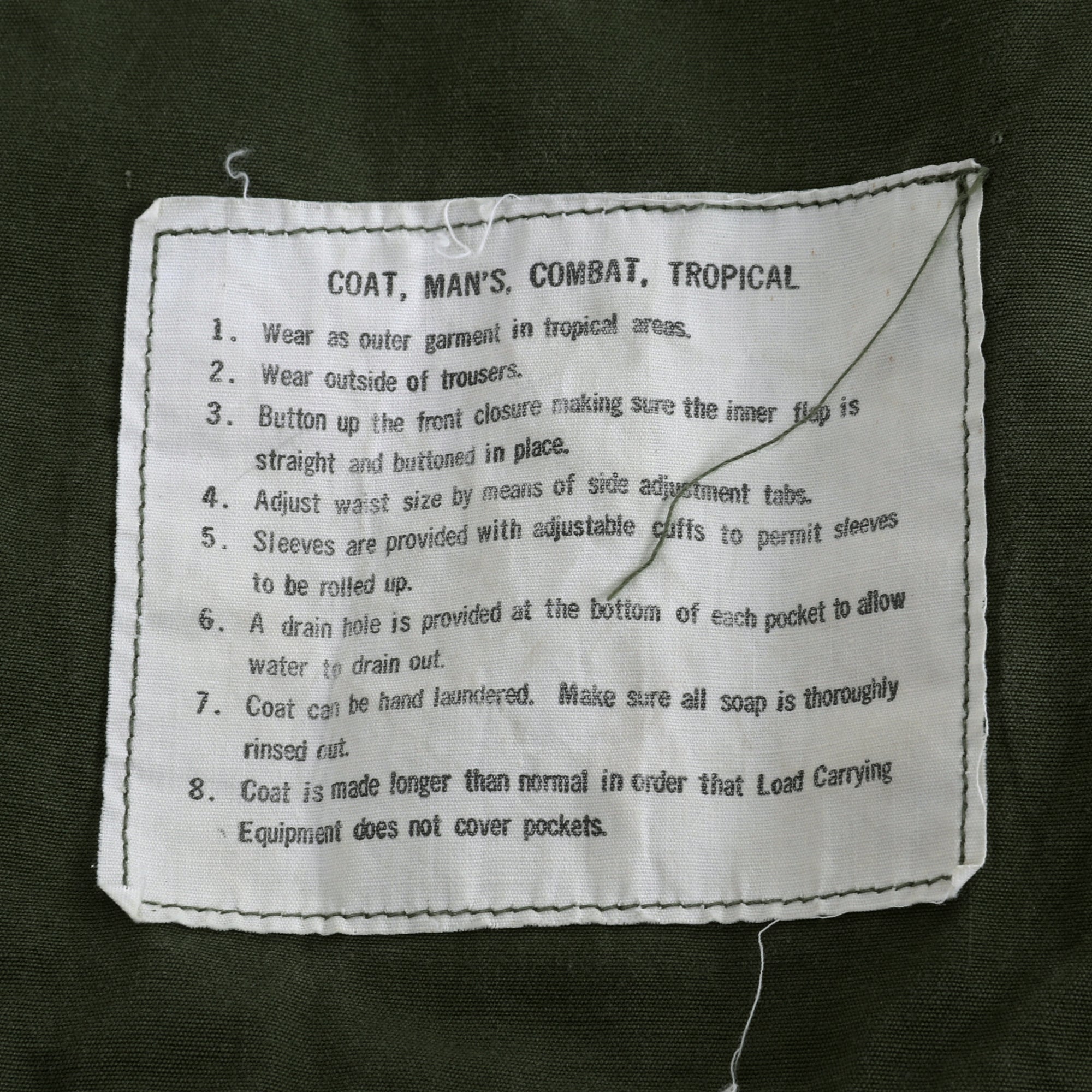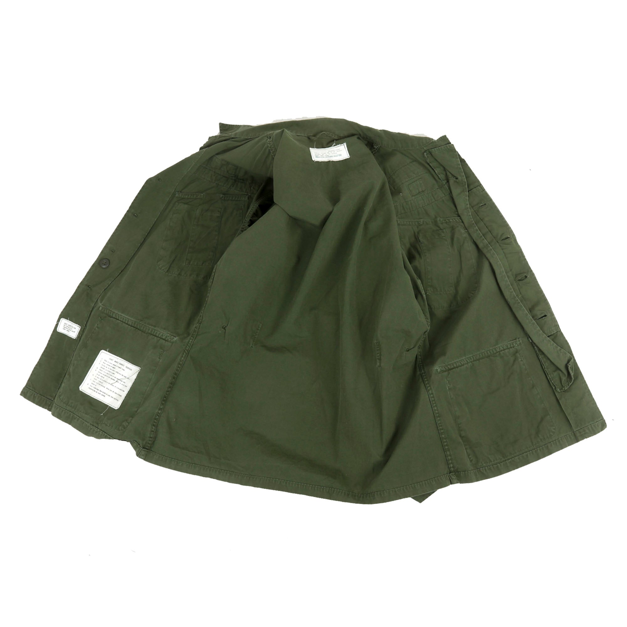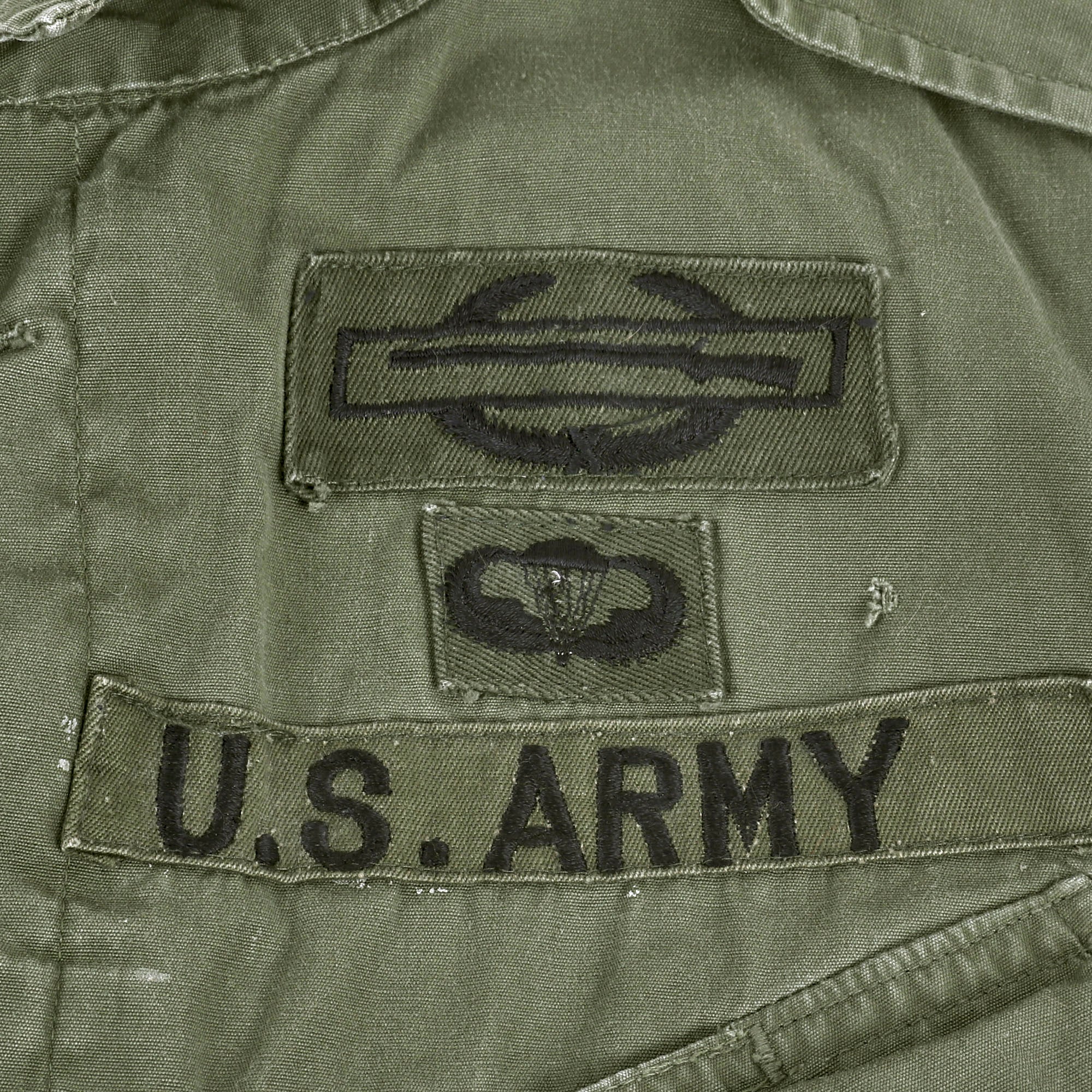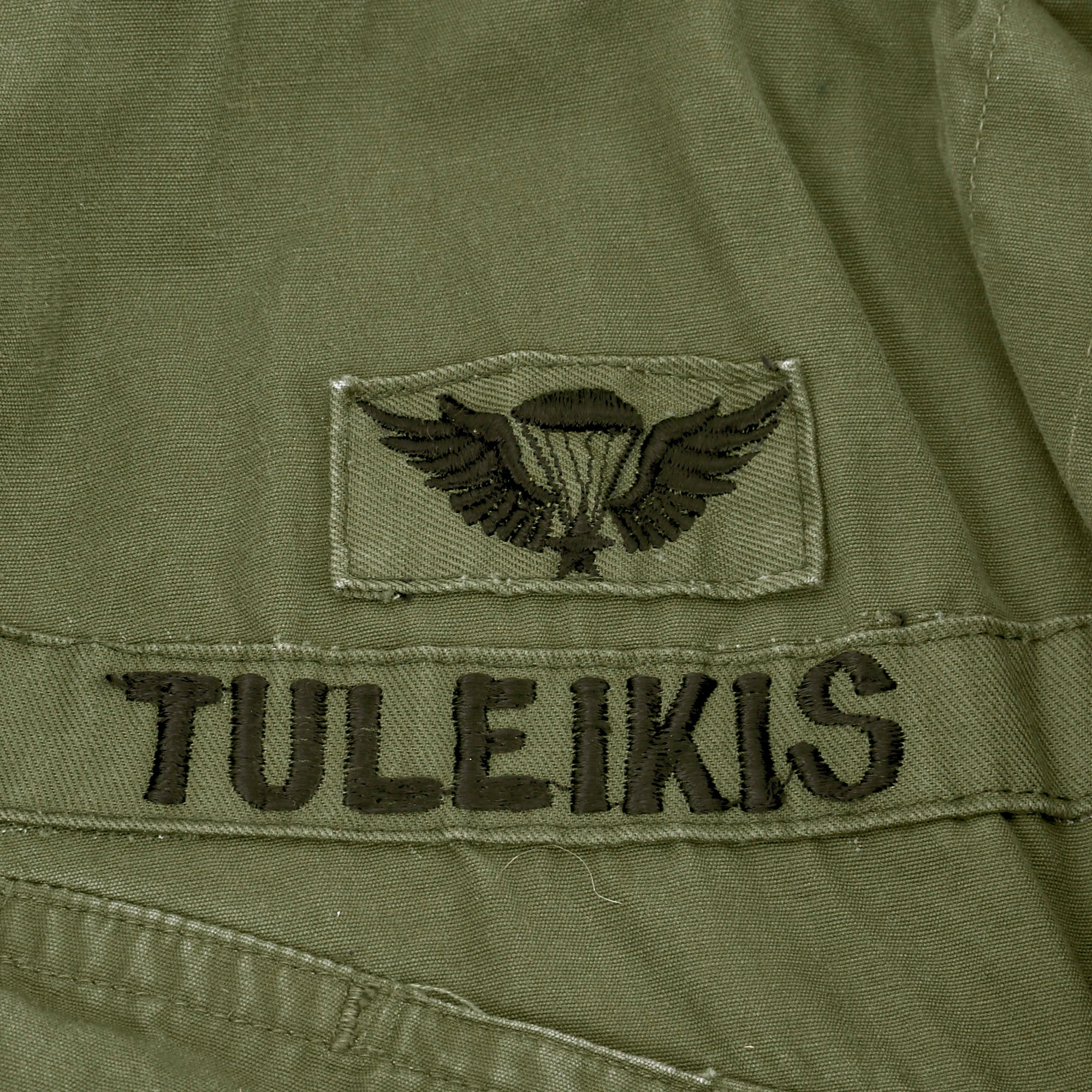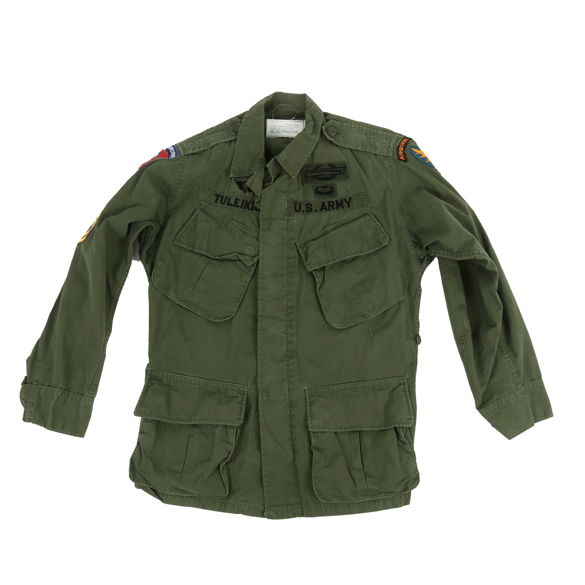 The 2nd Pattern Jungle Fatigue bears Sergeant First Class chevrons on both sleeves, a 5th SPG Airborne patch on the left shoulder, and an 82nd Airborne patch on the right shoulder. Above the left breast pocket is a Combat Infantry Badge, Paratrooper Wings, and U.S. Army patch. Above the right breast pocket is a set of Republic of Vietnam Paratroop Jump Wings and his name tag, reading Tuleikis. The original uniform tag reads: