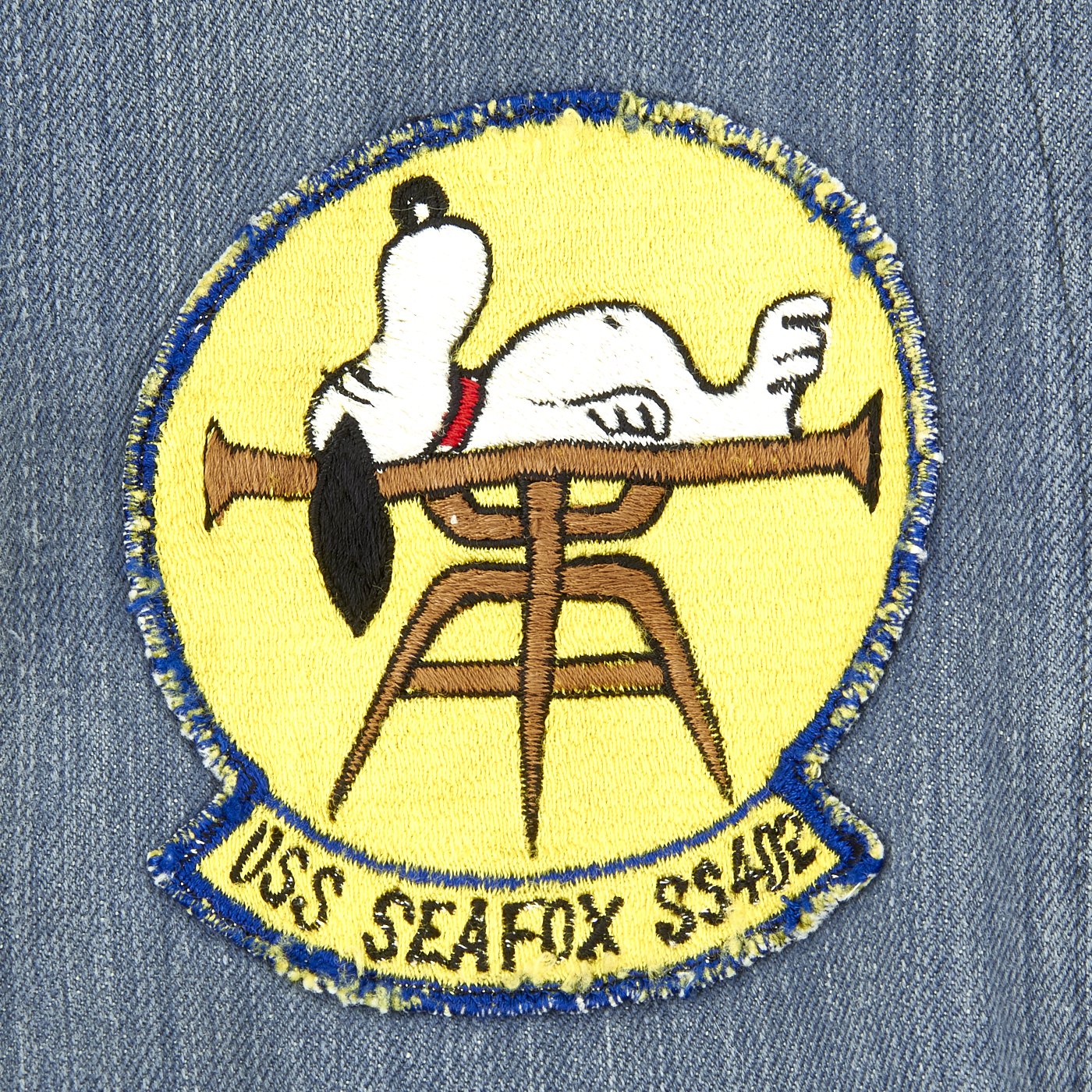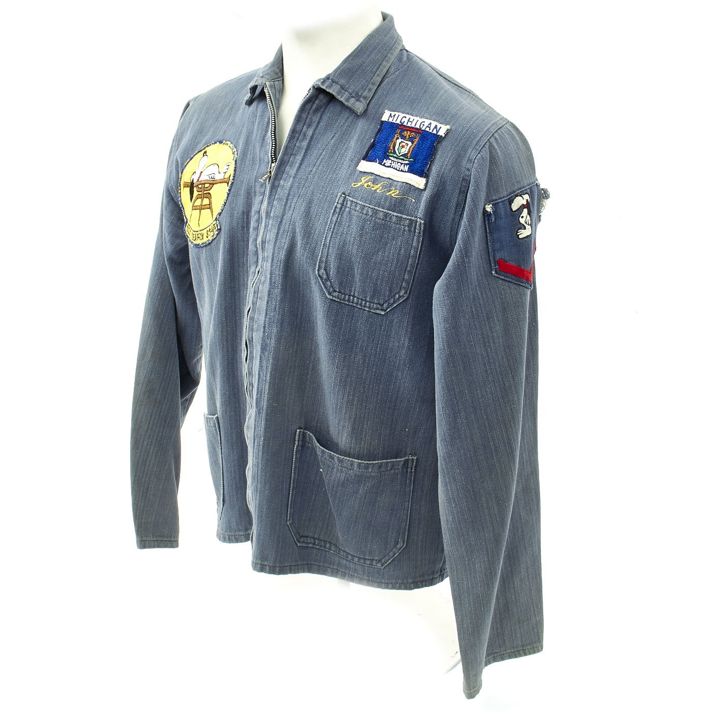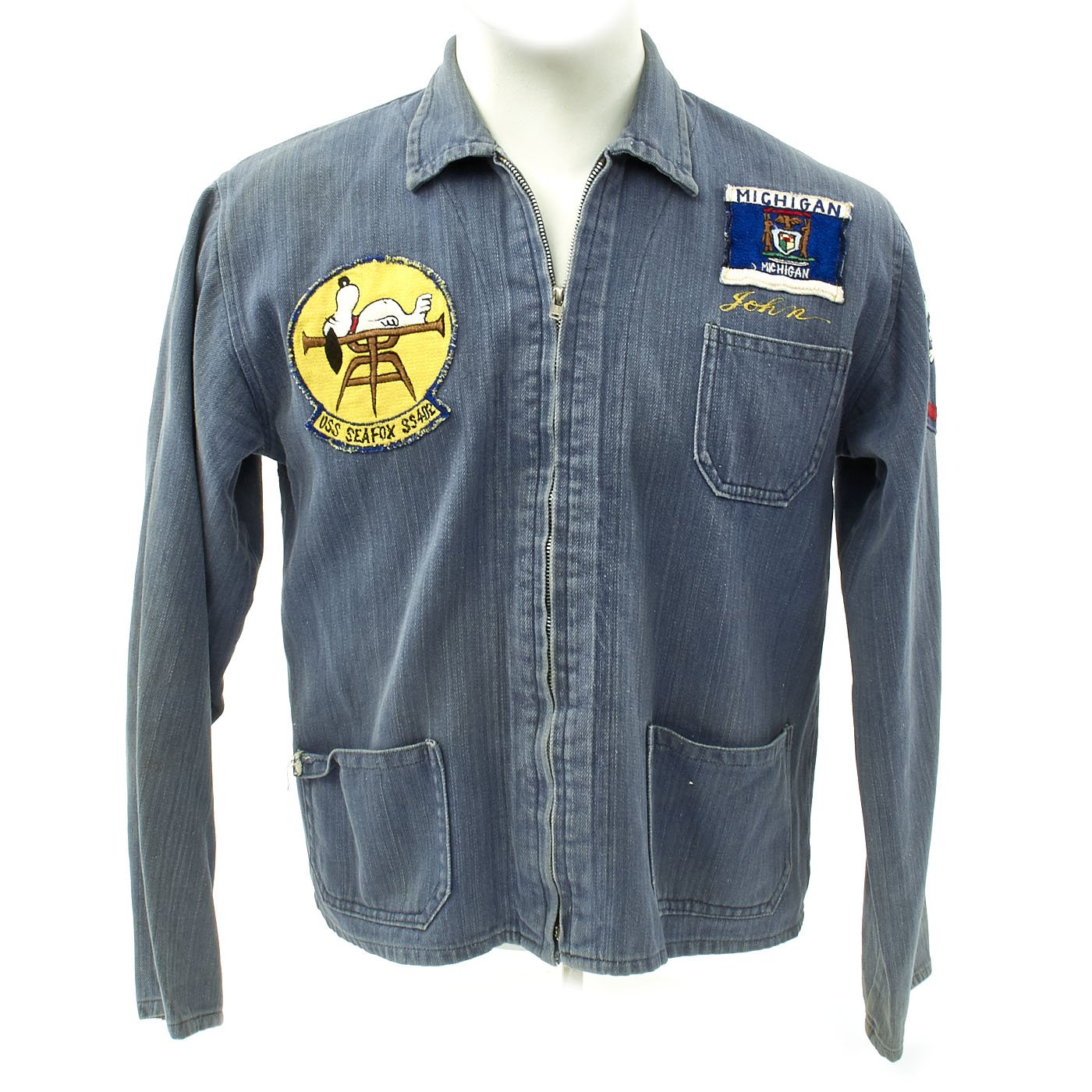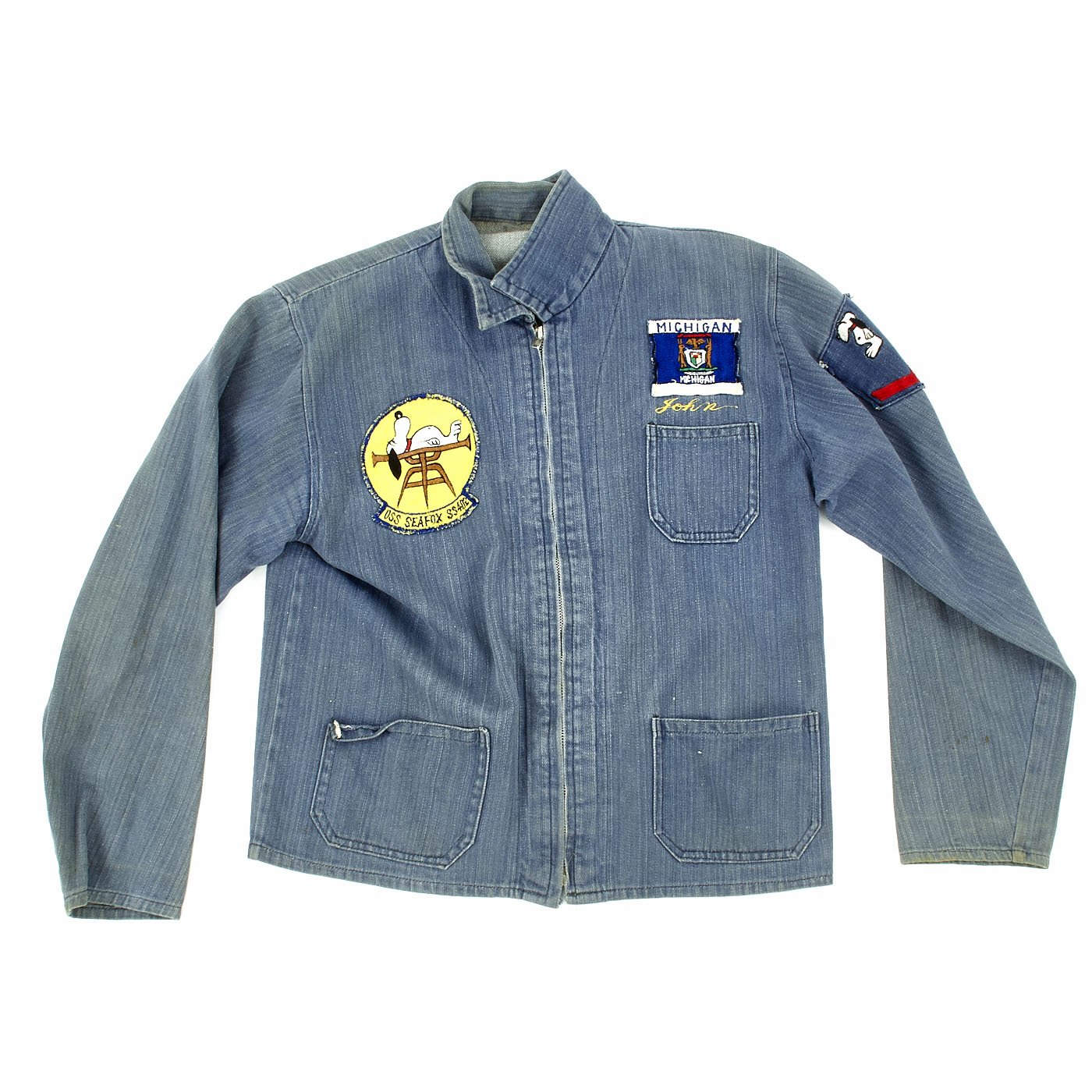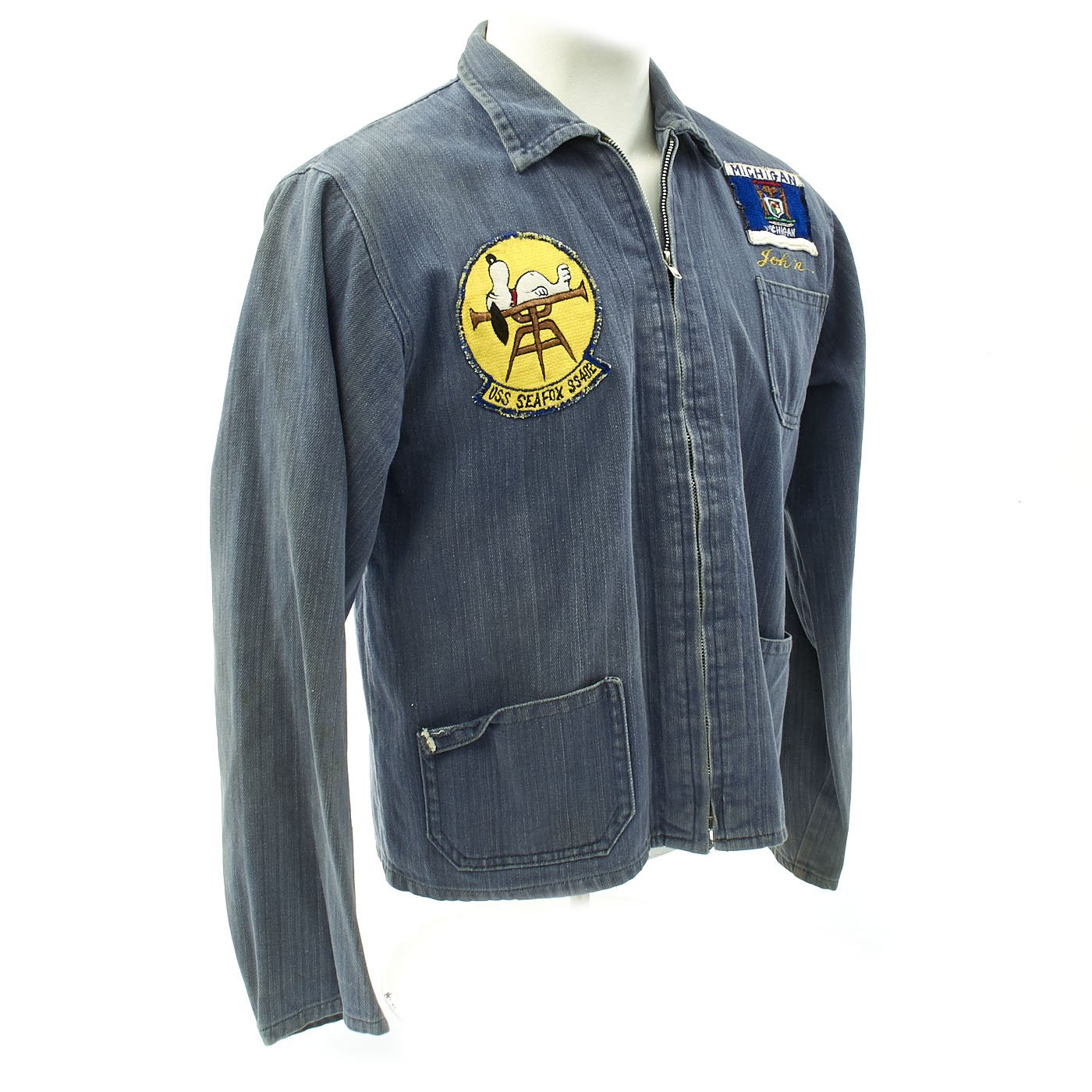 This is a denim zip from work shirt with USS SEA FOX Snoopy patch to right chest, Michigan Flag Patch to left chest, gold thread embroidered name John beneath and a Snoopy Petty Officer chevron to left shoulder.