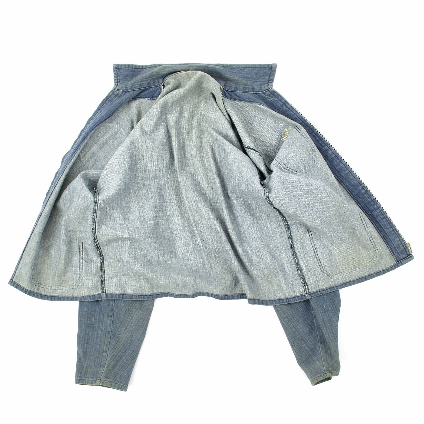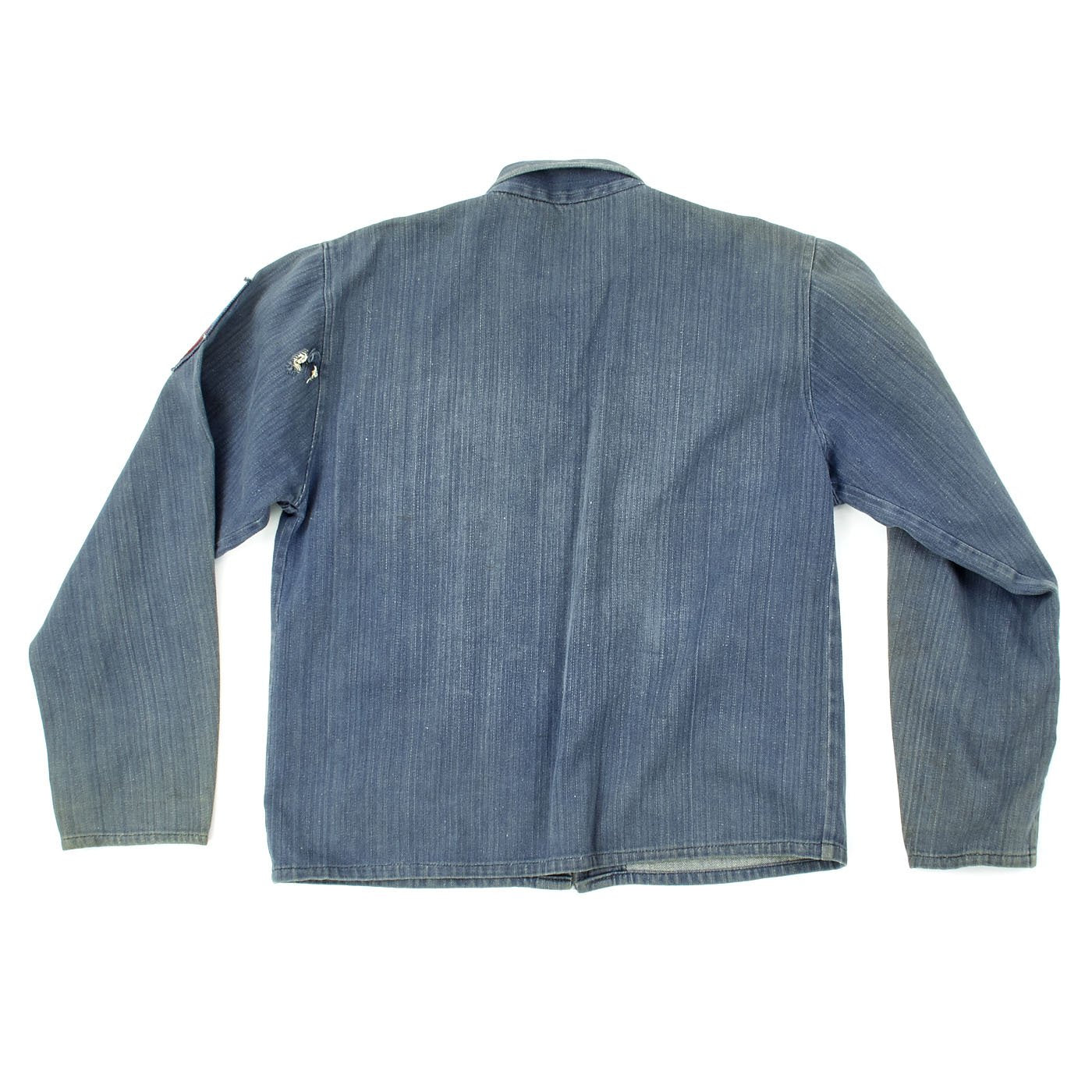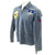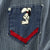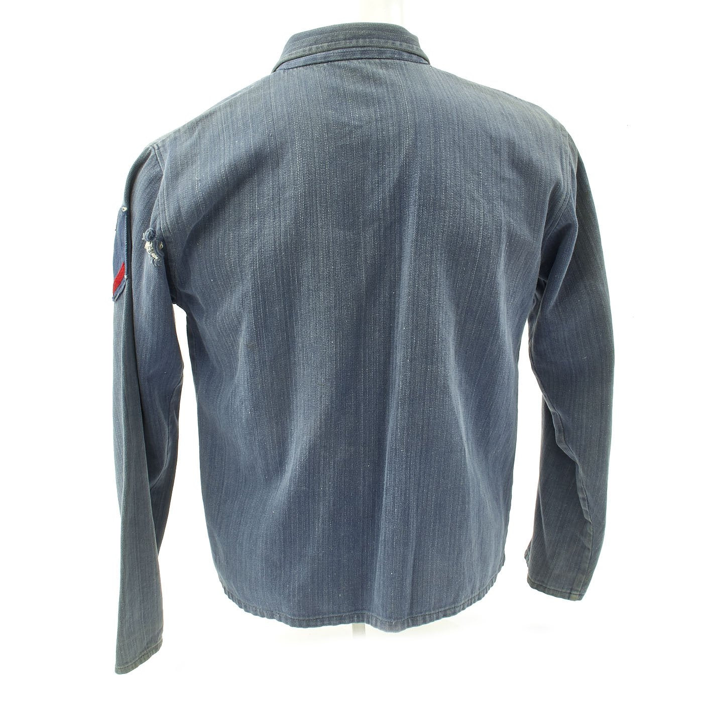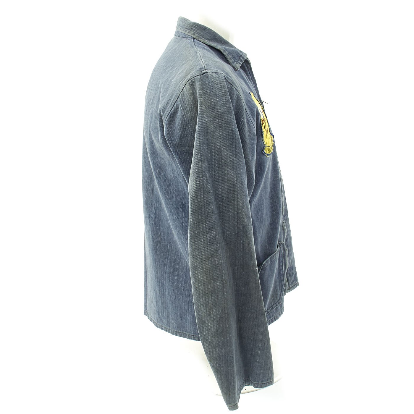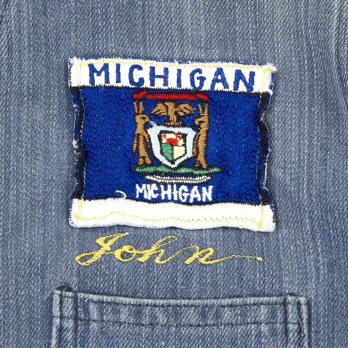 This is a denim zip from work shirt with USS SEA FOX Snoopy patch to right chest, Michigan Flag Patch to left chest, gold thread embroidered name John beneath and a Snoopy Petty Officer chevron to left shoulder.