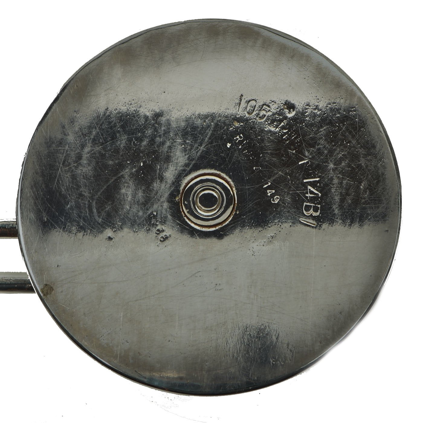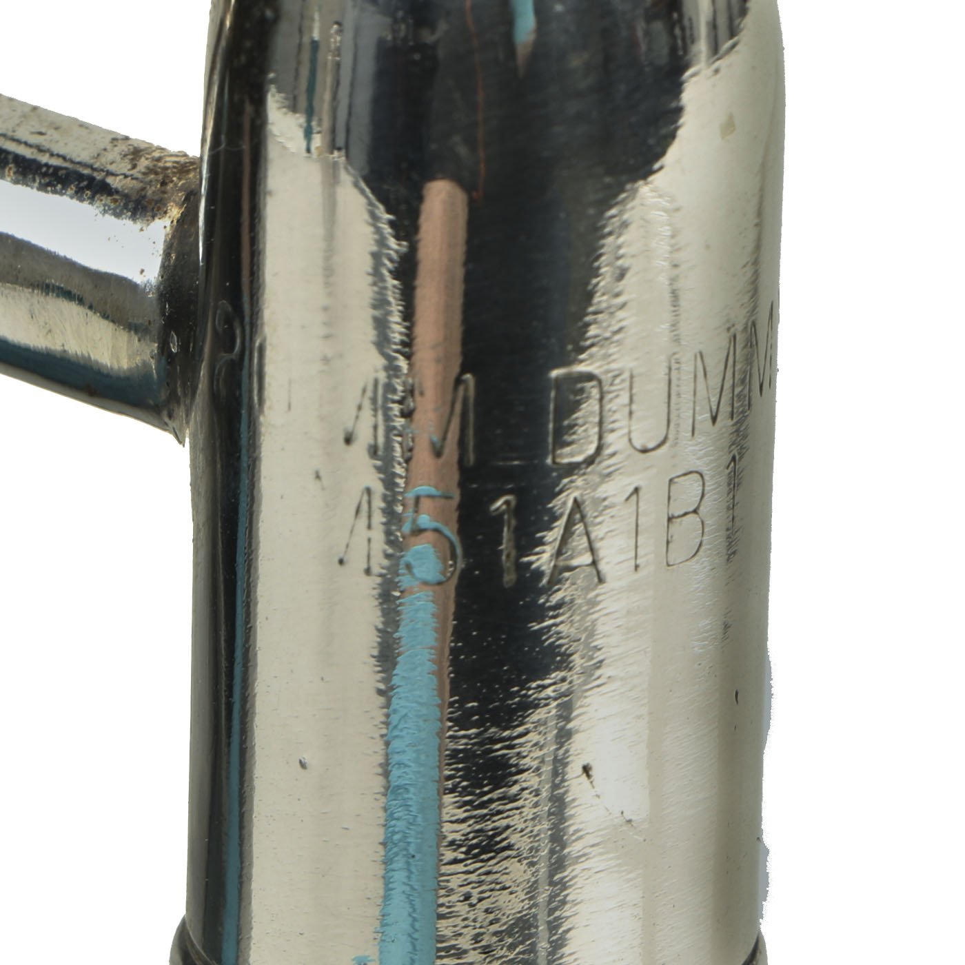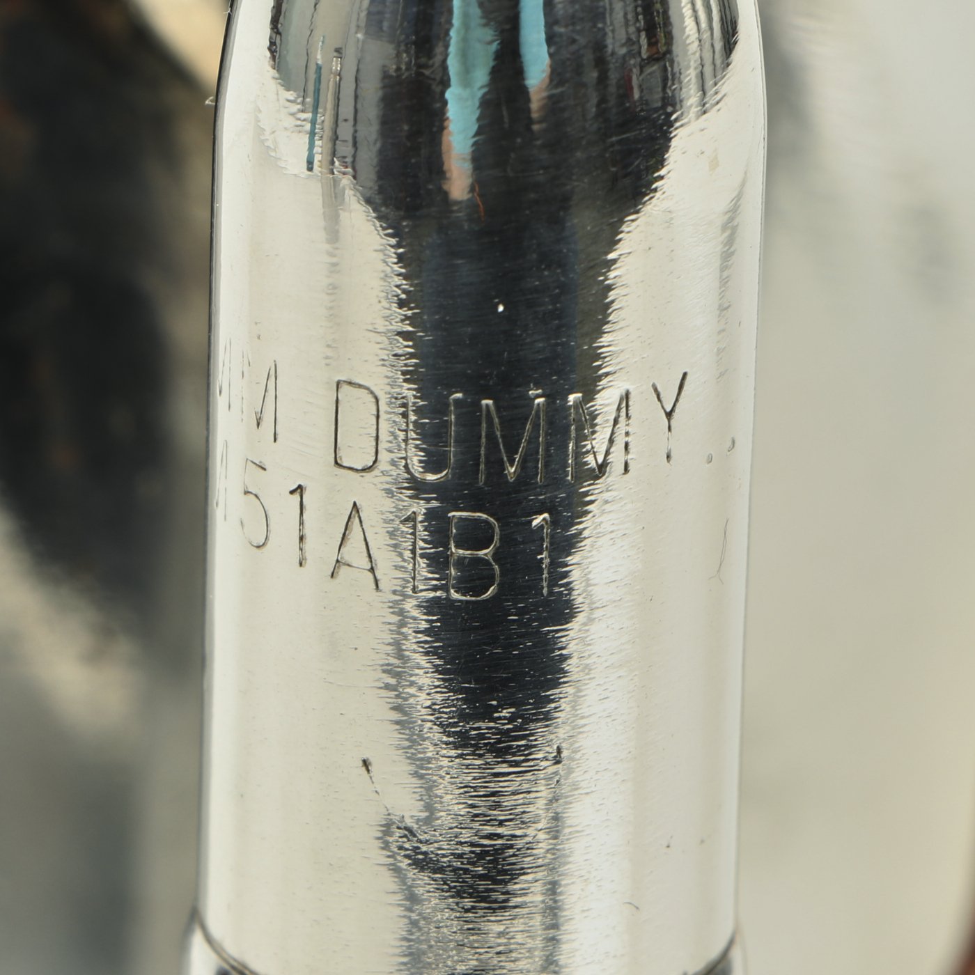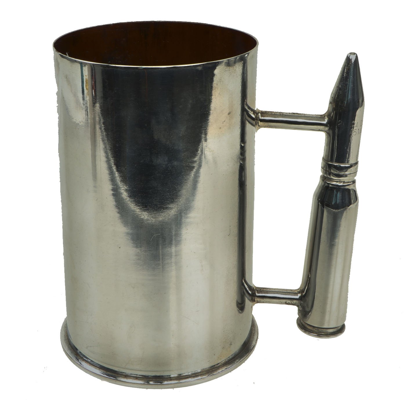 The mug's main body is made from a 105MM M14B1 artillery shell, which has has been reduced to 7 inches and length. It then had a 20MM DUMMY M501A1B1 cartridge attached with cross bars to serve as a handle to the mug. The entire exterior was then chrome plated, and had a brass shield attached to the front.