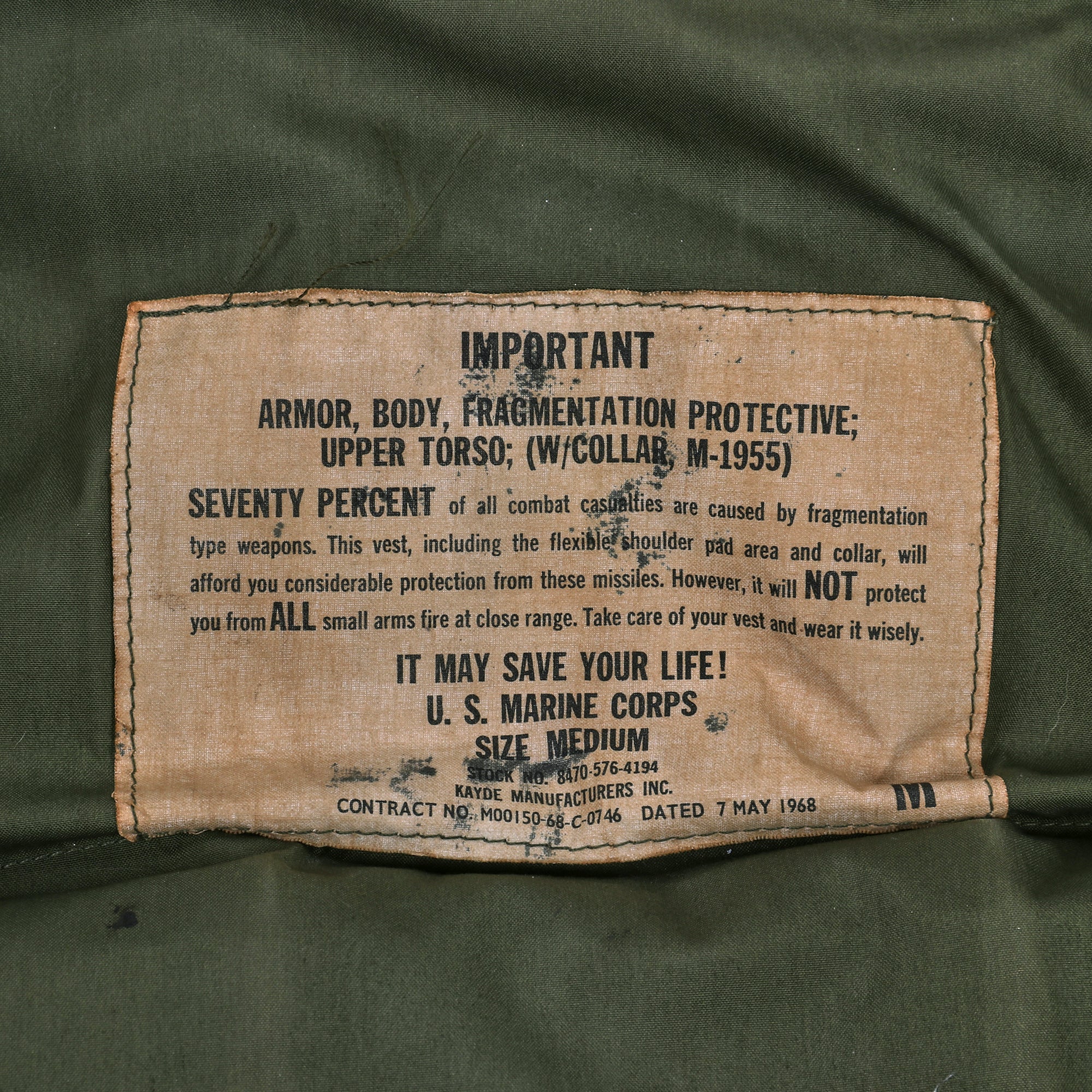 Original Item: Only One Available. This is a classic Vietnam War Era U.S. Marine Corps M1955 Body Armor vest with data table that reads: