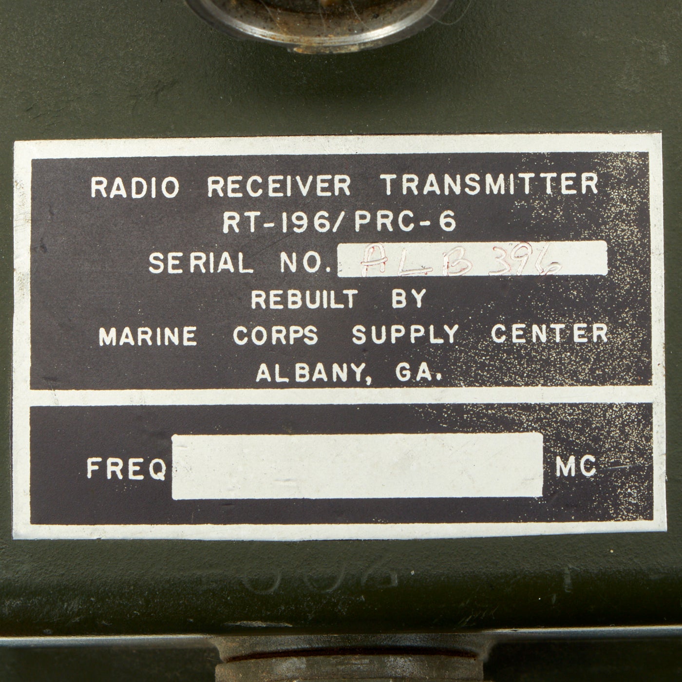 Original Item: Only One available. This is an original Vietnam War Era U.S. Marine Corps RT-196/PRC-6 Radio Receiver Transmitter Walkie Talkie. This unit has not been tested by IMA but we were told it should be functional. However, we will not guarantee functionality. This set looks to probably have been in service during the Vietnam conflict, but does not look to have been repainted or refurbished, giving a great service worn look.