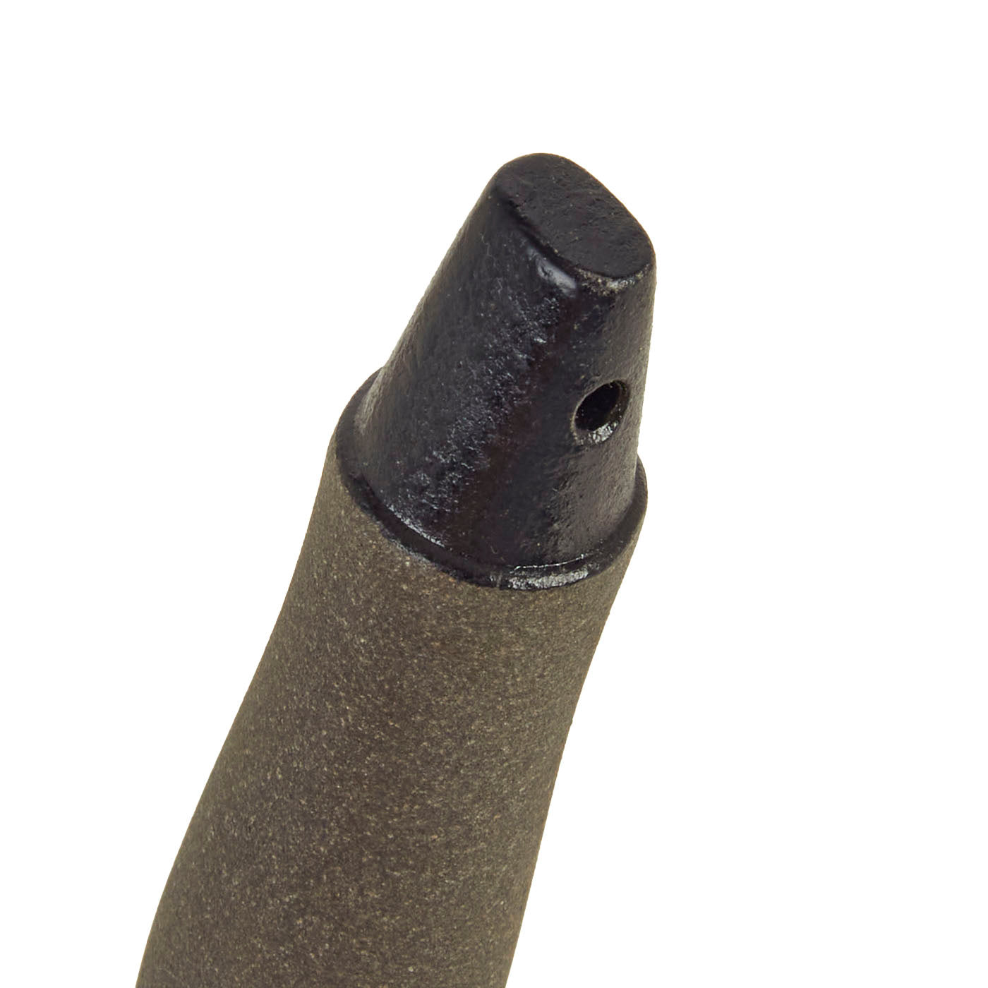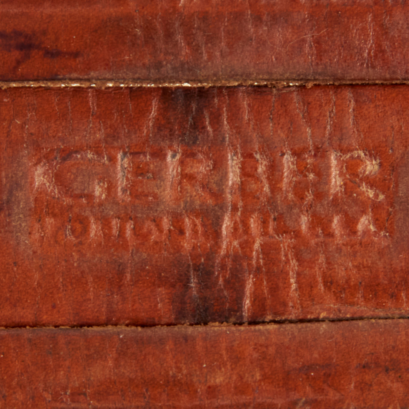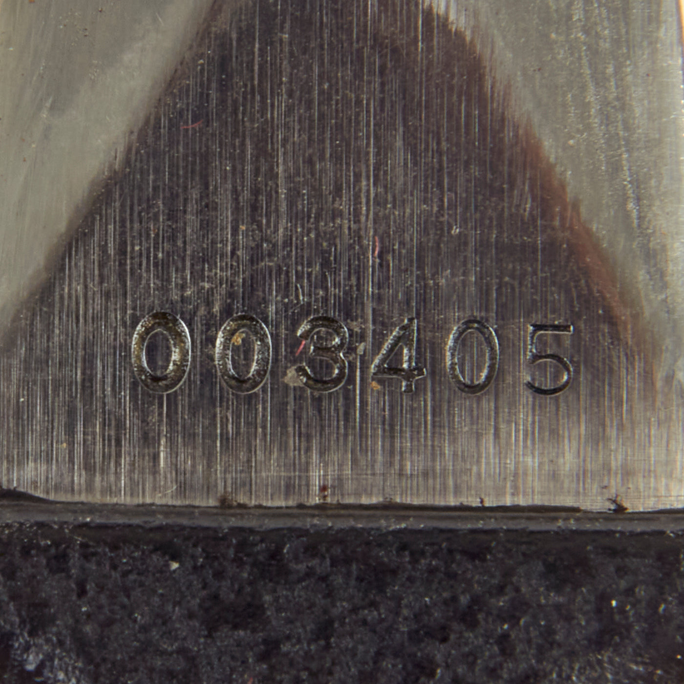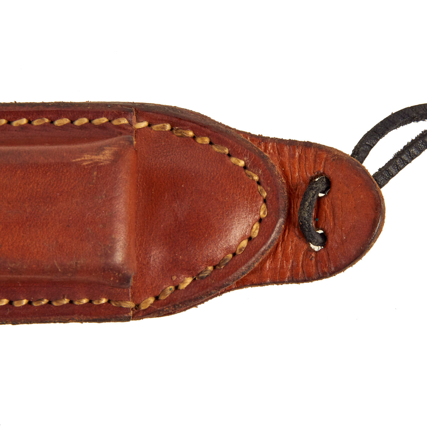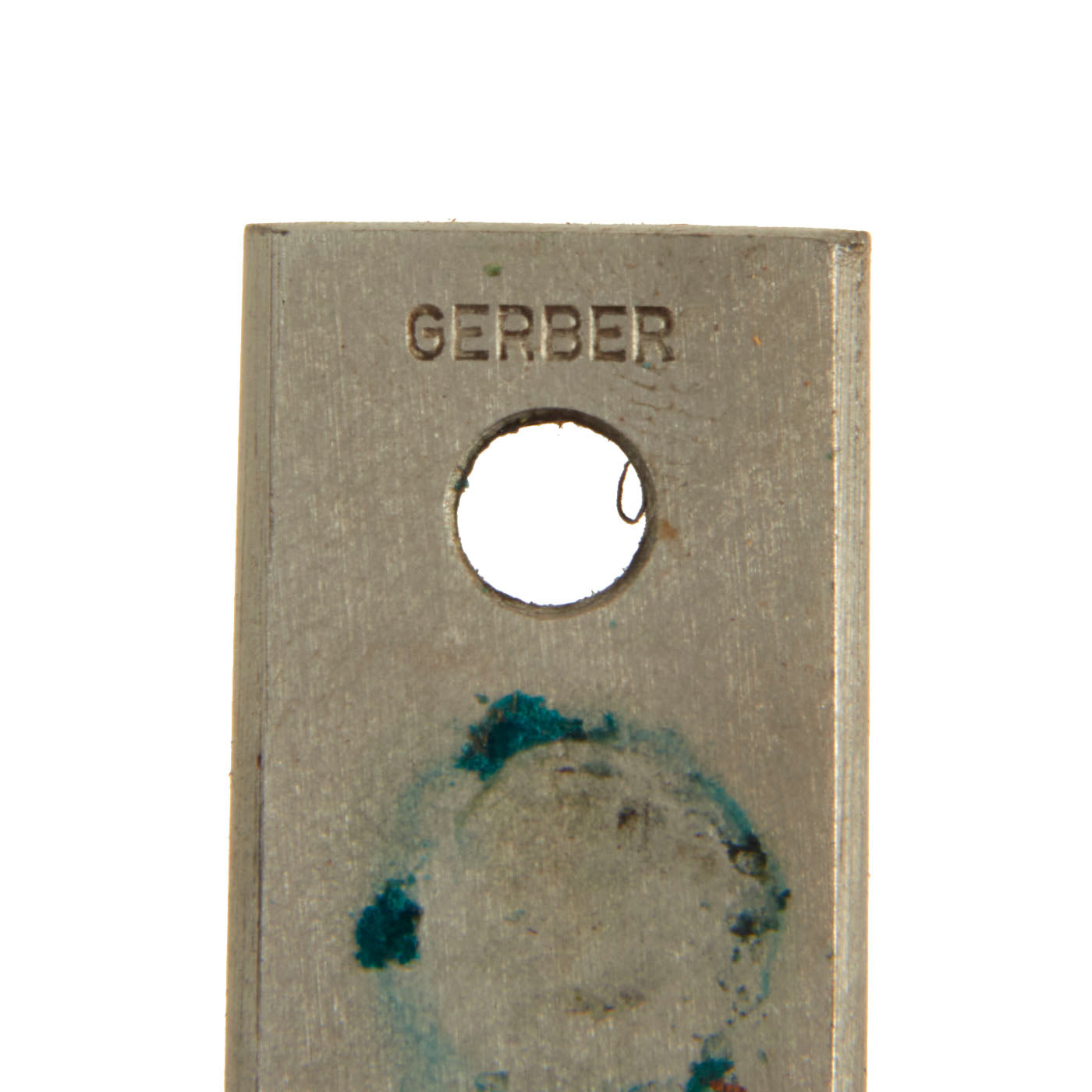 The wear on both the knife and sheath are consistent with service wear and use, but are without damage. There is some paint loss on the cast aluminum crossguard and pommell, but no corrosion is present. The blade is without any significant damage and all engraving is deeply made and still easily read. The sheath exhibits minor wear and is free of damage. The sheath is correct to the knife and the belt loop is marked with Gerber. The sheath also has a pistol belt brass hook attachment at the top.