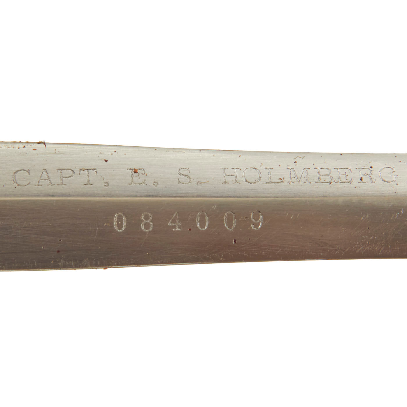 This knife is name engraved on the blade to CAPT. E. S. HOLMBERG / 084009. Captain Eugene Holmberg was given this knife as a promotion present from his father. Eugene Holmberg first enlisted in the Marine Corps on July 10, 1951 and soon found himself in Korea with Marine Attack Squadron (VMF-311) with Marine Air Group 33. We have not been able to find much on his Korean War service, but we did find an interesting story about him during the war.
