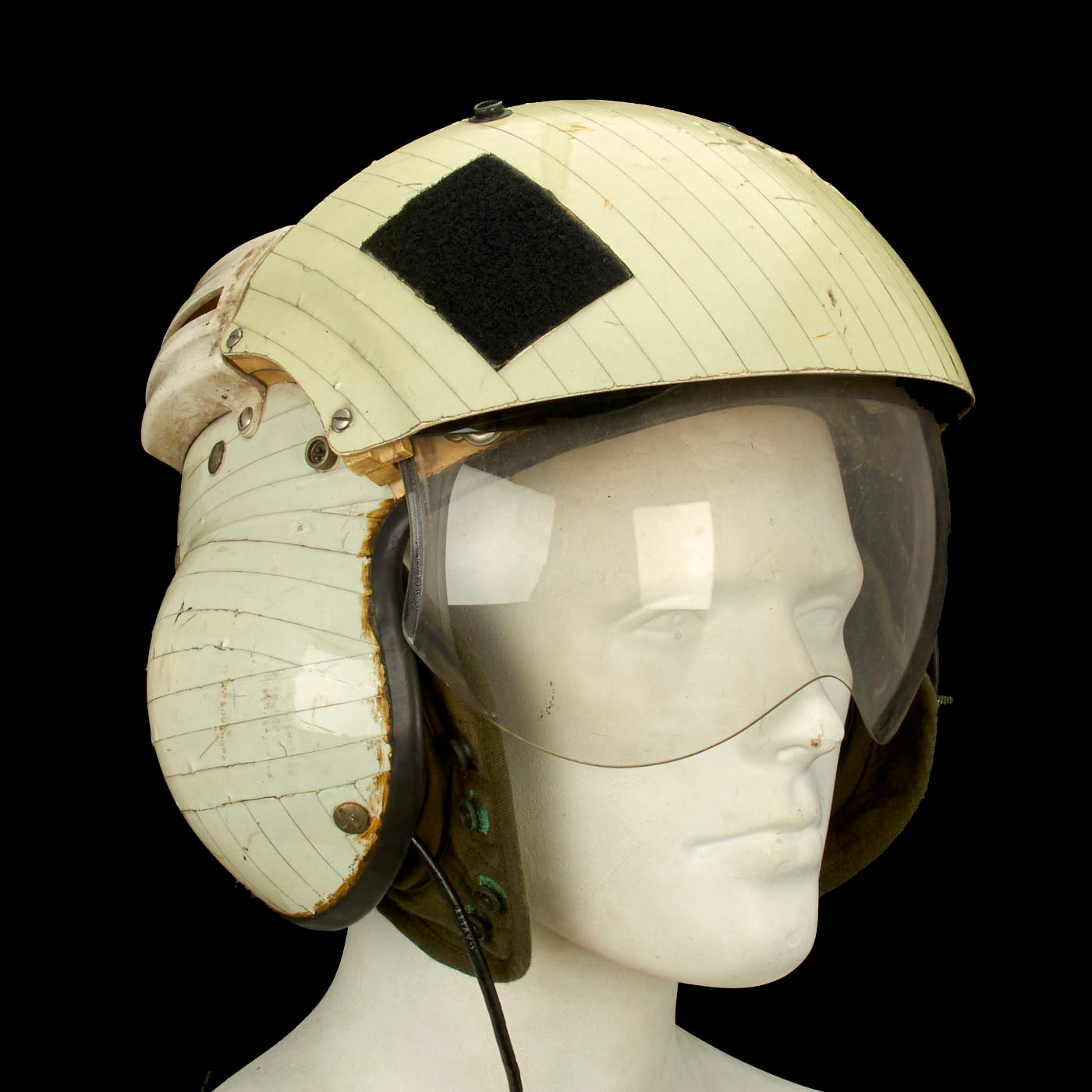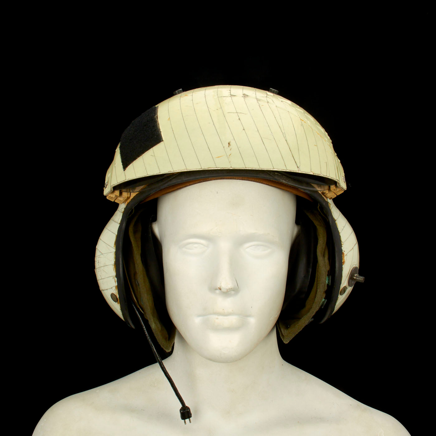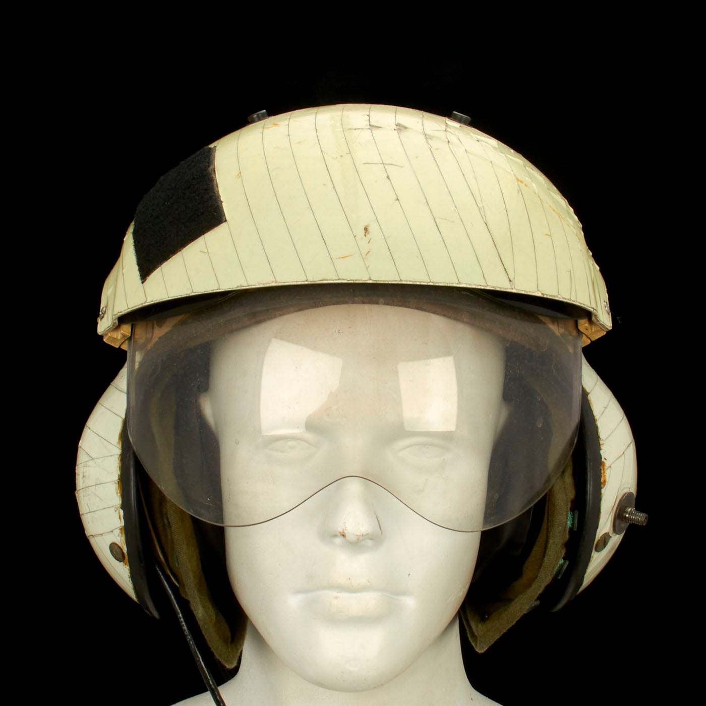 This is a United States Helicopter Flight Helmet type SPH-4 made by Gentex. This is an early version and features rare Rams Horn dual visors (one tint and one clear). The helmet is in overall very good condition with the liner, headset, visor, and both tinted and clear visors. The entire helmet has been covered up with white reflective tape. Electronic components besides ear muffs have been removed from the helmet, along with the chin strap. The helmet is a larger size.