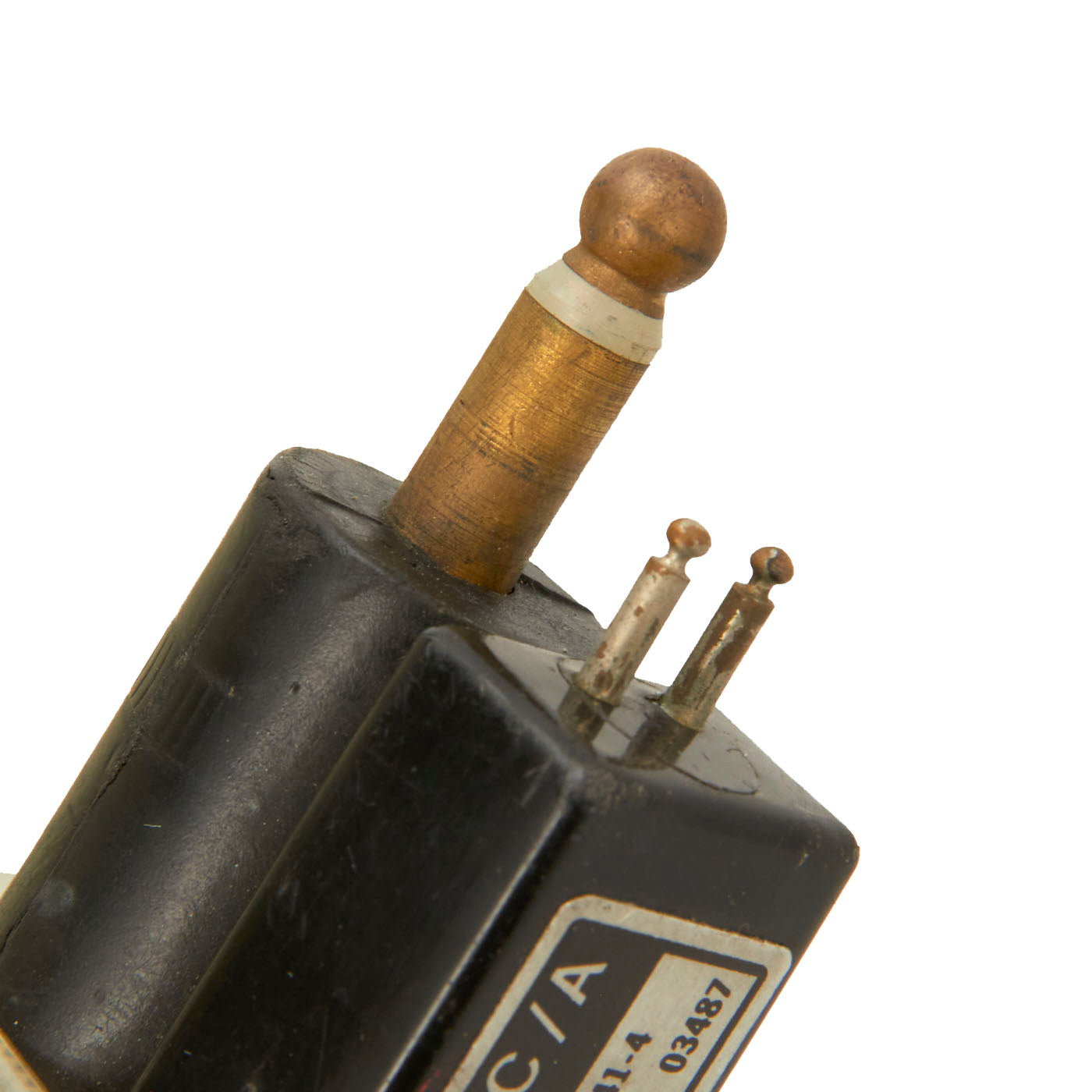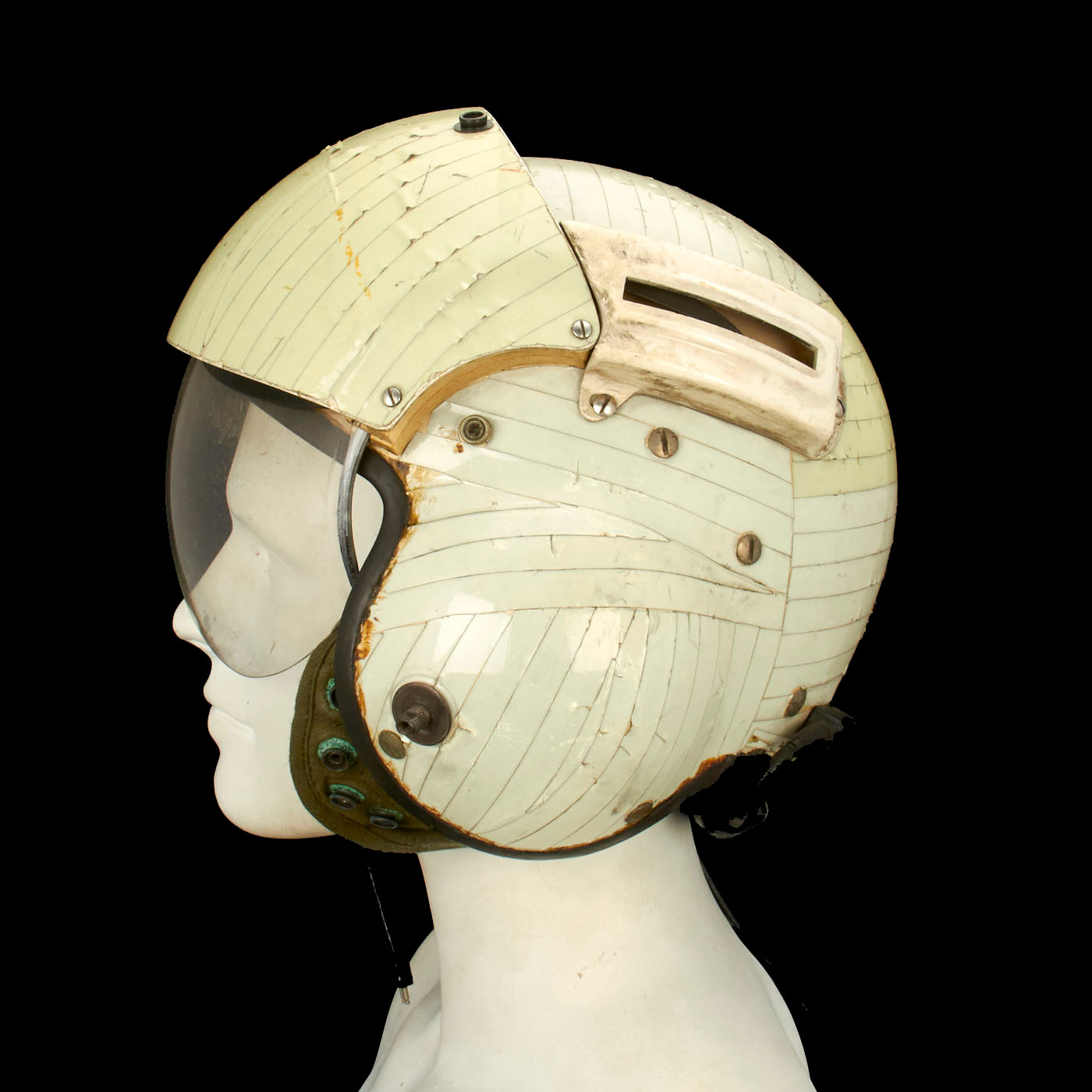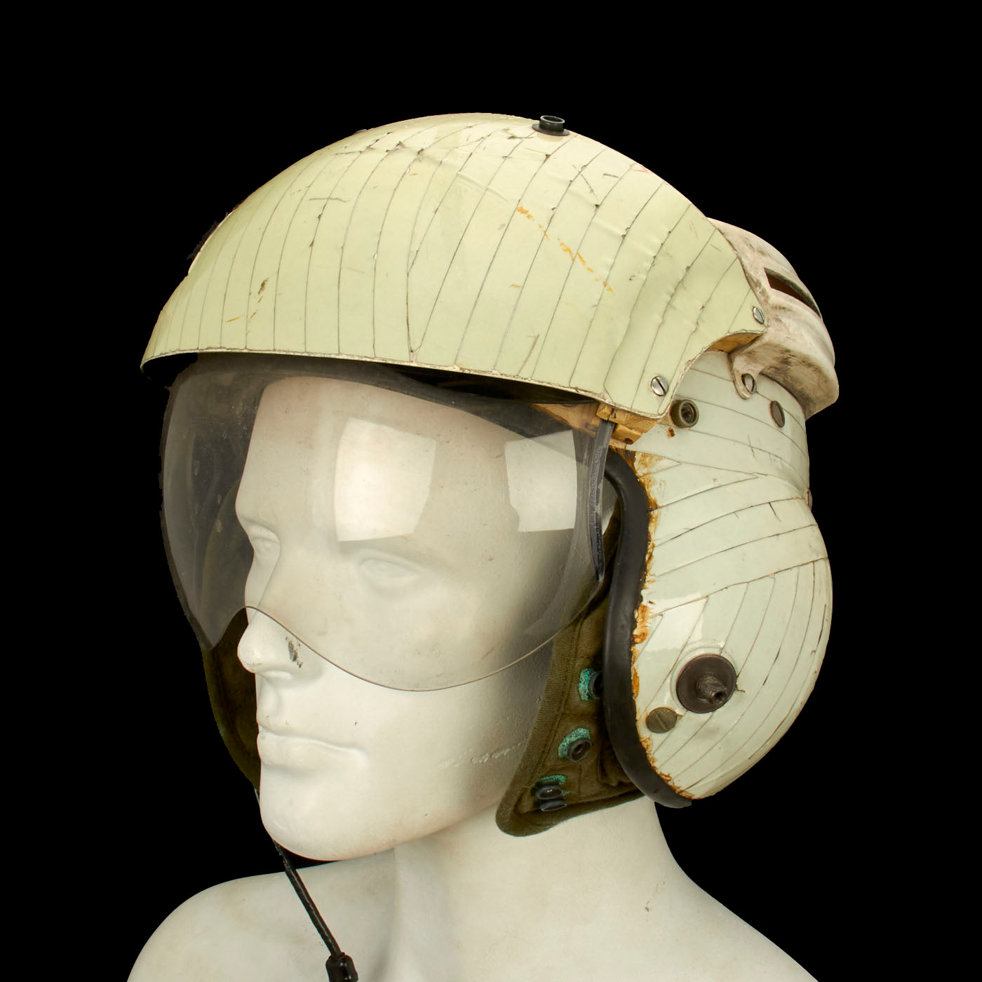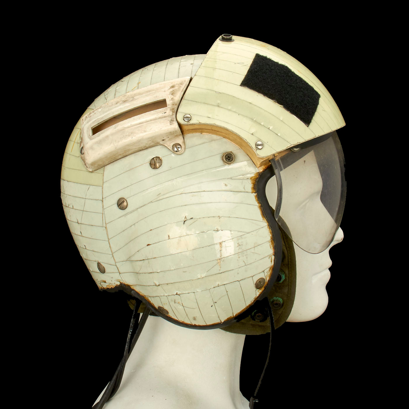 This is a United States Helicopter Flight Helmet type SPH-4 made by Gentex. This is an early version and features rare Rams Horn dual visors (one tint and one clear). The helmet is in overall very good condition with the liner, headset, visor, and both tinted and clear visors. The entire helmet has been covered up with white reflective tape. Electronic components besides ear muffs have been removed from the helmet, along with the chin strap. The helmet is a larger size.