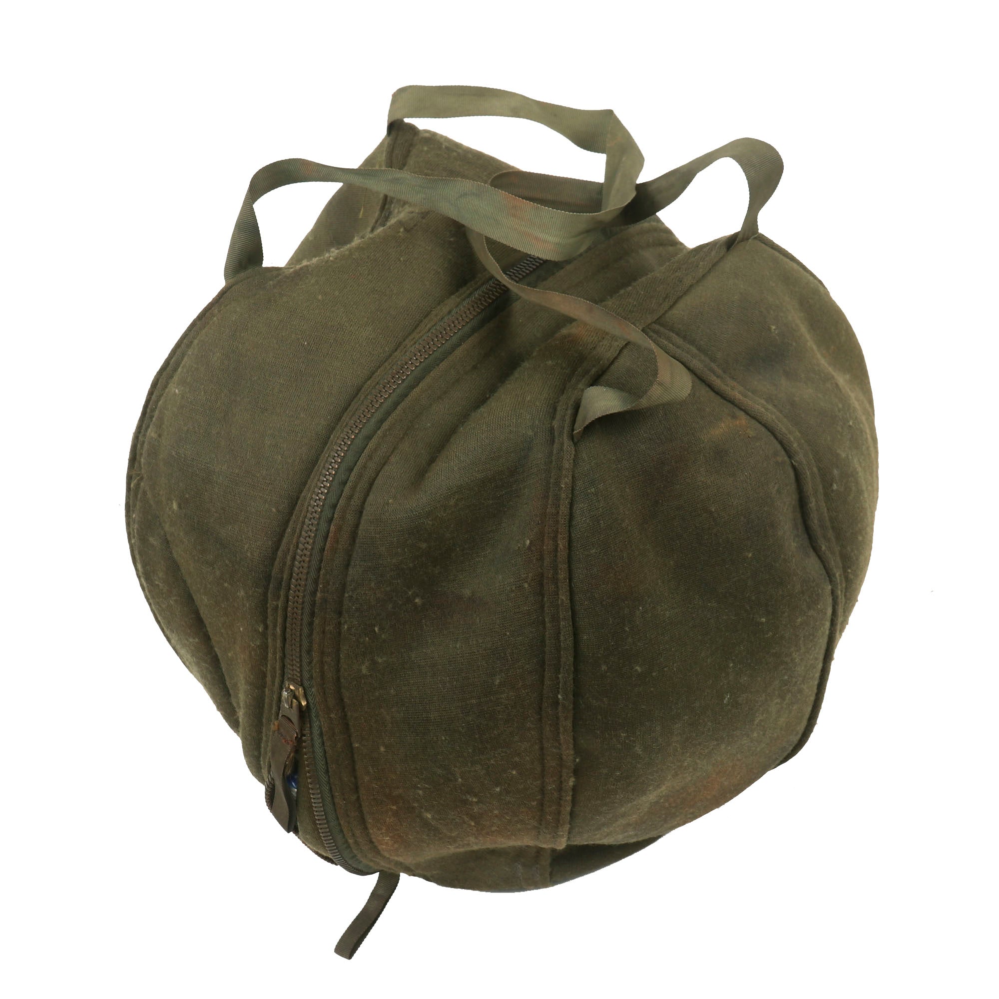 This dates the helmet to 1969. The included bowling ball style bag is in good shape with its straps retained, and the zipper functions well. There is a tag inside reading:
