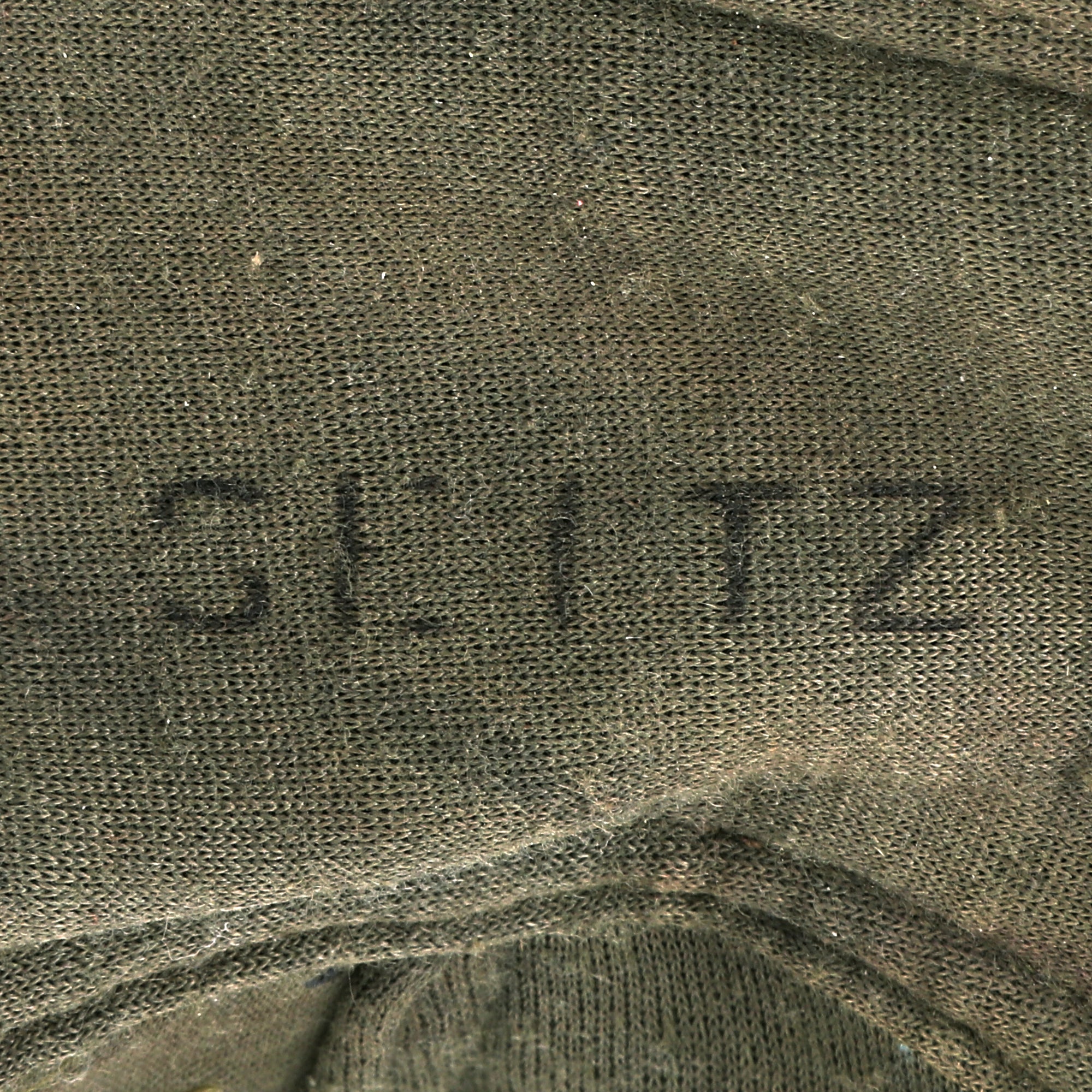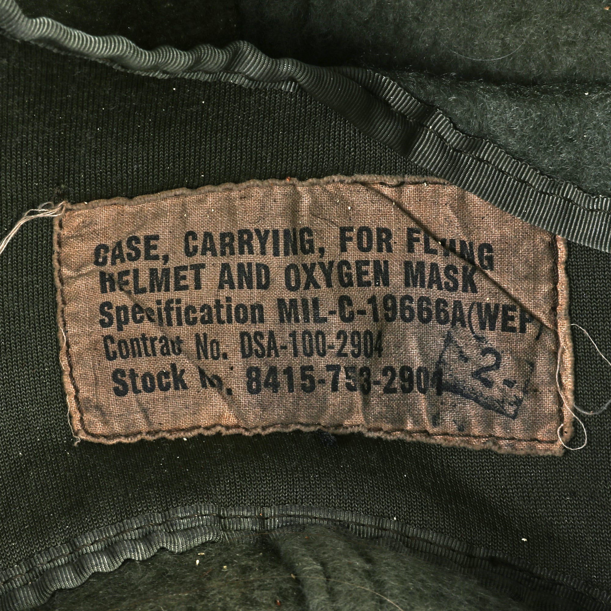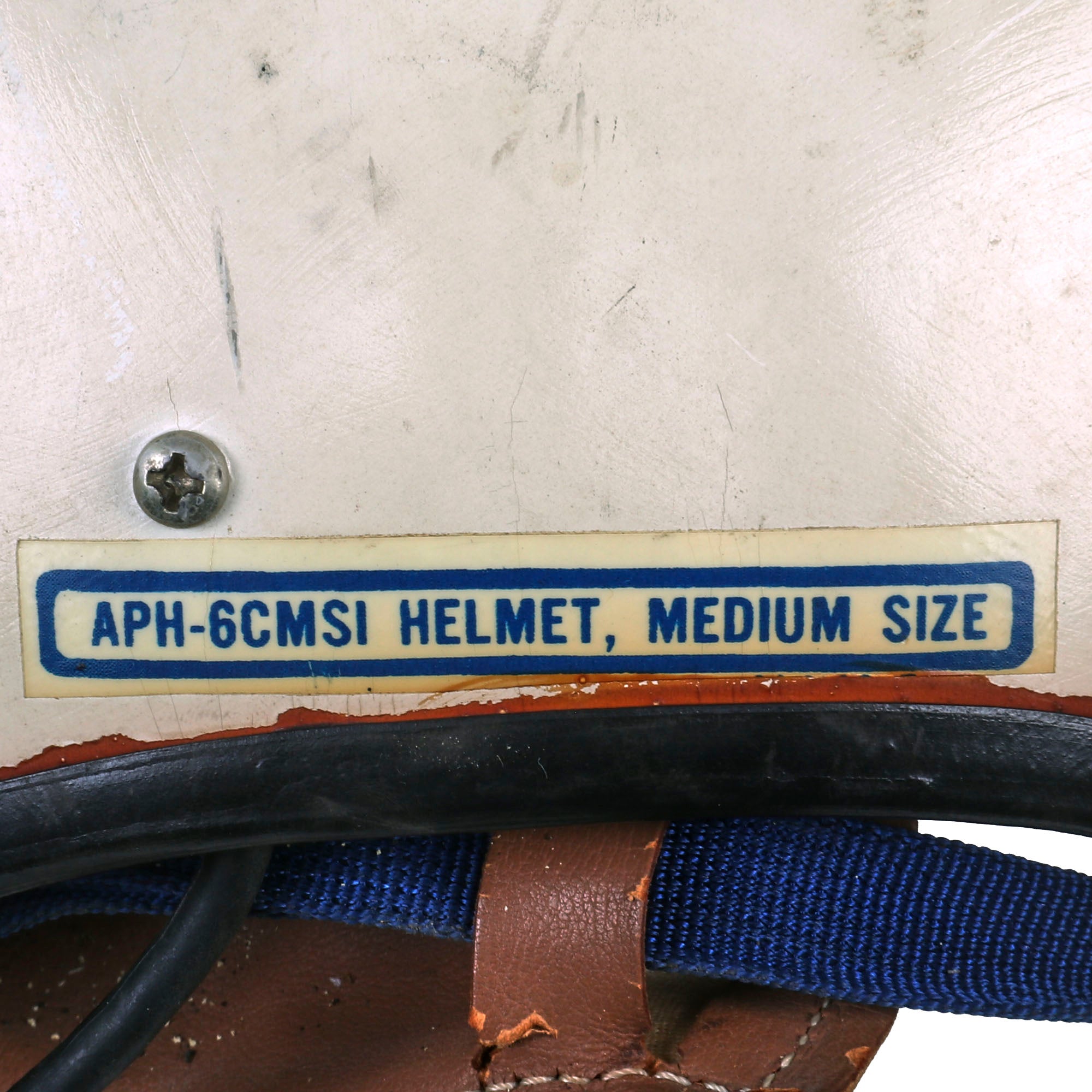 This example is a late version of the APH-6 series, the APH-6CMSI. Its shell is constructed of a polyester impregnated fiberglass cloth laminate and the visor shield/locking mechanism was the same as the APH-5’s later version as well as the internal liners and earphone fixation system. The APH-6 shell introduced the new and unique "Butterfly" retention and release assembly used to secure the oxygen mask. The back of the helmet has a tag reading: