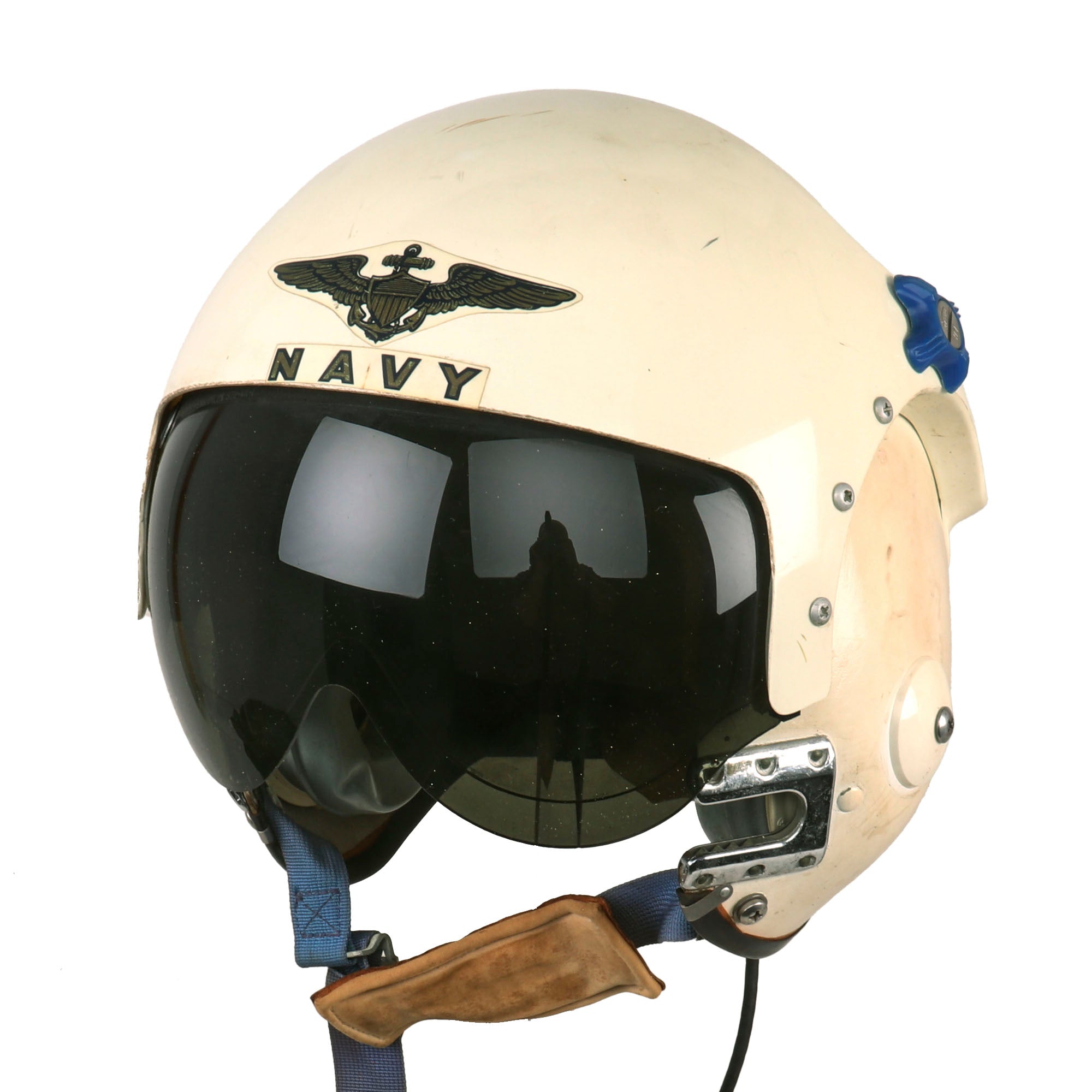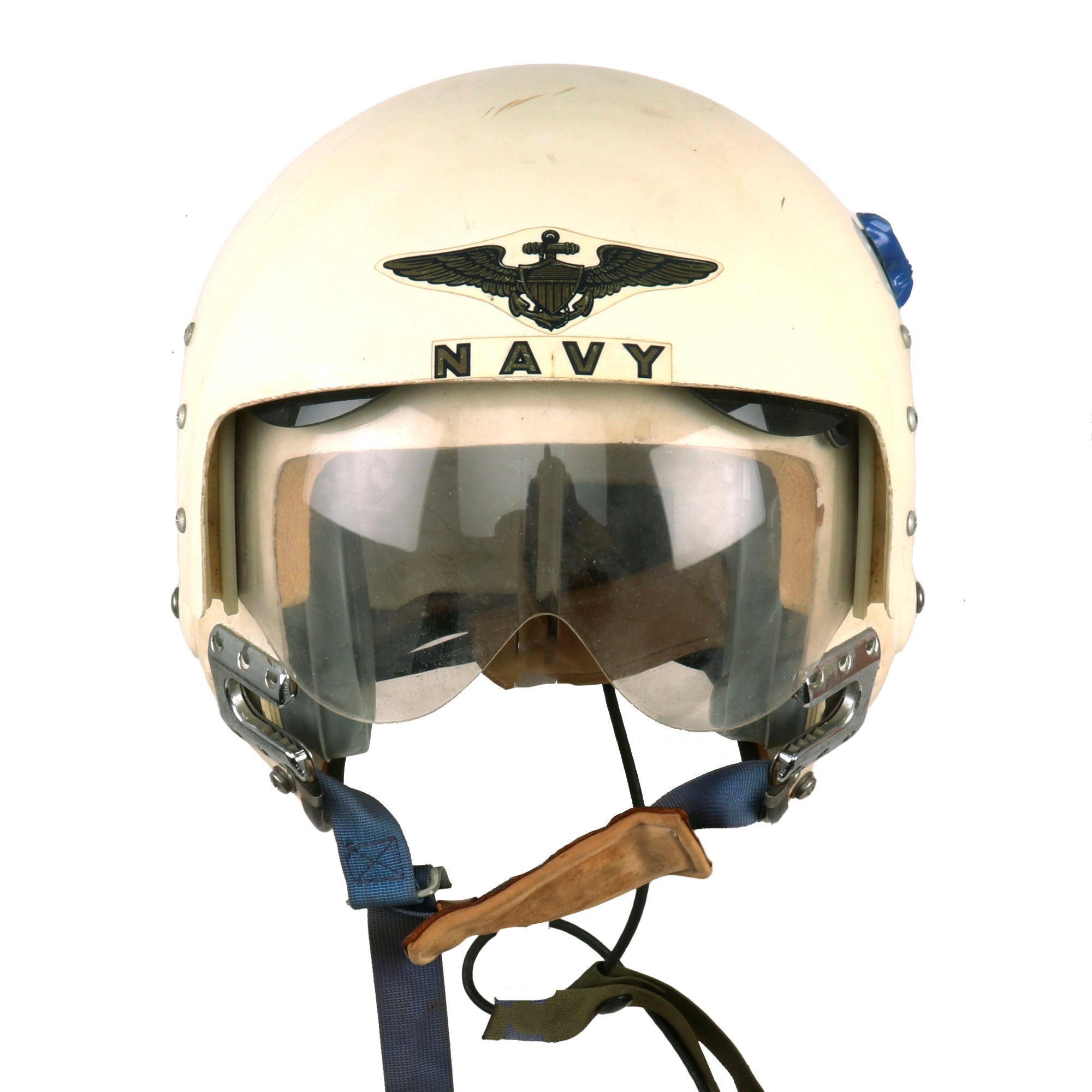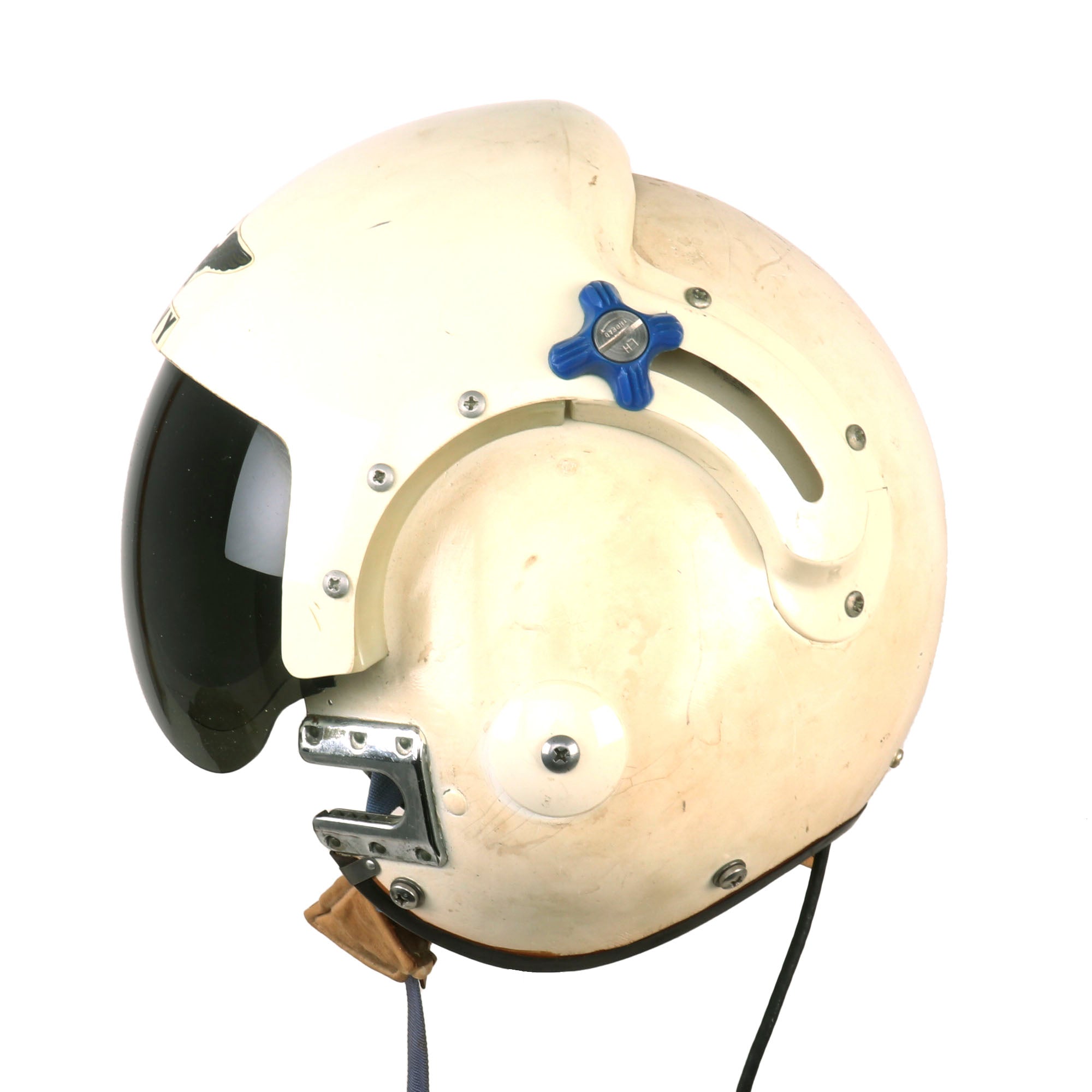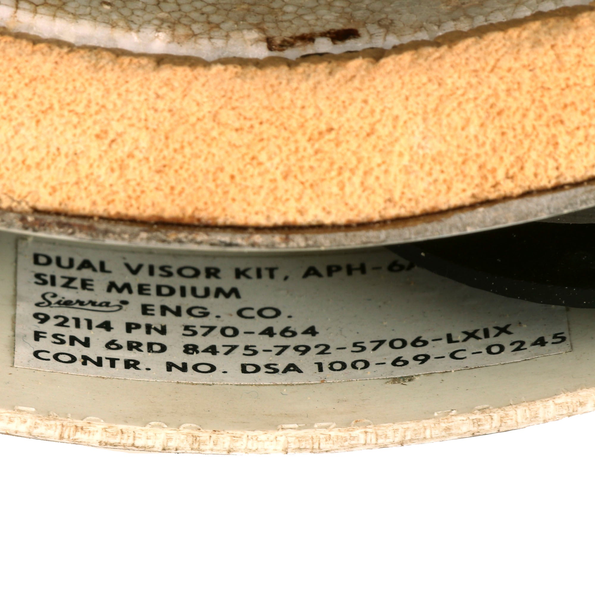 Original Item: Only One Available. At the end of the 50's the APH series helmets introduced a new generation of flight helmets characterized by the external visor covered with a protective shield. Improvement of the communication system, internal liner and oxygen mask retainers was also made and in some versions the dual dark and transparent visors system was installed. These types of helmets were the US Navy and USMC standard jet aircraft headgears during the 60's and throughout the 70's. In this period the first development of a flight helmet incorporating the Visual Target Acquisition System (VTAS I) was also made. Furthermore during the late 60's, flight tests were performed to verify the suitability of a full face "Clam Shell'' helmet designed to eliminate the oxygen mask and to give better protection during ejection.