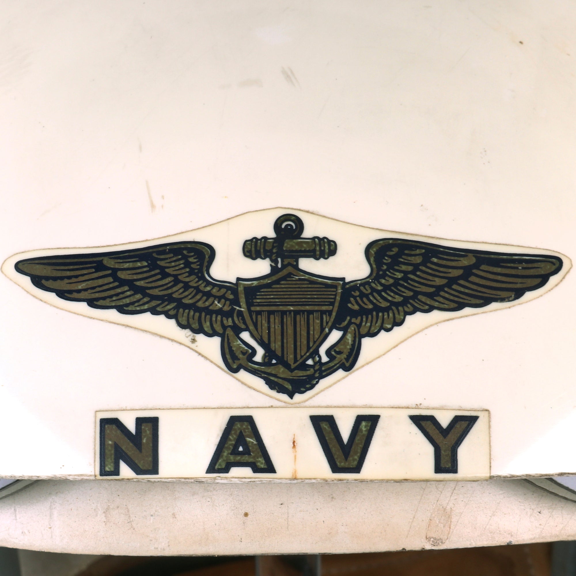 The shell is in good condition with much of the original paint. The shield cover features a beautiful set of Navy pilot wings with the word NAVY just below it. The helmet is in fair shape overall with the padding still intact. There is a data tag inside reading: