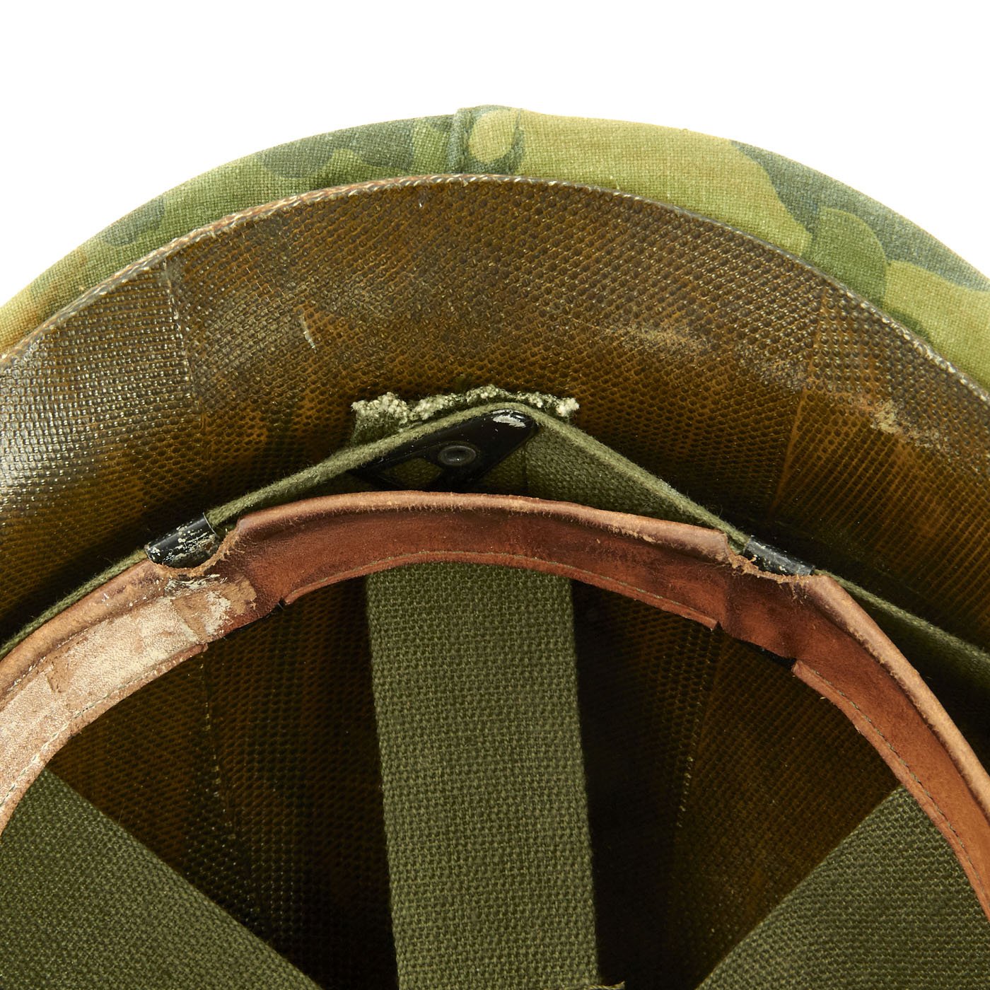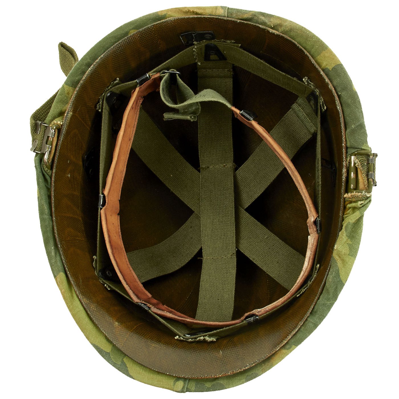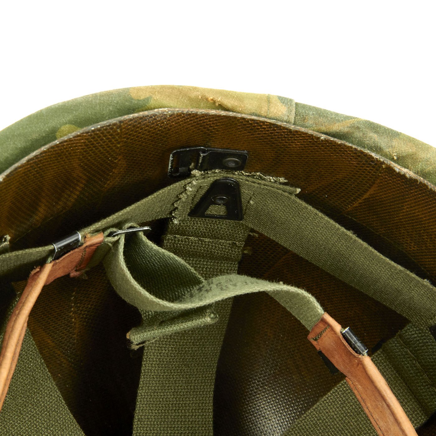 The liner is correct high pressure late 1960s issue liner, which features a simplified rigging without any lacing in the center. This allowed for a much sturdier design, adjustable via buckles at the ends of the three straps. The sweatband is good condition, and the rear is marked with the correct Vietnam Era stock numbers. The liner chin strap is unfortunately missing.