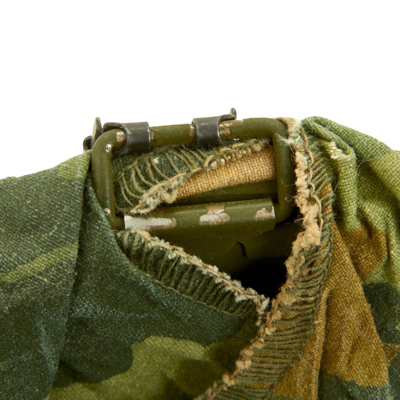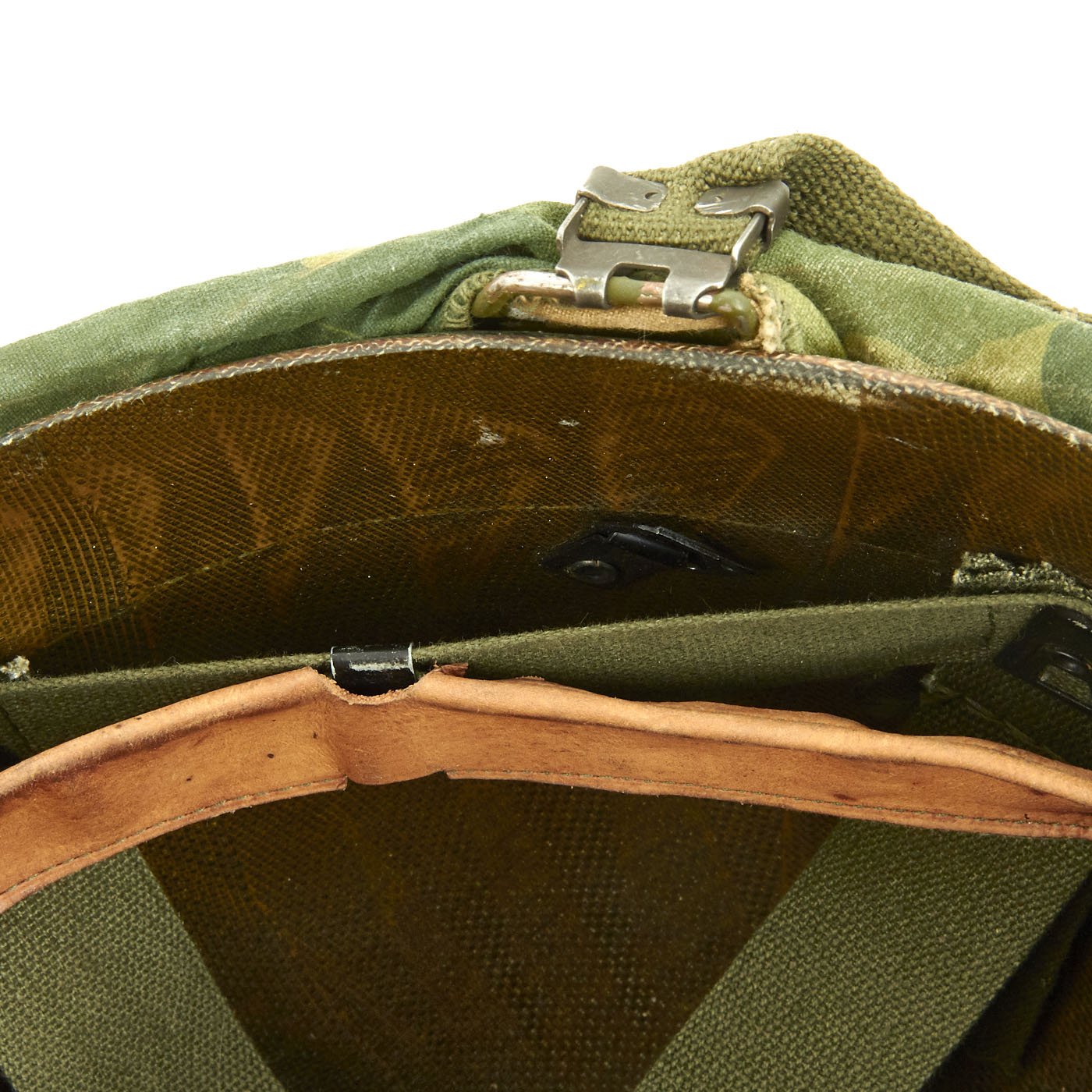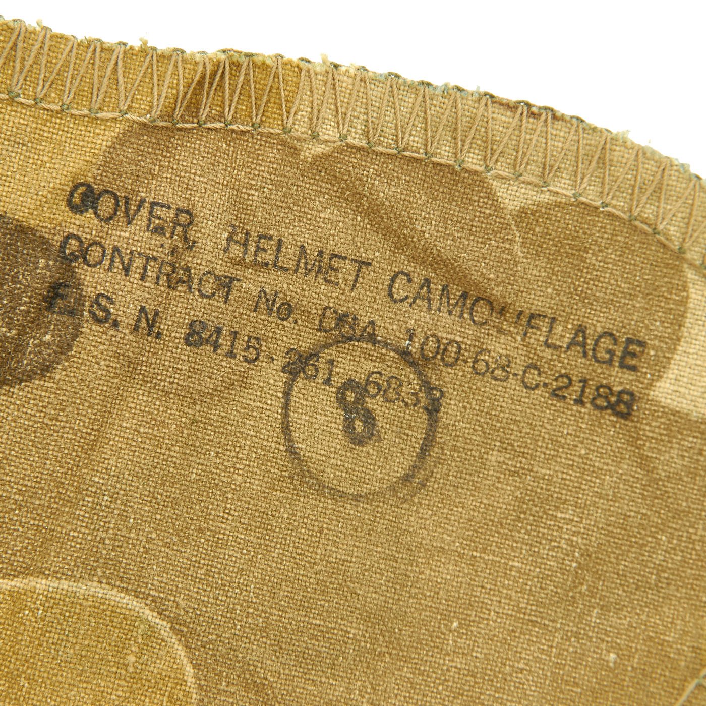 The liner is correct high pressure late 1960s issue liner, which features a simplified rigging without any lacing in the center. This allowed for a much sturdier design, adjustable via buckles at the ends of the three straps. The sweatband is good condition, and the rear is marked with the correct Vietnam Era stock numbers. The liner chin strap is unfortunately missing.